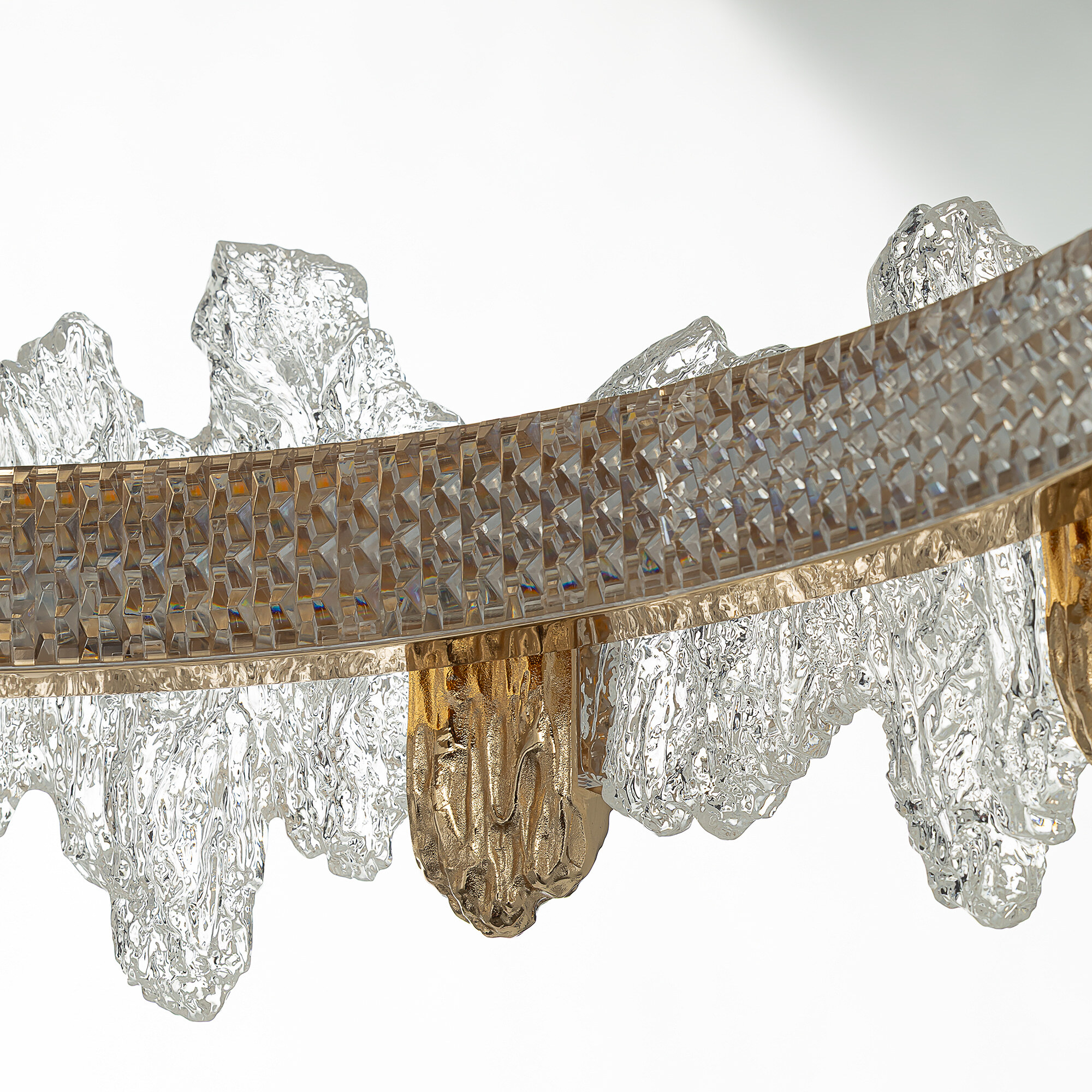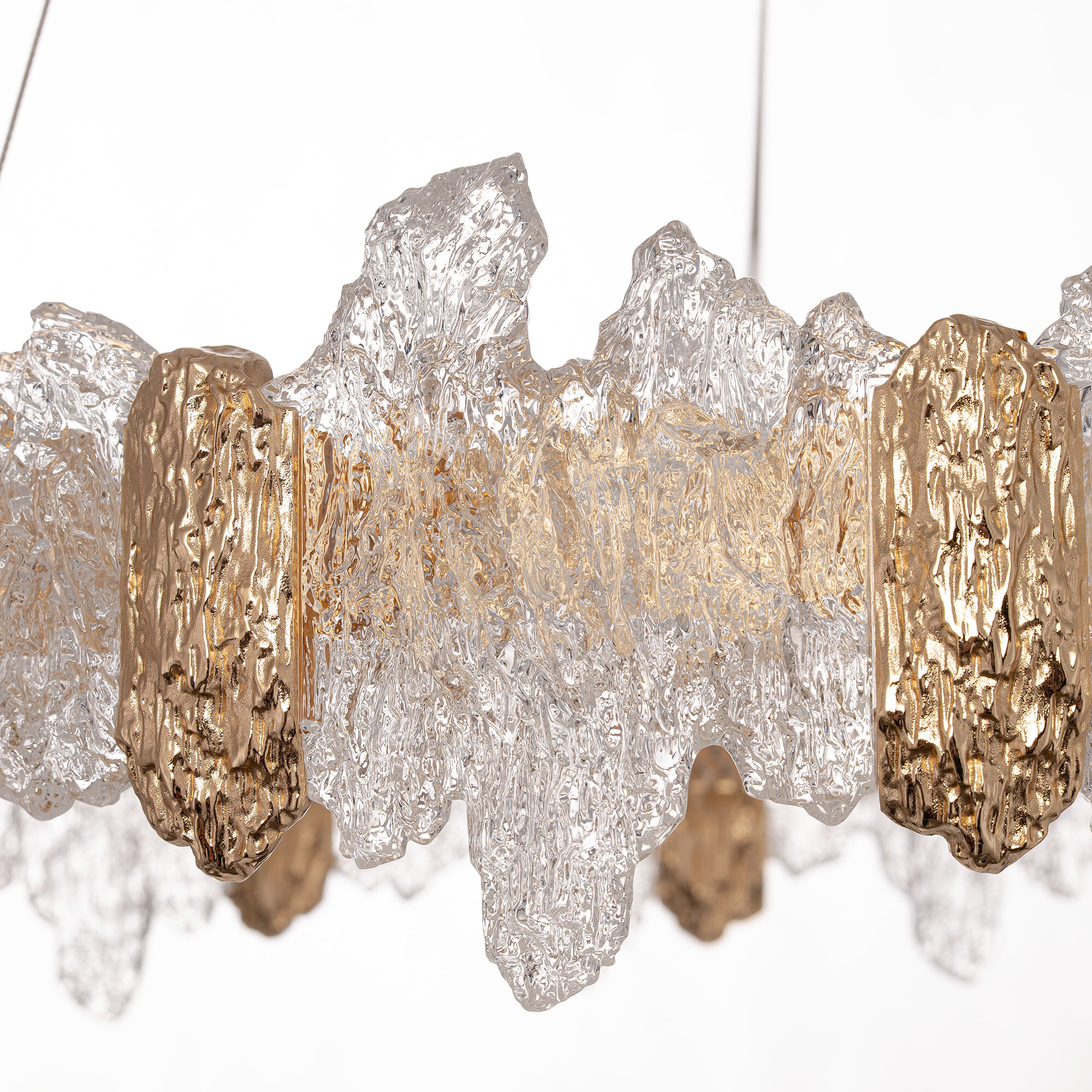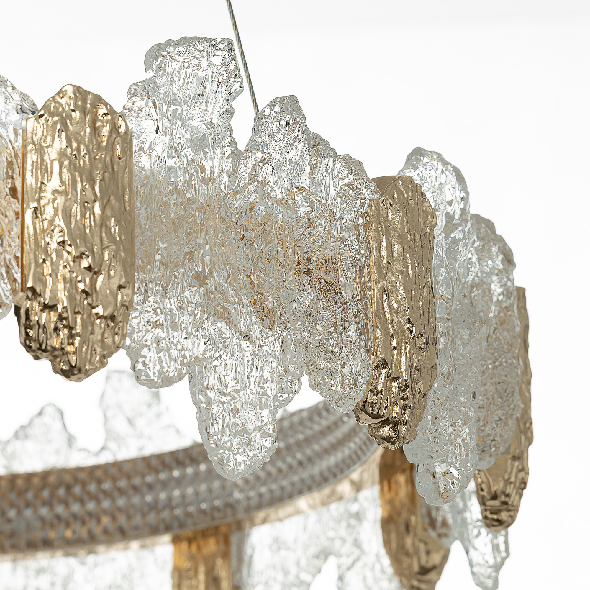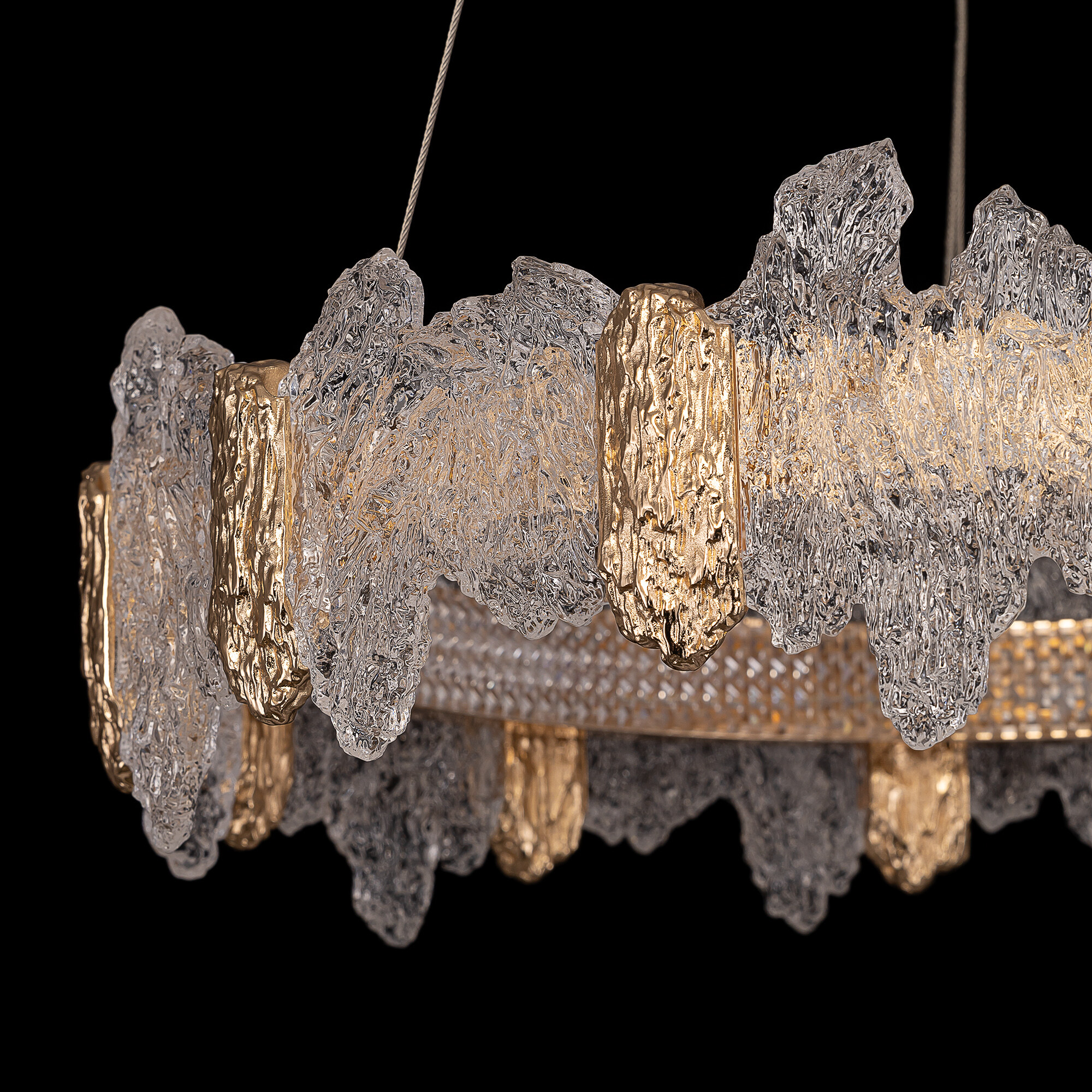 Каркас люстры — металлический, роскошного золотистого оттенка. Каскад из шести подвесных колец закреплен на тонких тросах, они будто парят в воздухе. Рассеиватель из оптического полимера имеет оригинальную форму, напоминающую потоки застывшей лавы. Люстра подойдет к любому типу потолка, включая натяжные конструкции, высоту подвесов можно легко изменить.