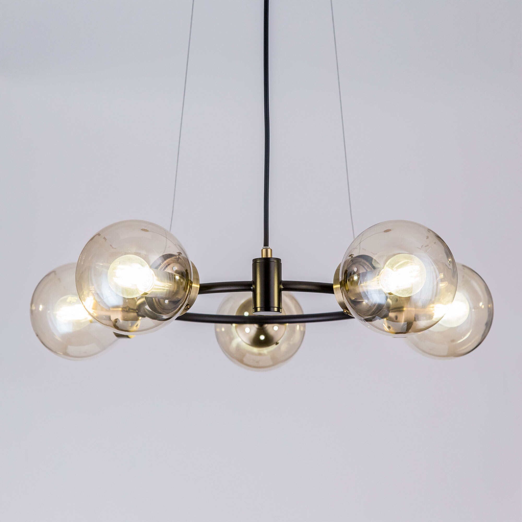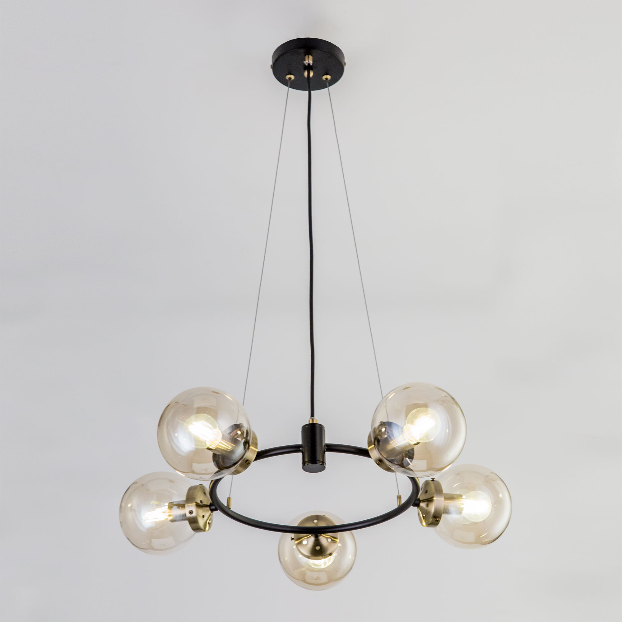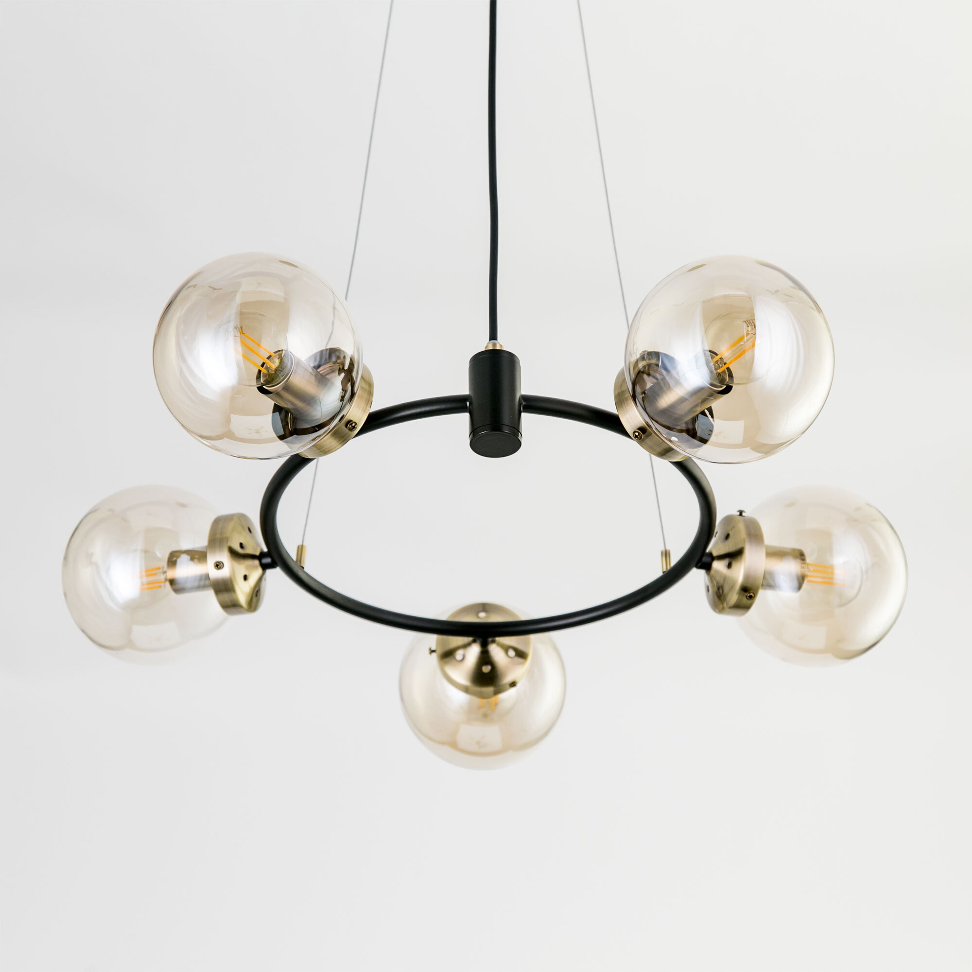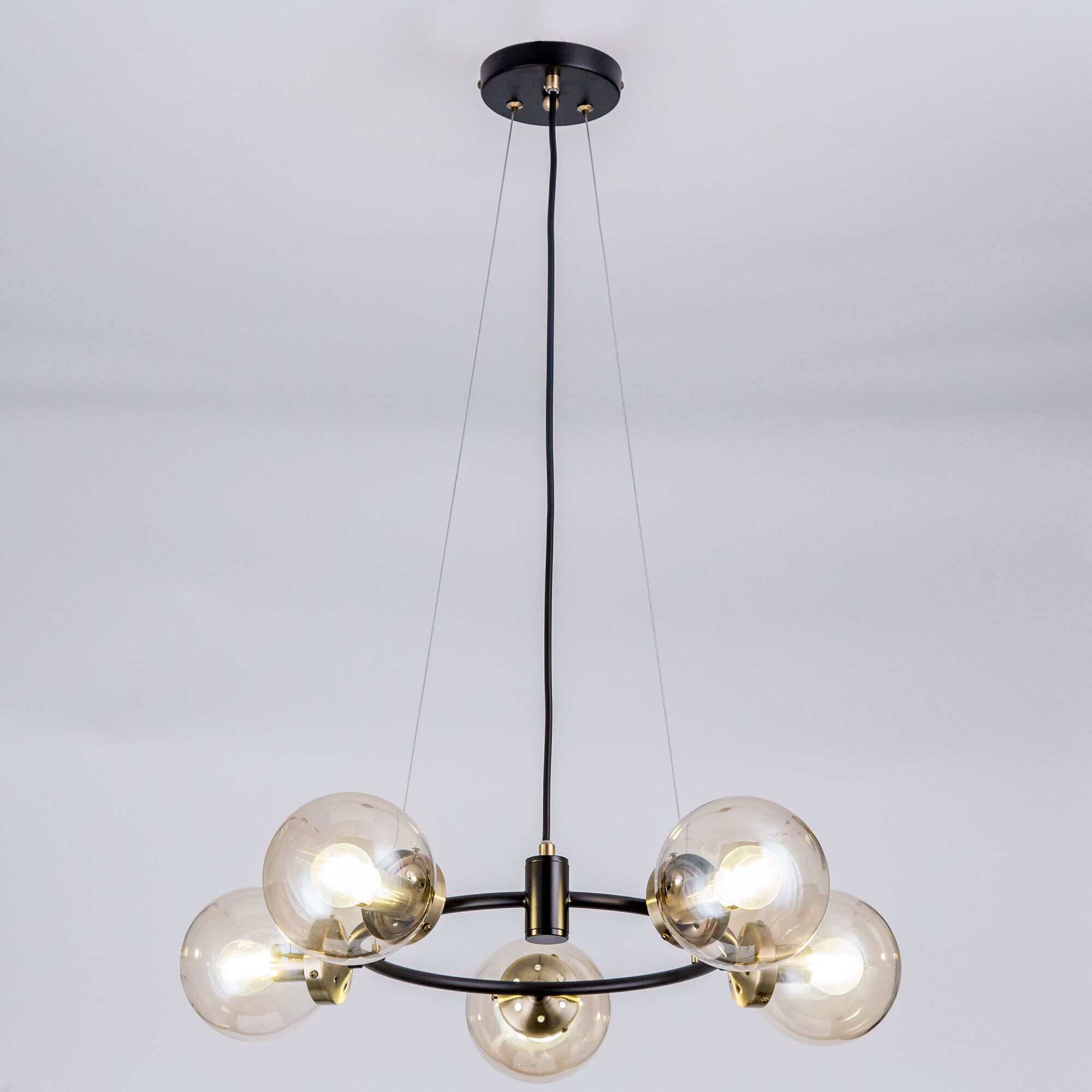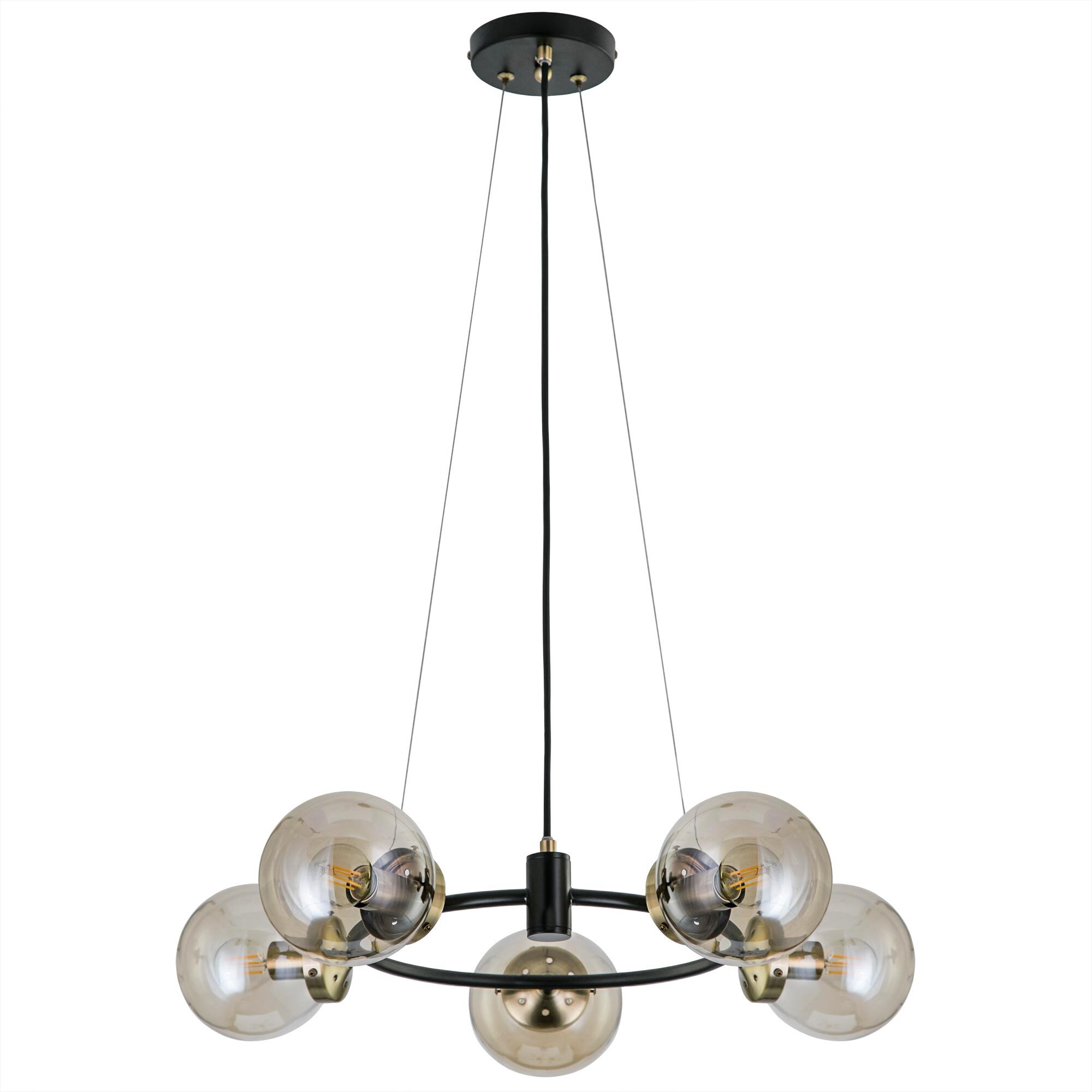 Подвесная люстра Citilux Планета CL105155 для модных интерьеров. Корпус металлический, в виде подвесного кольца, цвет – сочетание чёрного и бронзы. Плафоны в форме шара, изготовлены из прозрачного стекла светло-янтарного оттенка. В изделии используются 5 ламп с цоколем Е14, максимальной мощностью для ламп накаливания 20Вт. Рекомендуем устанавливать светодиодные филаментные лампы с прозрачной колбой. Высоту люстры можно отрегулировать в диапазоне от 20 до 80см. Модель рассчитана на работу как с одноклавишным, так и с двухклавишным выключателем. Подходит для всех типов потолков, в том числе натяжных, тип крепления – планка. Площадь освещения около 16м².Citilux CL105 PLANETA: Вдохновение в каждом луче.