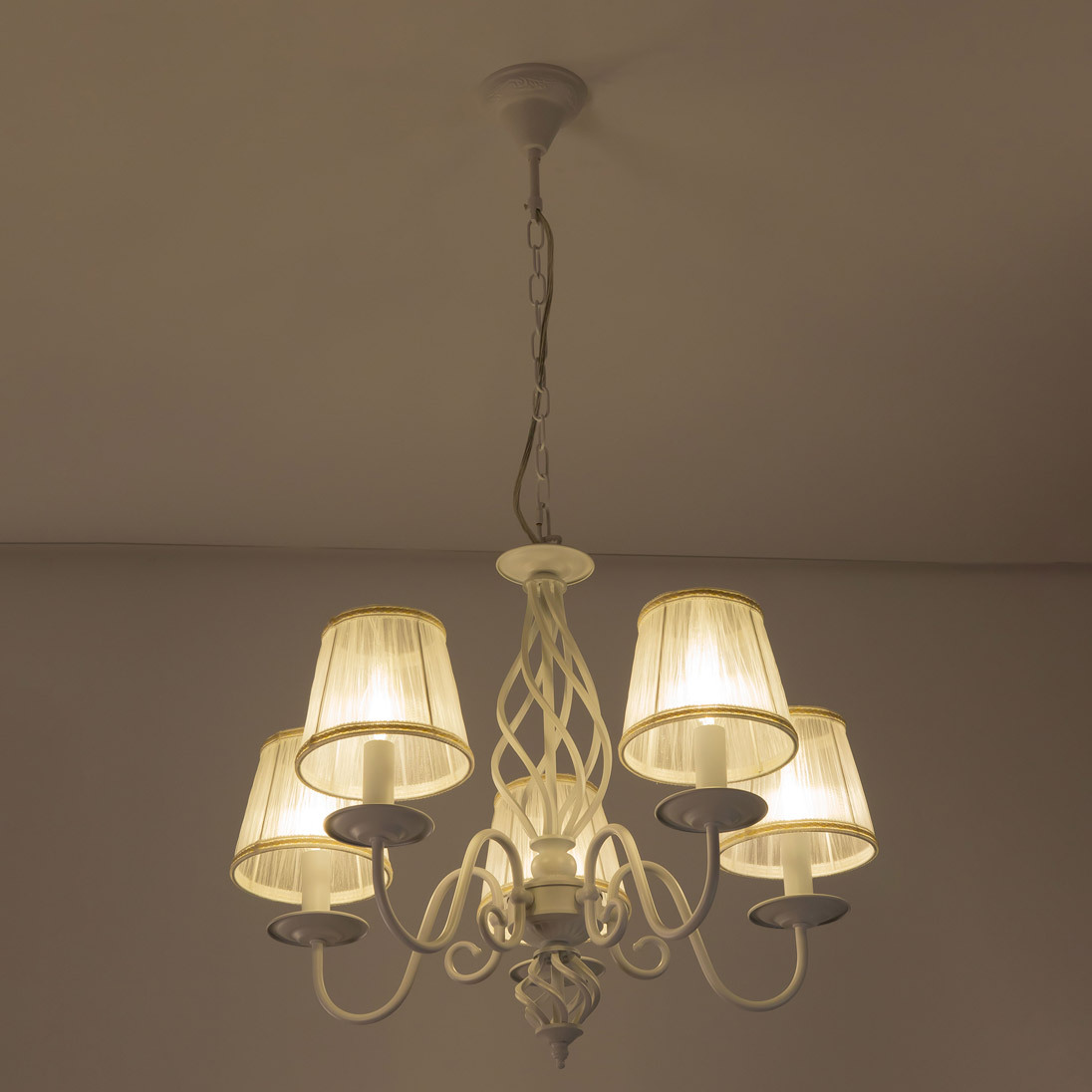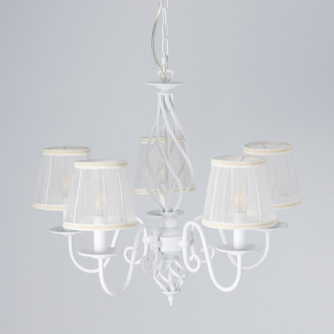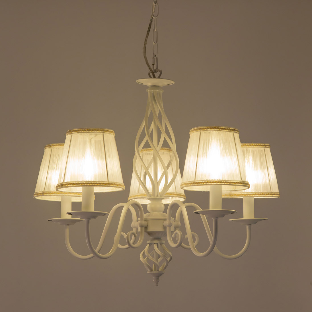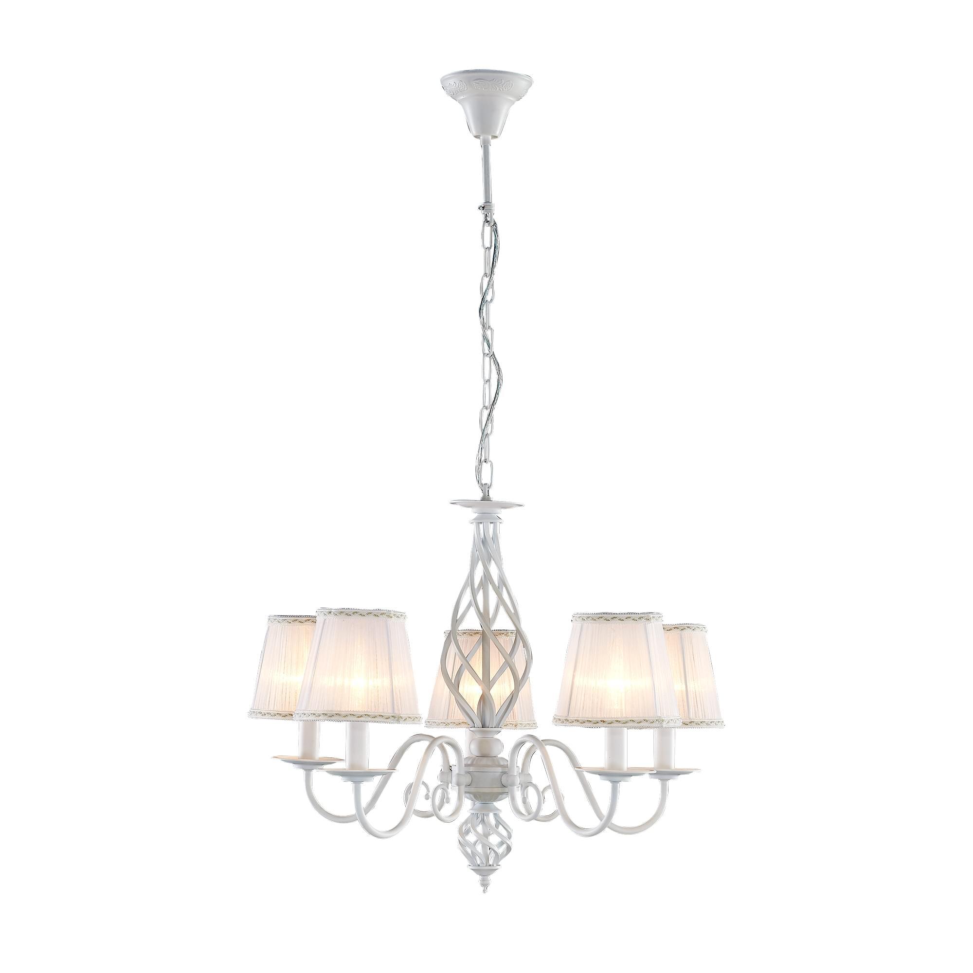 Люстры подвесные коллекции Ровена с завода с возможностью регулировки высоты монтажа. Это позволяет использовать их как в комнатах с высоким потолком, так и в низких помещениях. Минимальная высота с полностью убранной цепочкой составит всего 65 сантиметров, то есть на стандартный не высокий потолок данная модель подойдёт идеально. Серия одна из самых насыщенных с точки зрения модельного ряда. Люстру можно подобрать практически на любую площадь помещения и под любой цвет интерьера, так как модели производятся в двух цветовых решениях. Светильники отлично подойдут практически во все типы комнат, будь то гостиная, спальня или дача. Основание выполнено из прочного металла и окрашено в универсальный белый цвет. Центральная часть люстры украшена оригинальной винтажной фигурой, за счёт которой модель смотрится наполнено, пропорционально. В комплект входит пять белых тканевых абажура, которые сделают свет более мягким и рассеянным. От такого света не будут уставать глаза, также при нем очень уютно. Светлые оттенки светильника очень легко привязать практически к любому интерьеру, а цвет арматуры идеально будет сочетаться с белой мебелью или аналогичными элементами дизайна комнаты. Текстура абажура полупрозрачная, за счёт этого люстры очень яркие – площадь освещения до 16 квадратных метров. Патроны сделаны из качественного термостойкого материала, позволяющего использовать лампочки накаливания до 60 ватт включительно, энергосберегающие или светодиодные лампочки можно применять любой мощности.