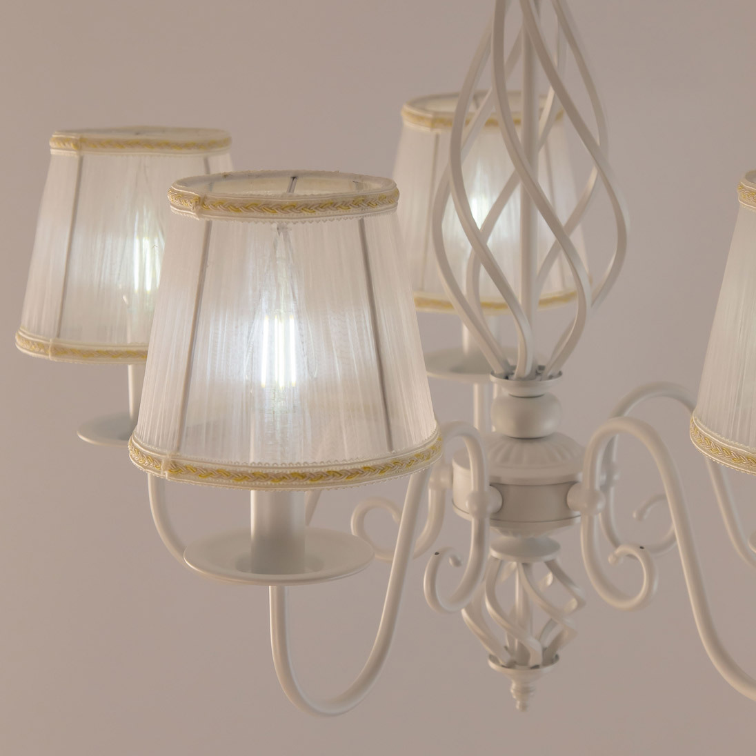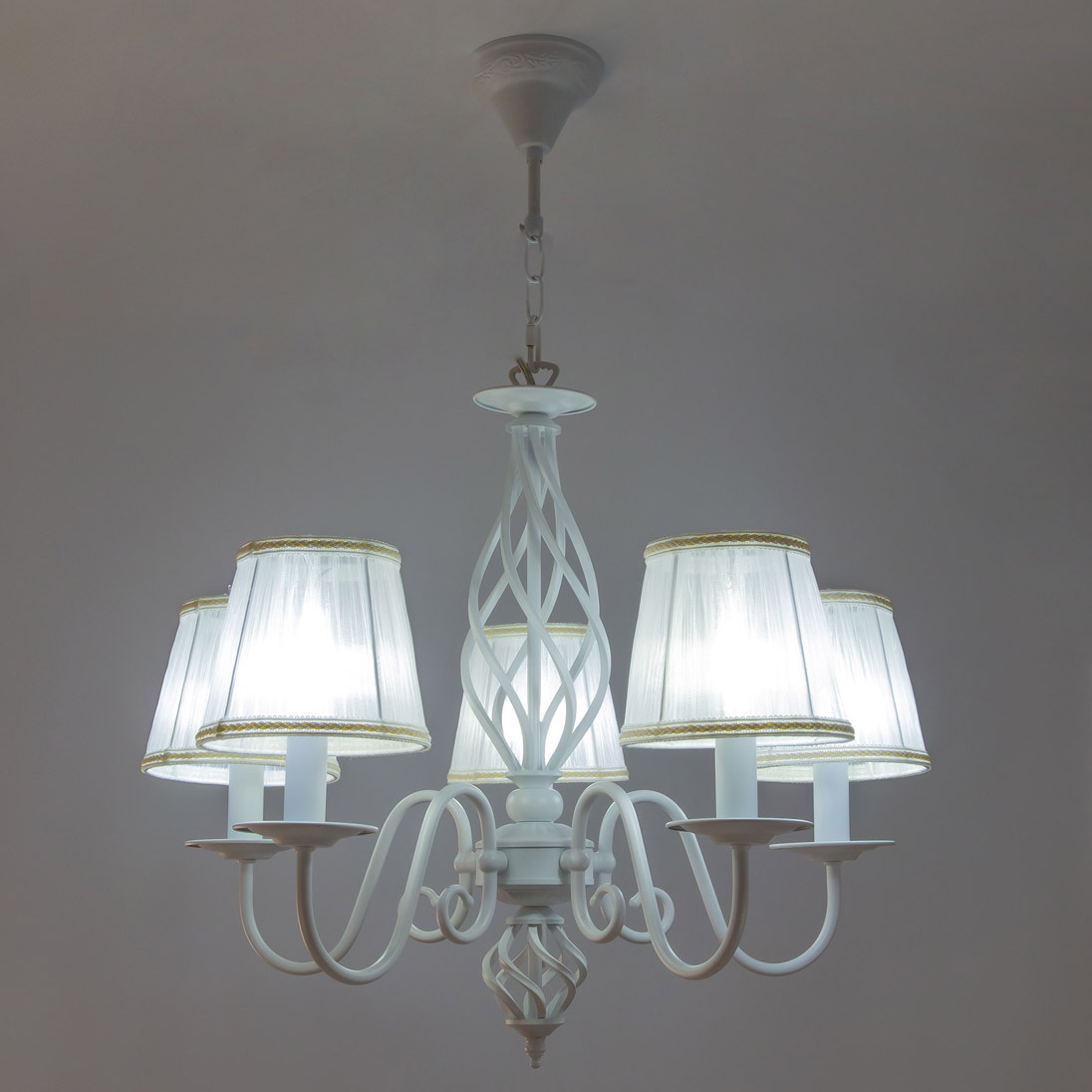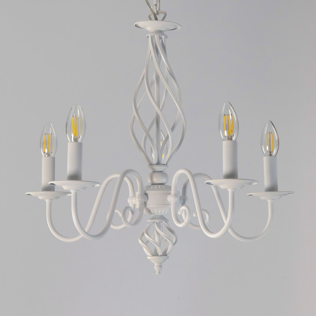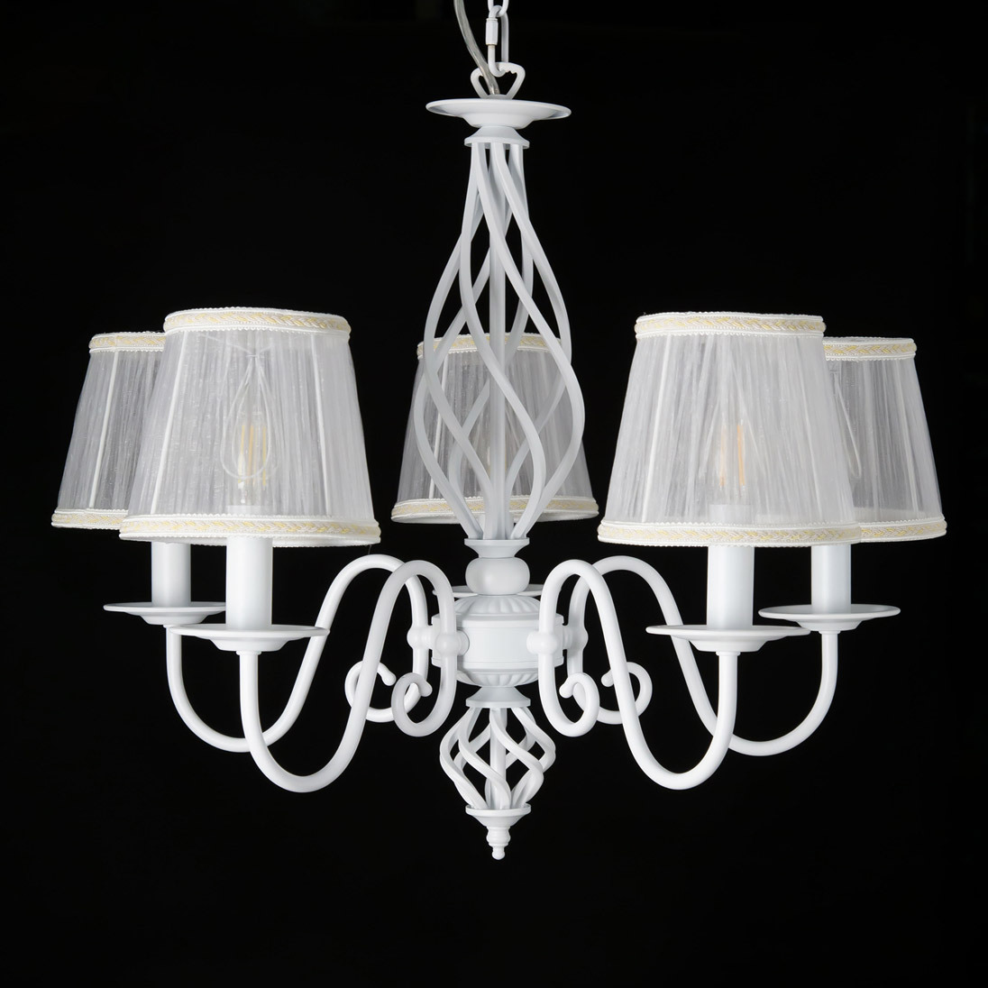 Люстры подвесные коллекции Ровена с завода с возможностью регулировки высоты монтажа. Это позволяет использовать их как в комнатах с высоким потолком, так и в низких помещениях. Минимальная высота с полностью убранной цепочкой составит всего 65 сантиметров, то есть на стандартный не высокий потолок данная модель подойдёт идеально. Серия одна из самых насыщенных с точки зрения модельного ряда. Люстру можно подобрать практически на любую площадь помещения и под любой цвет интерьера, так как модели производятся в двух цветовых решениях. Светильники отлично подойдут практически во все типы комнат, будь то гостиная, спальня или дача. Основание выполнено из прочного металла и окрашено в универсальный белый цвет. Центральная часть люстры украшена оригинальной винтажной фигурой, за счёт которой модель смотрится наполнено, пропорционально. В комплект входит пять белых тканевых абажура, которые сделают свет более мягким и рассеянным. От такого света не будут уставать глаза, также при нем очень уютно. Светлые оттенки светильника очень легко привязать практически к любому интерьеру, а цвет арматуры идеально будет сочетаться с белой мебелью или аналогичными элементами дизайна комнаты. Текстура абажура полупрозрачная, за счёт этого люстры очень яркие – площадь освещения до 16 квадратных метров. Патроны сделаны из качественного термостойкого материала, позволяющего использовать лампочки накаливания до 60 ватт включительно, энергосберегающие или светодиодные лампочки можно применять любой мощности.