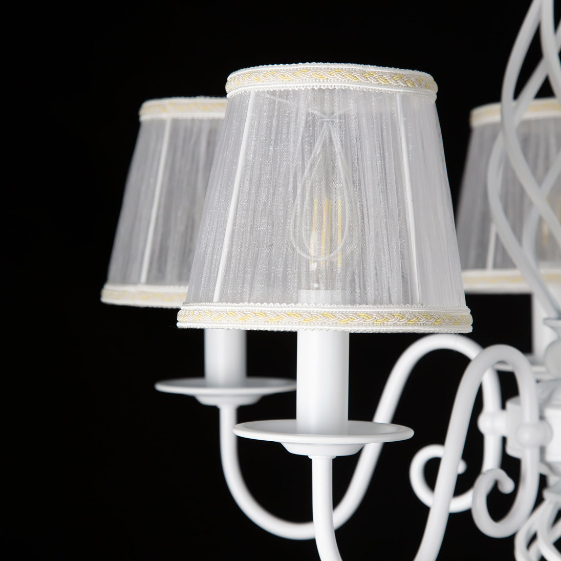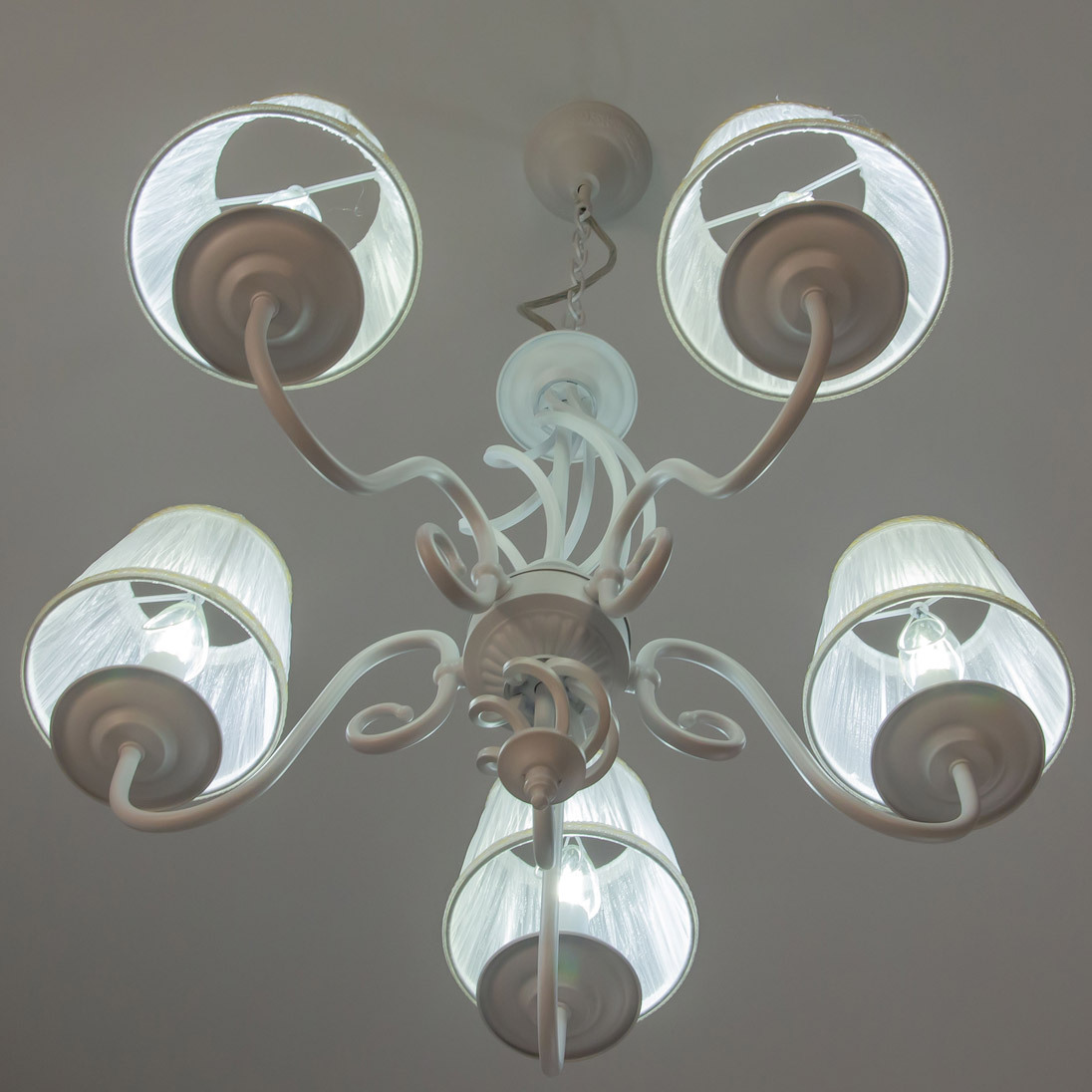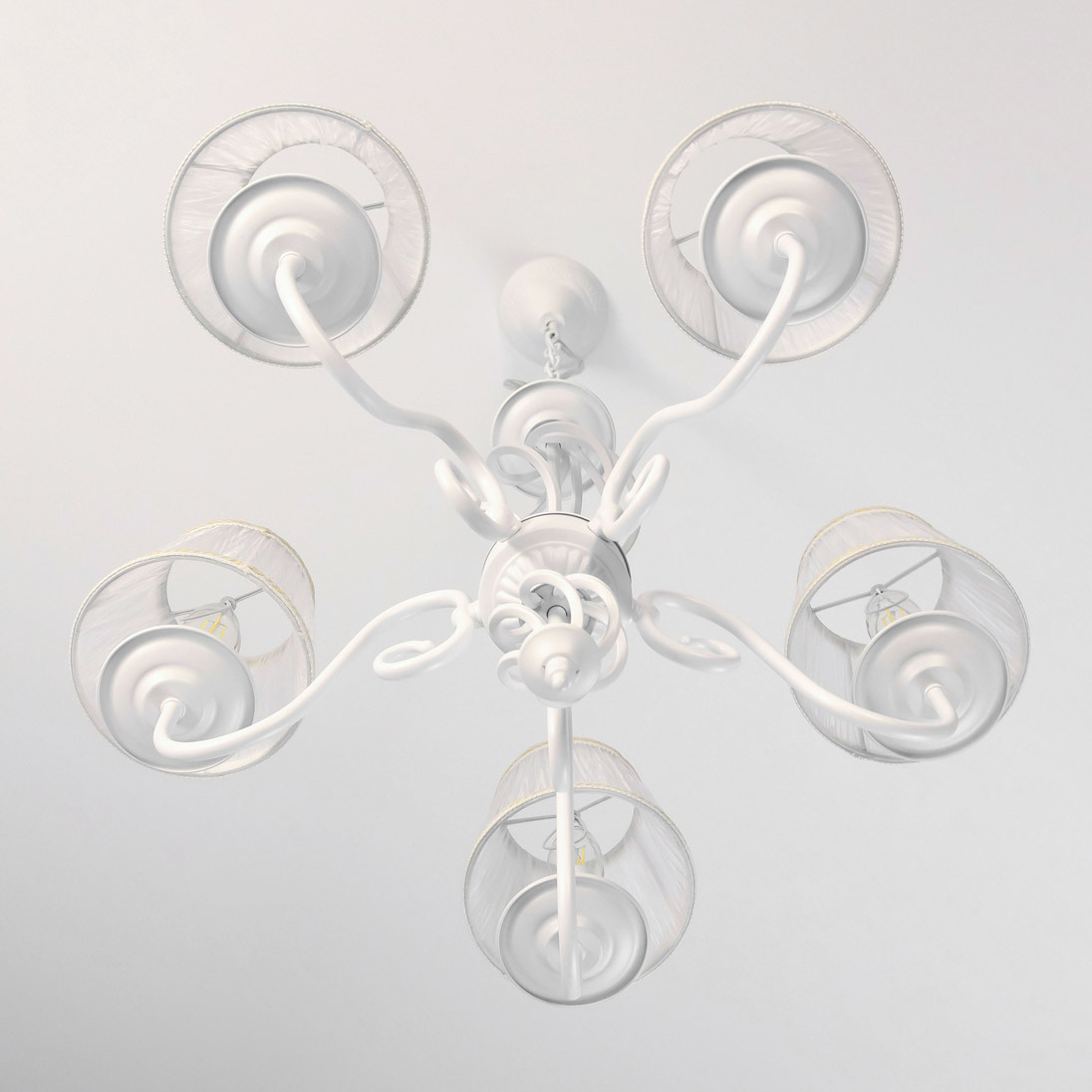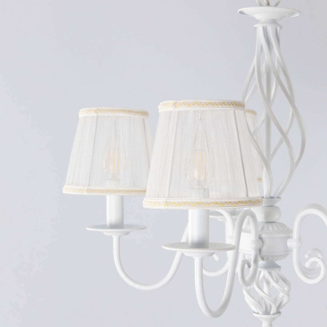 Люстры подвесные коллекции Ровена с завода с возможностью регулировки высоты монтажа. Это позволяет использовать их как в комнатах с высоким потолком, так и в низких помещениях. Минимальная высота с полностью убранной цепочкой составит всего 65 сантиметров, то есть на стандартный не высокий потолок данная модель подойдёт идеально. Серия одна из самых насыщенных с точки зрения модельного ряда. Люстру можно подобрать практически на любую площадь помещения и под любой цвет интерьера, так как модели производятся в двух цветовых решениях. Светильники отлично подойдут практически во все типы комнат, будь то гостиная, спальня или дача. Основание выполнено из прочного металла и окрашено в универсальный белый цвет. Центральная часть люстры украшена оригинальной винтажной фигурой, за счёт которой модель смотрится наполнено, пропорционально. В комплект входит пять белых тканевых абажура, которые сделают свет более мягким и рассеянным. От такого света не будут уставать глаза, также при нем очень уютно. Светлые оттенки светильника очень легко привязать практически к любому интерьеру, а цвет арматуры идеально будет сочетаться с белой мебелью или аналогичными элементами дизайна комнаты. Текстура абажура полупрозрачная, за счёт этого люстры очень яркие – площадь освещения до 16 квадратных метров. Патроны сделаны из качественного термостойкого материала, позволяющего использовать лампочки накаливания до 60 ватт включительно, энергосберегающие или светодиодные лампочки можно применять любой мощности.