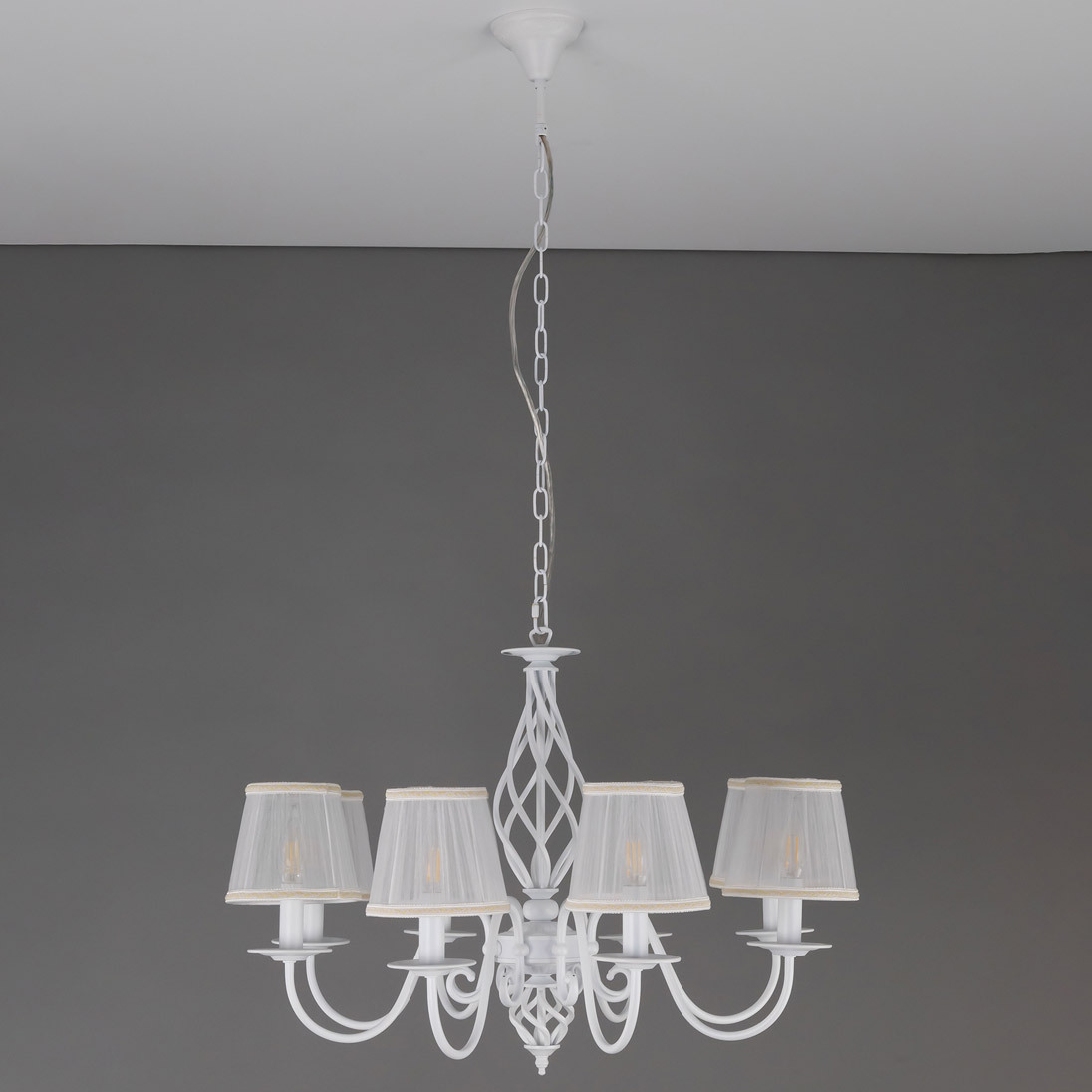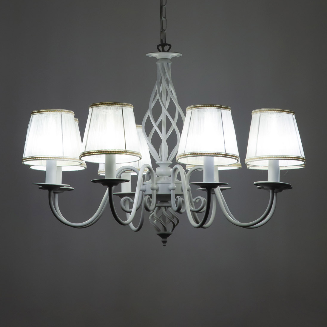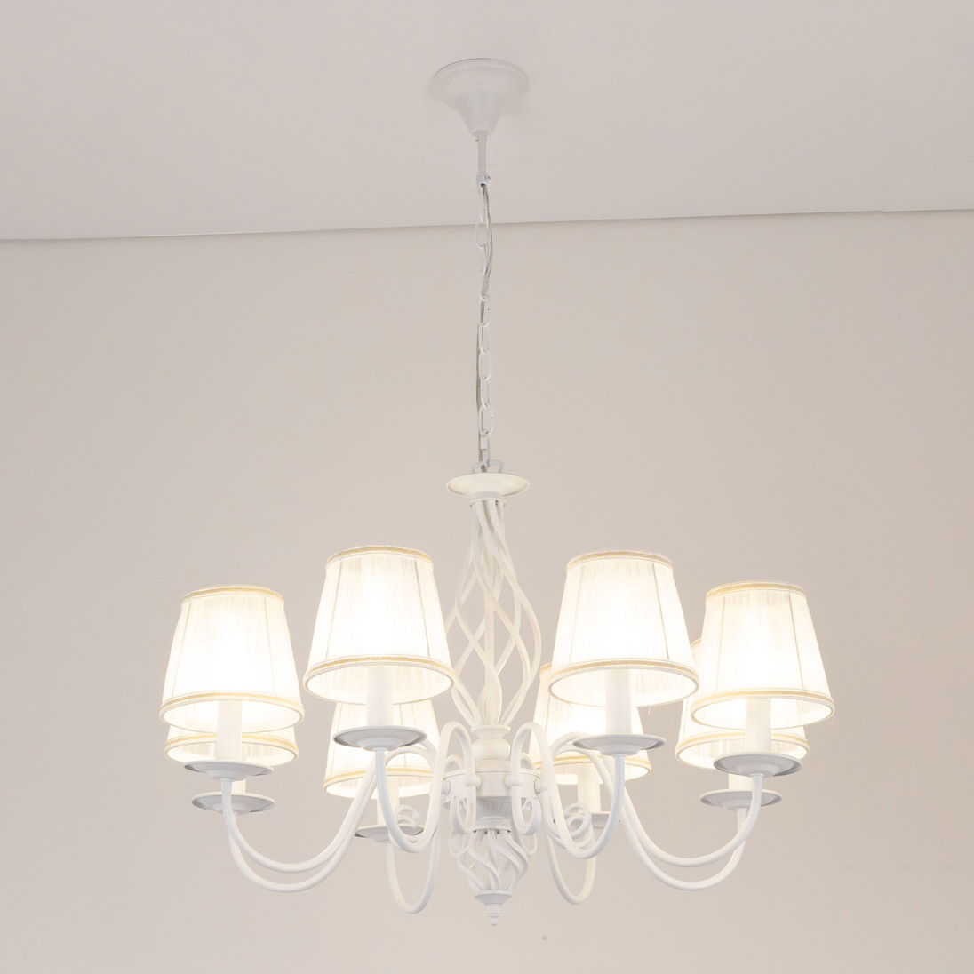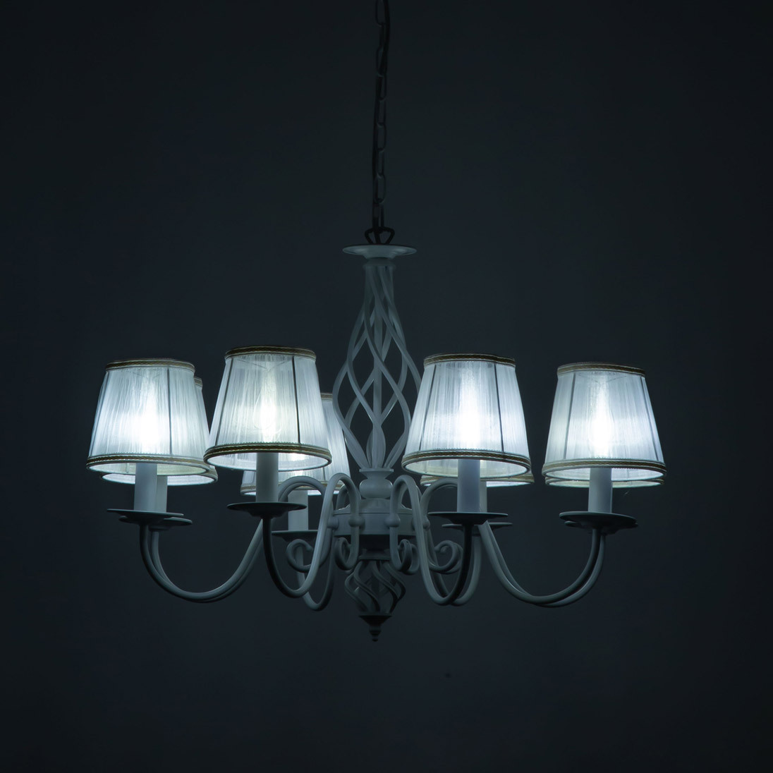 Люстры подвесные коллекции Ровена с завода с возможностью регулировки высоты монтажа. Это позволяет использовать их как в комнатах с высоким потолком, так и в низких помещениях. Минимальная высота с полностью убранной цепочкой составит всего 65 сантиметров, то есть на стандартный не высокий потолок данная модель подойдёт идеально. Серия одна из самых насыщенных с точки зрения модельного ряда. Люстру можно подобрать практически на любую площадь помещения и под любой цвет интерьера, так как модели производятся в двух цветовых решениях. Светильники отлично подойдут практически во все типы комнат, будь то гостиная, спальня или дача. Основание выполнено из прочного металла и окрашено в универсальный белый цвет. Покраска арматуры гальванизирована, что позволяет люстре не терять своих замечательных декоративный свойств даже при частой влажной уборке. Центральная часть светильника украшена оригинальной винтажной фигурой, за счёт которой люстра смотрится наполнено, пропорционально. Диаметр люстры 79 сантиметров, что делает её арт объектом в вашей комнате, светильник не потеряется по размеру даже на очень высоком потолке при площади помещения более 20 метров квадратных. В комплект входит восемь белых тканевых абажура, которые сделают свет более мягким и рассеянным. От такого света не будут уставать глаза, также при нем очень уютно. Светлые оттенки светильника очень легко привязать практически к любому интерьеру, а цвет арматуры идеально будет сочетаться с белой мебелью или аналогичными элементами дизайна комнаты. Текстура абажура полупрозрачная, за счёт этого люстры очень яркие – площадь освещения до 22 квадратных метров. Патроны сделаны из качественного термостойкого материала, позволяющего использовать лампочки накаливания до 60 ватт включительно, энергосберегающие или светодиодные лампочки можно применять любой мощности.