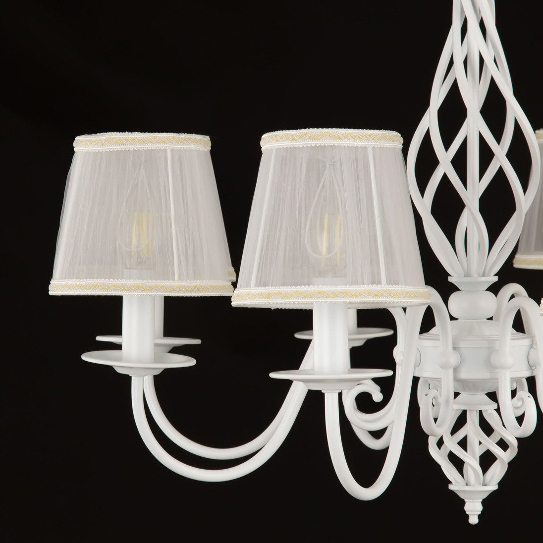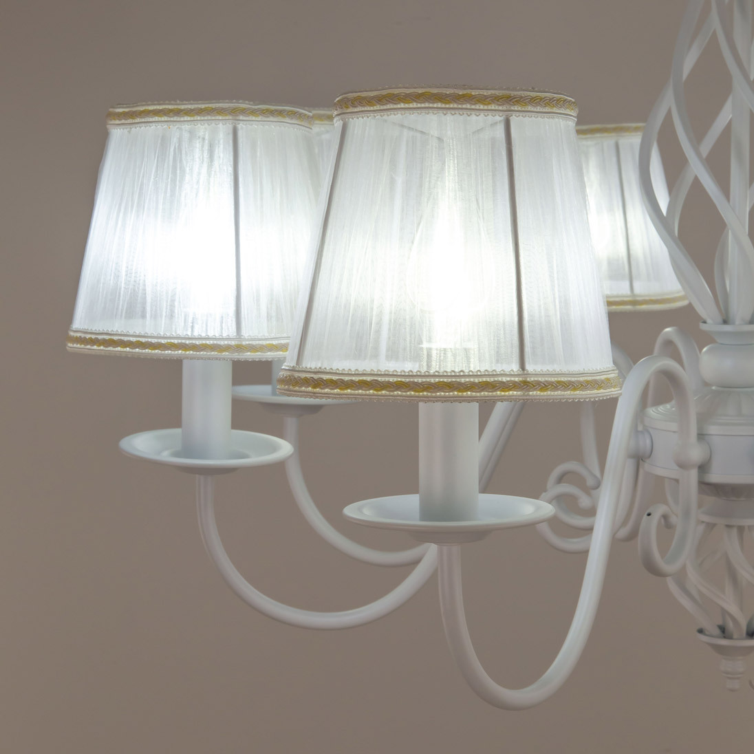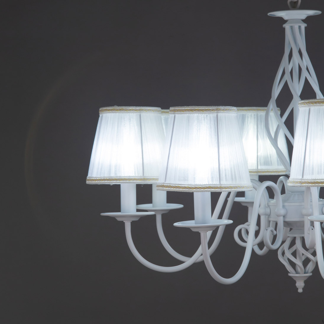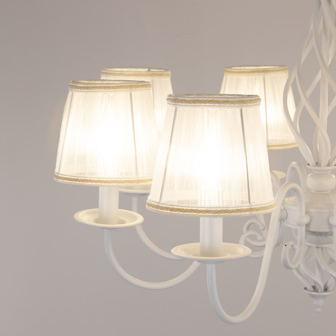 Люстры подвесные коллекции Ровена с завода с возможностью регулировки высоты монтажа. Это позволяет использовать их как в комнатах с высоким потолком, так и в низких помещениях. Минимальная высота с полностью убранной цепочкой составит всего 65 сантиметров, то есть на стандартный не высокий потолок данная модель подойдёт идеально. Серия одна из самых насыщенных с точки зрения модельного ряда. Люстру можно подобрать практически на любую площадь помещения и под любой цвет интерьера, так как модели производятся в двух цветовых решениях. Светильники отлично подойдут практически во все типы комнат, будь то гостиная, спальня или дача. Основание выполнено из прочного металла и окрашено в универсальный белый цвет. Покраска арматуры гальванизирована, что позволяет люстре не терять своих замечательных декоративный свойств даже при частой влажной уборке. Центральная часть светильника украшена оригинальной винтажной фигурой, за счёт которой люстра смотрится наполнено, пропорционально. Диаметр люстры 79 сантиметров, что делает её арт объектом в вашей комнате, светильник не потеряется по размеру даже на очень высоком потолке при площади помещения более 20 метров квадратных. В комплект входит восемь белых тканевых абажура, которые сделают свет более мягким и рассеянным. От такого света не будут уставать глаза, также при нем очень уютно. Светлые оттенки светильника очень легко привязать практически к любому интерьеру, а цвет арматуры идеально будет сочетаться с белой мебелью или аналогичными элементами дизайна комнаты. Текстура абажура полупрозрачная, за счёт этого люстры очень яркие – площадь освещения до 22 квадратных метров. Патроны сделаны из качественного термостойкого материала, позволяющего использовать лампочки накаливания до 60 ватт включительно, энергосберегающие или светодиодные лампочки можно применять любой мощности.