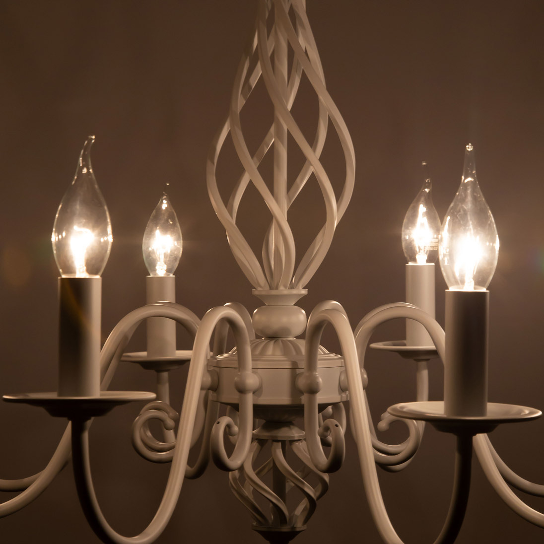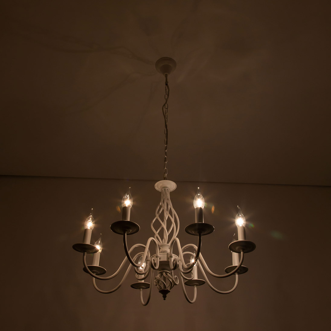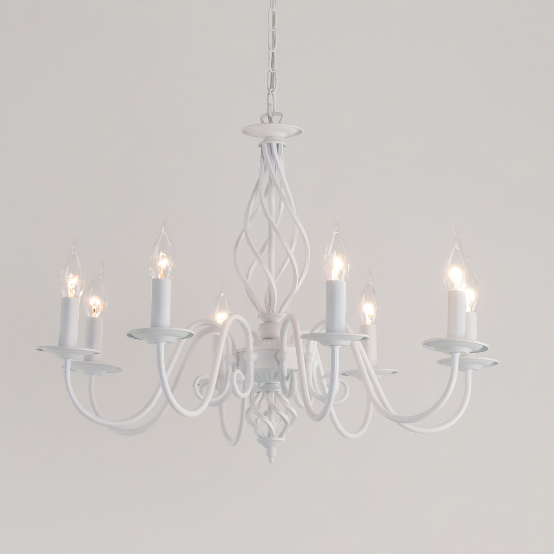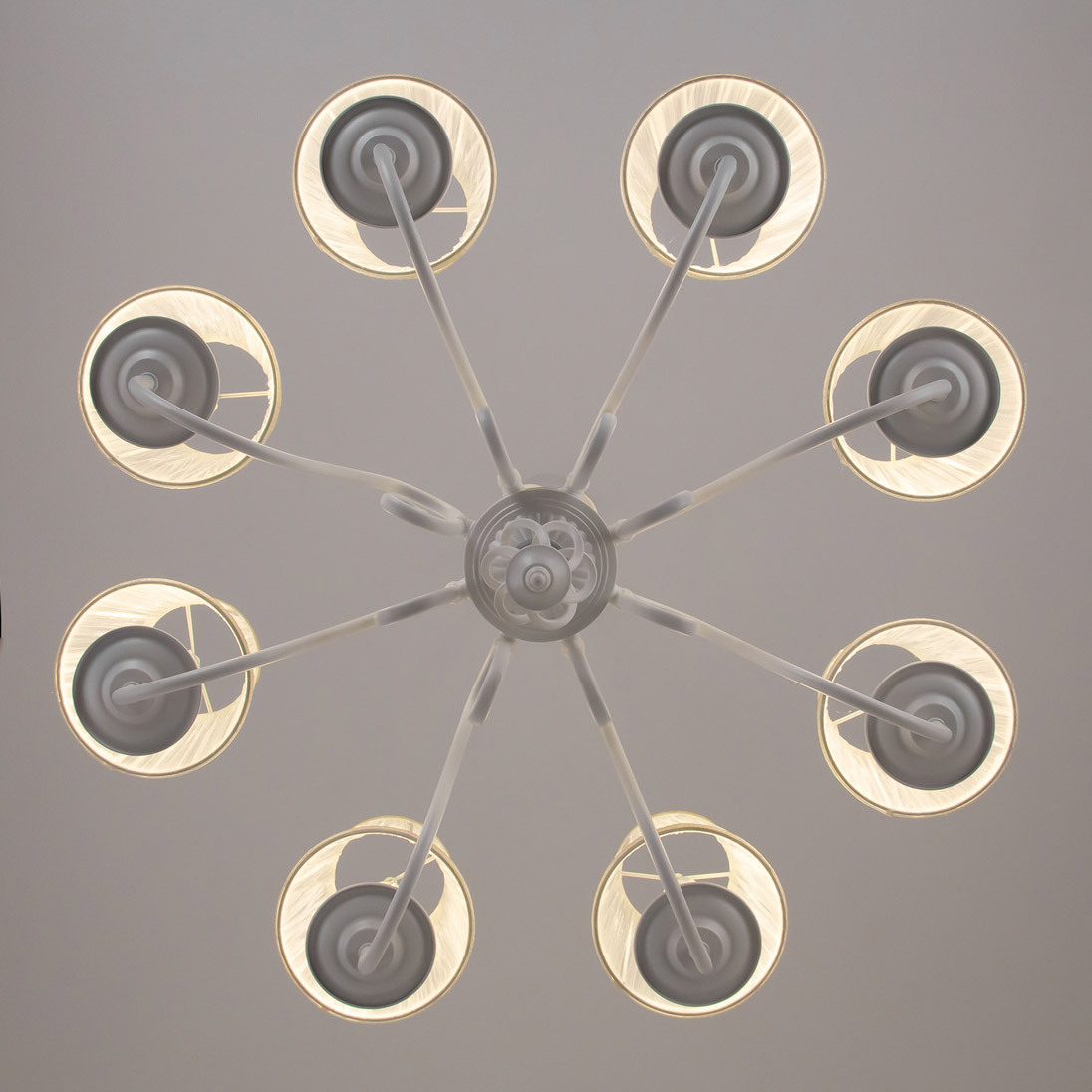 Люстры подвесные коллекции Ровена с завода с возможностью регулировки высоты монтажа. Это позволяет использовать их как в комнатах с высоким потолком, так и в низких помещениях. Минимальная высота с полностью убранной цепочкой составит всего 65 сантиметров, то есть на стандартный не высокий потолок данная модель подойдёт идеально. Серия одна из самых насыщенных с точки зрения модельного ряда. Люстру можно подобрать практически на любую площадь помещения и под любой цвет интерьера, так как модели производятся в двух цветовых решениях. Светильники отлично подойдут практически во все типы комнат, будь то гостиная, спальня или дача. Основание выполнено из прочного металла и окрашено в универсальный белый цвет. Покраска арматуры гальванизирована, что позволяет люстре не терять своих замечательных декоративный свойств даже при частой влажной уборке. Центральная часть светильника украшена оригинальной винтажной фигурой, за счёт которой люстра смотрится наполнено, пропорционально. Диаметр люстры 79 сантиметров, что делает её арт объектом в вашей комнате, светильник не потеряется по размеру даже на очень высоком потолке при площади помещения более 20 метров квадратных. В комплект входит восемь белых тканевых абажура, которые сделают свет более мягким и рассеянным. От такого света не будут уставать глаза, также при нем очень уютно. Светлые оттенки светильника очень легко привязать практически к любому интерьеру, а цвет арматуры идеально будет сочетаться с белой мебелью или аналогичными элементами дизайна комнаты. Текстура абажура полупрозрачная, за счёт этого люстры очень яркие – площадь освещения до 22 квадратных метров. Патроны сделаны из качественного термостойкого материала, позволяющего использовать лампочки накаливания до 60 ватт включительно, энергосберегающие или светодиодные лампочки можно применять любой мощности.