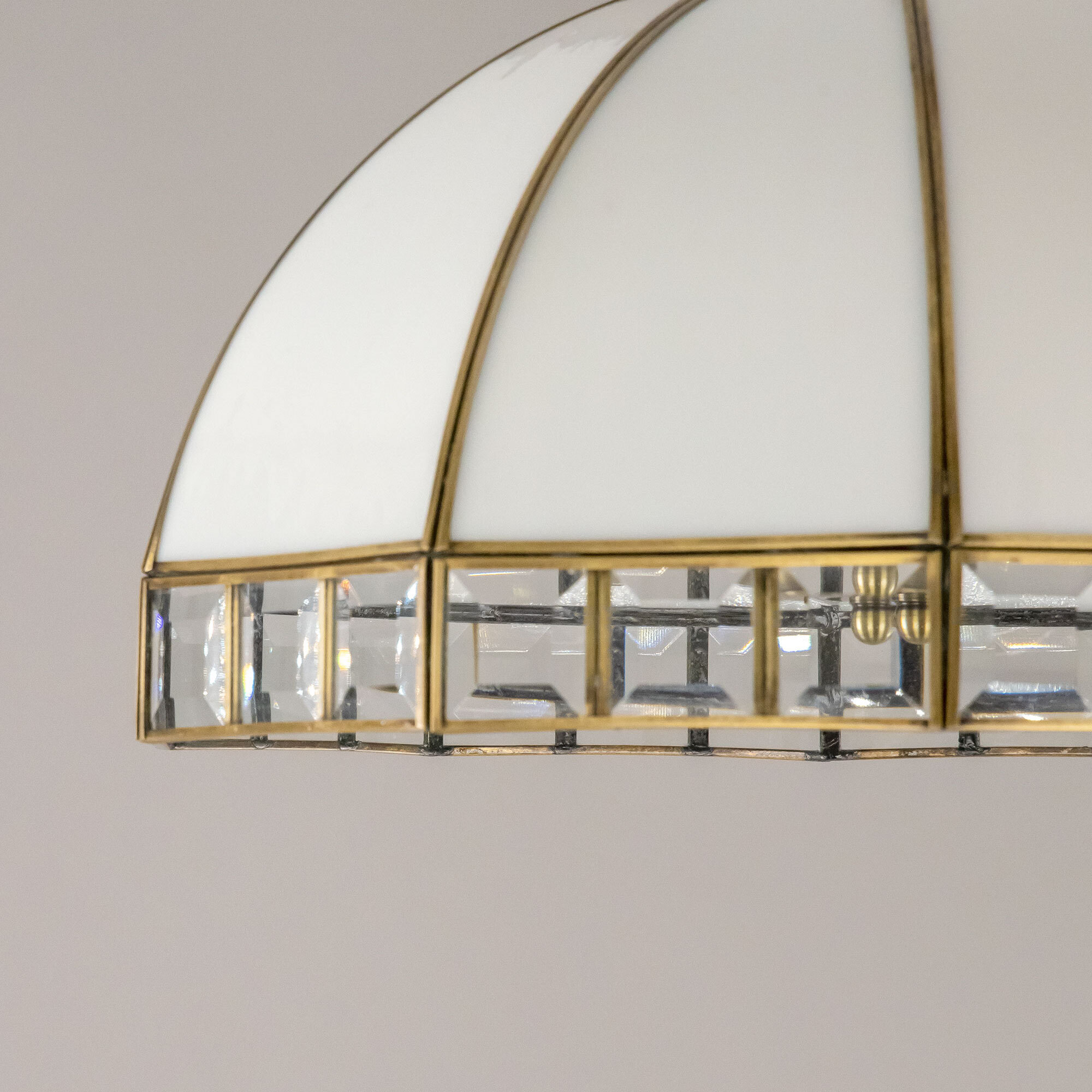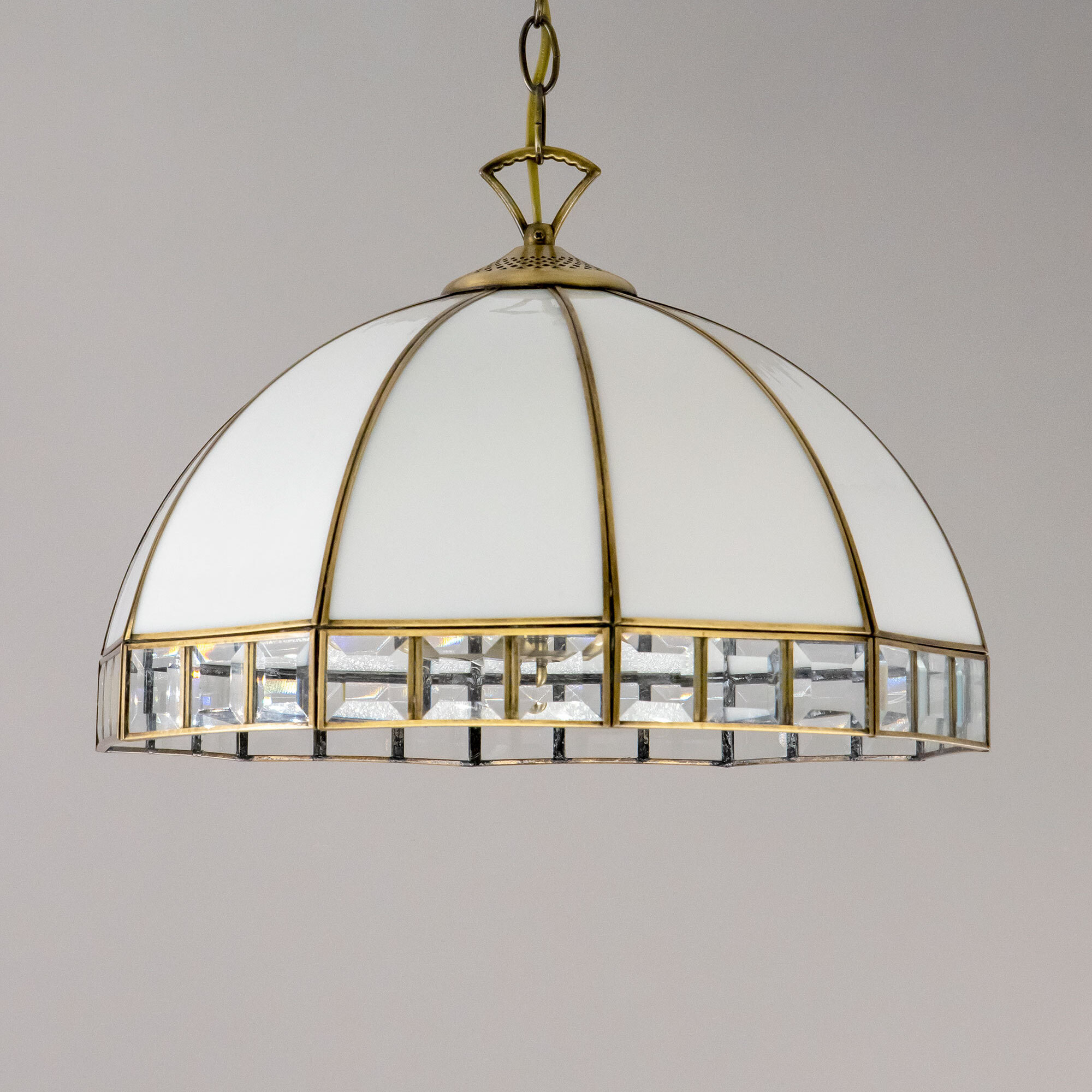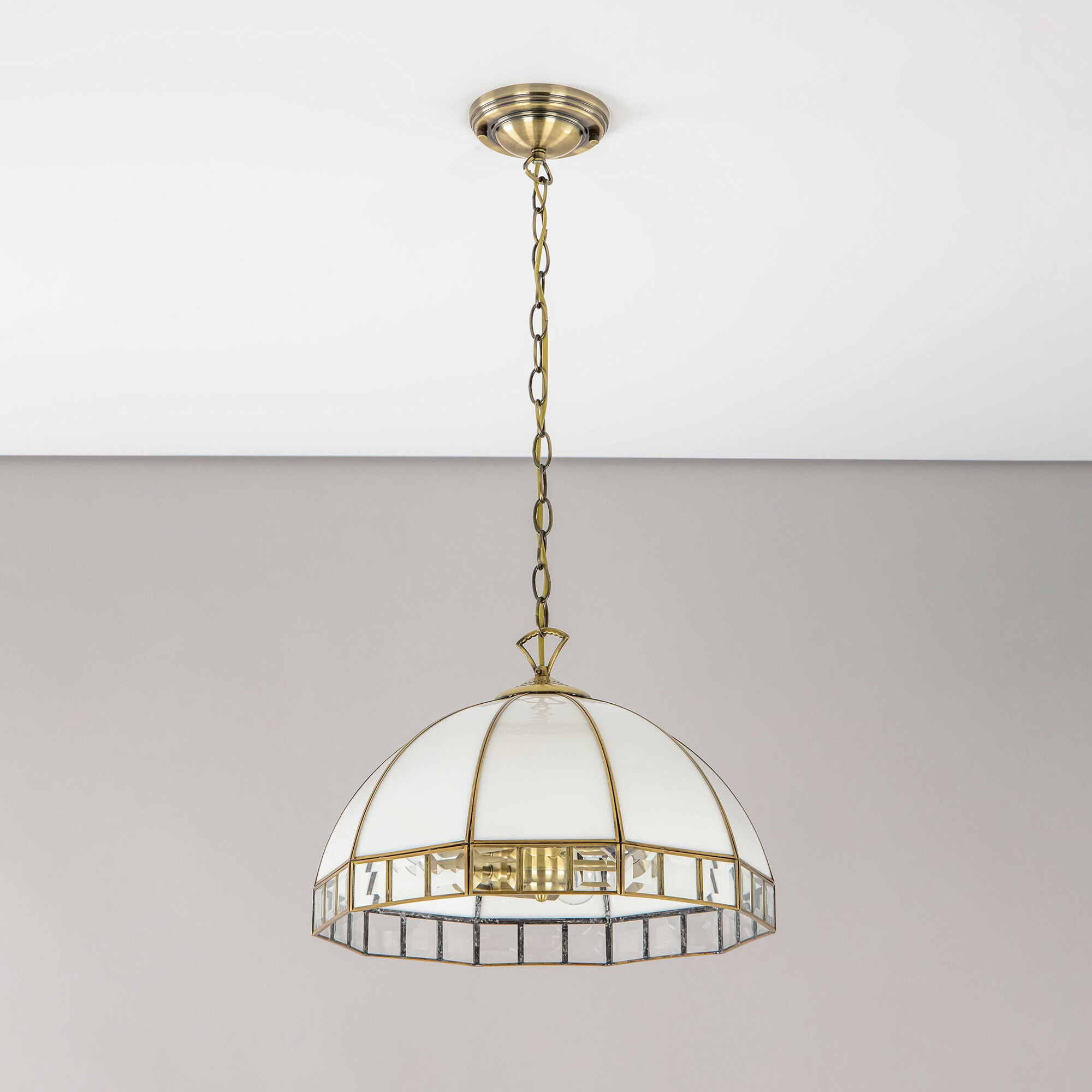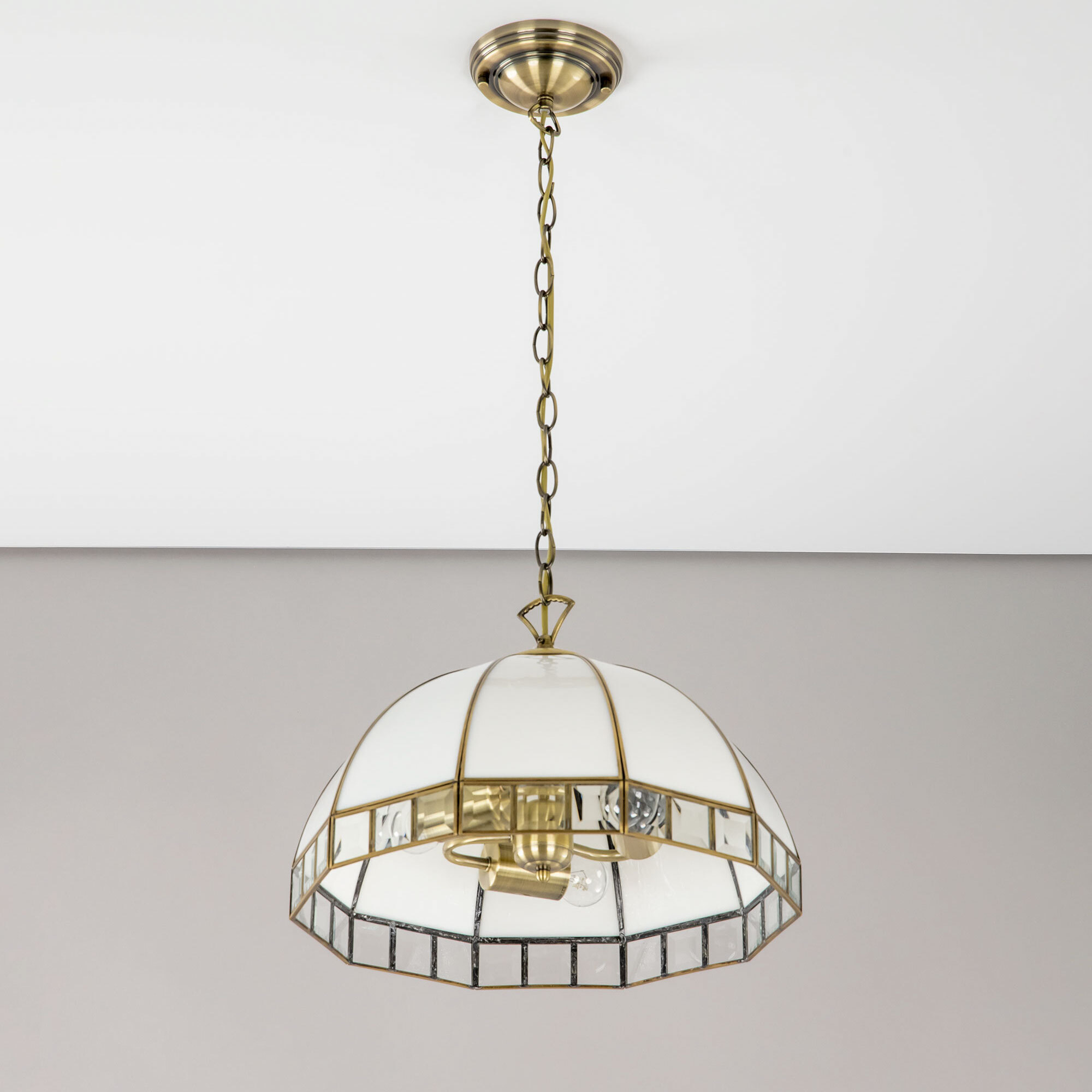 Подвесная люстра Citilux Шербург-1 CL440132 в стиле Тиффани. Основание металлическое, цвет бронза. Плафон ручной работы, изготовлен из витражного стекла белого цвета с декоративными прозрачными элементами. В изделии 3 лампы Е27 мощностью 75Вт. Высота светильника регулируется при установке, в диапазоне от 36,5см до 1,1м, диаметр 40см, осветит около 11м². Тип крепления – планка.