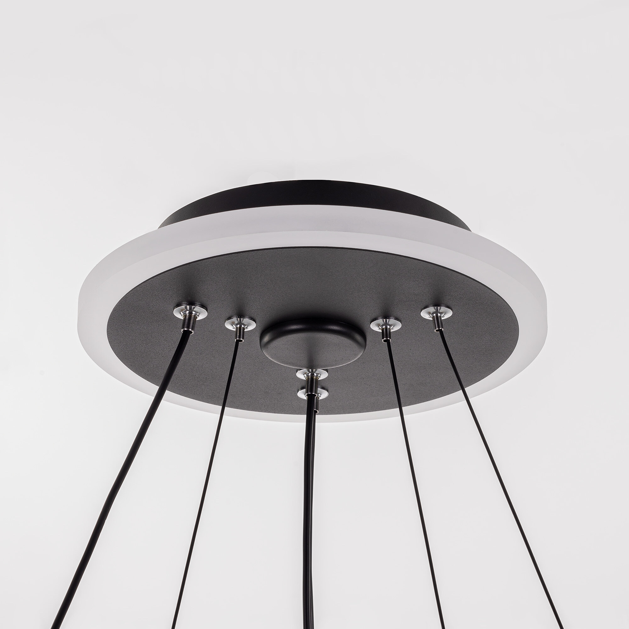 Люстра на тросах, в форме каскада из двух подвесных колец оригинальной формы, высоту и угол наклона каждого можно изменить. Корпус металлический, окрашен чёрной матовой текстурной краской. Круглое основание с красочной RGB подсветкой добавляет люстре элегантности и создает эффект "парящего" света.