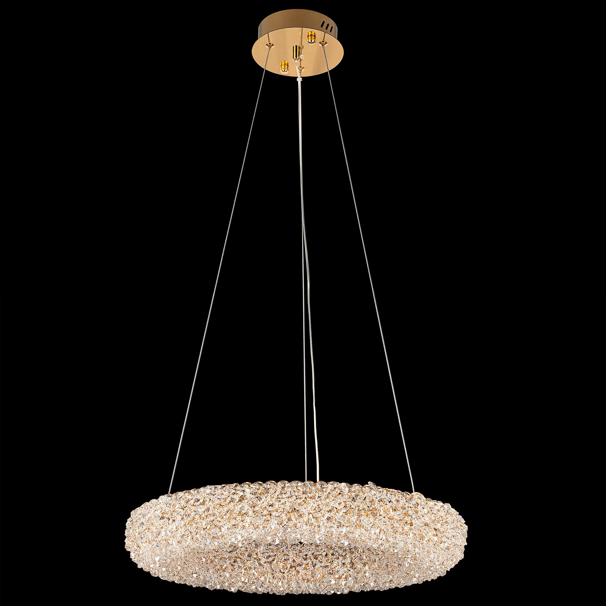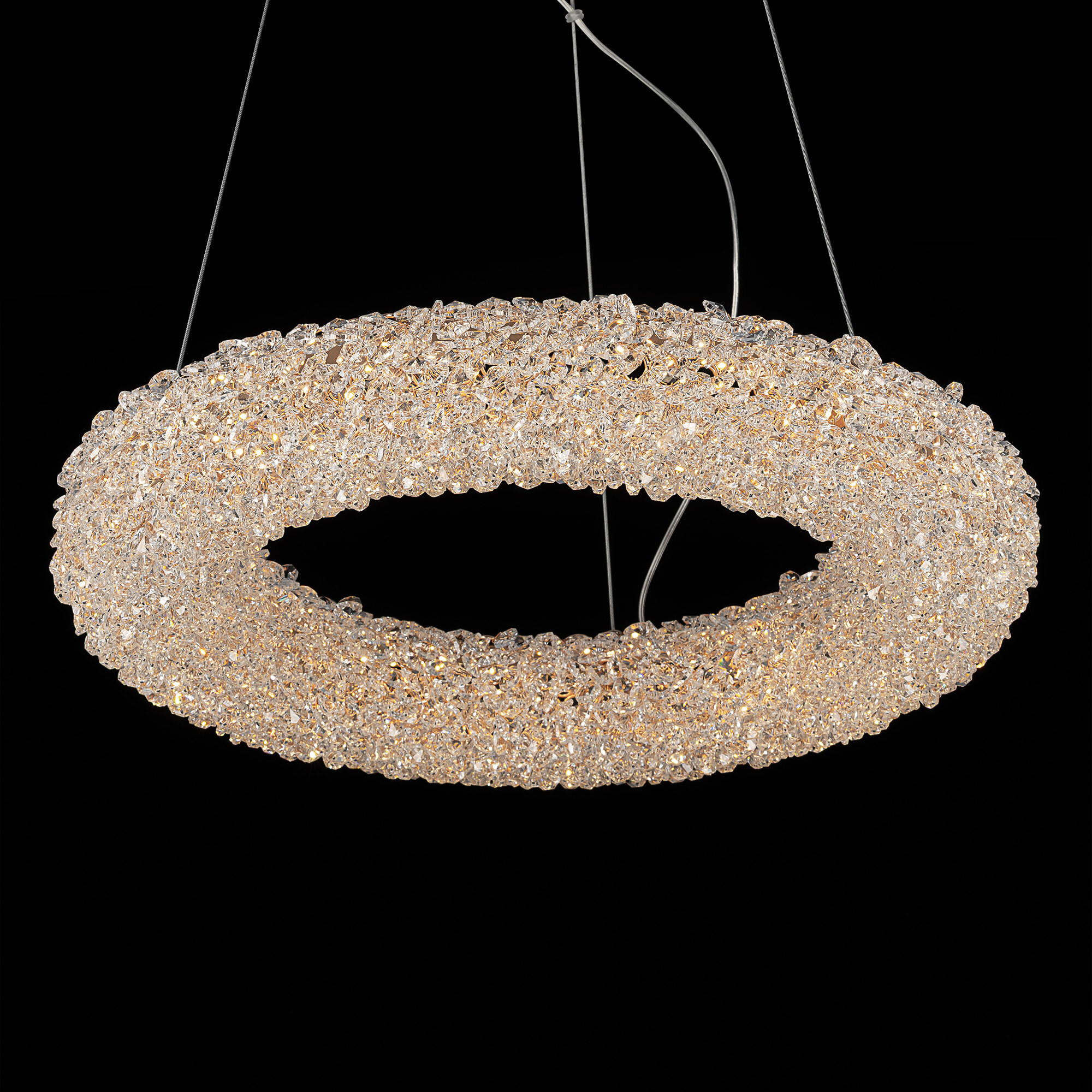 Каркас люстры — металлический, роскошного золотистого цвета. Подвесное кольцо составлено из множества тонких золотых колечек, внутри каждого из них закреплен кристаллик из прозрачного хрусталя. Тонкие подвесные тросы практически незаметны, создавая ощущение, что светильник парит в воздухе.