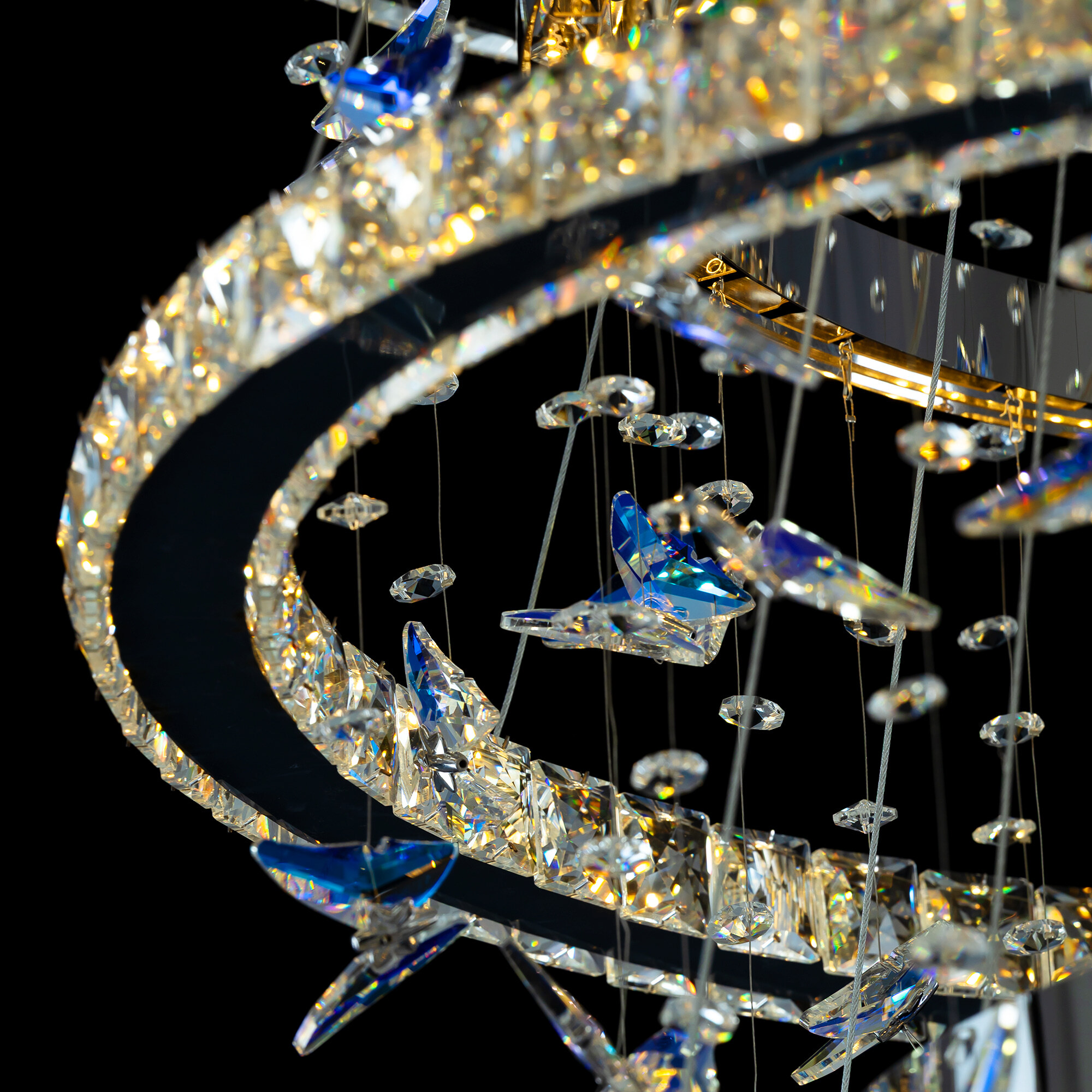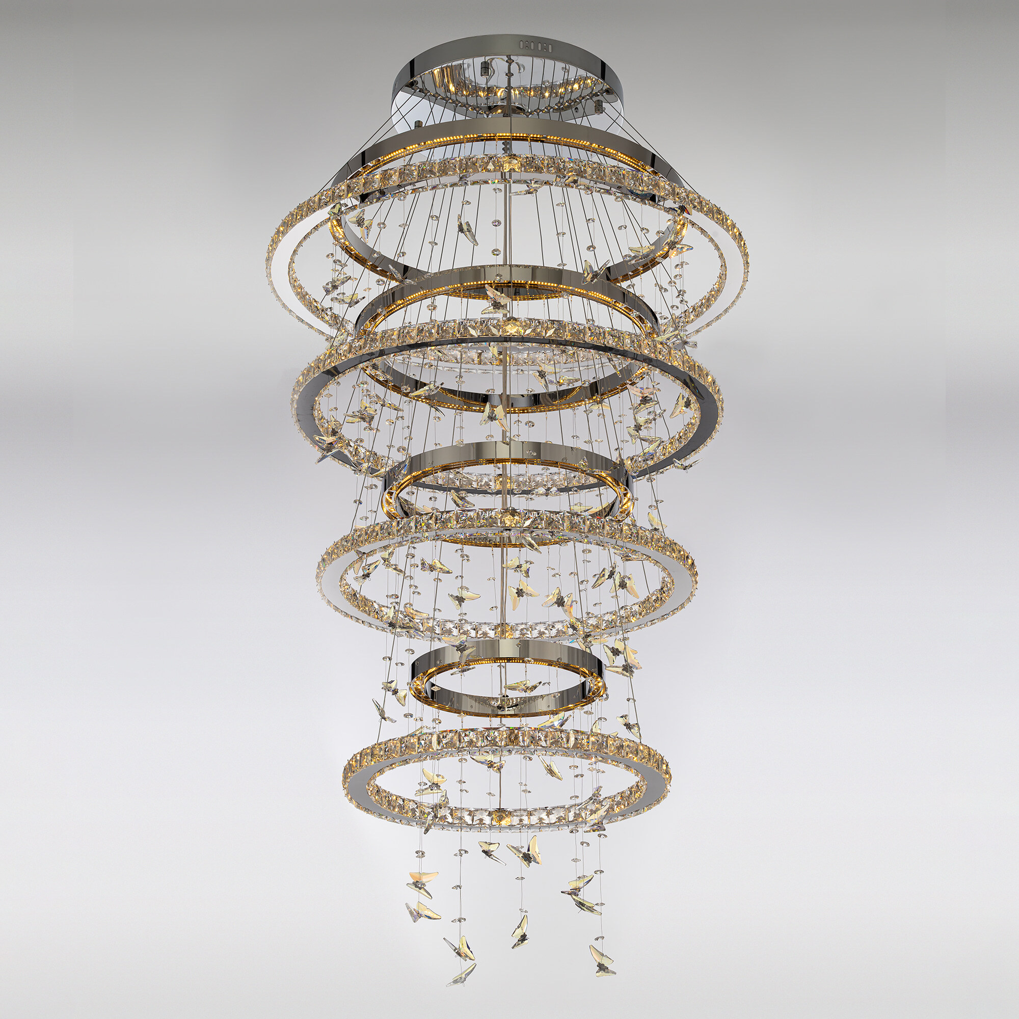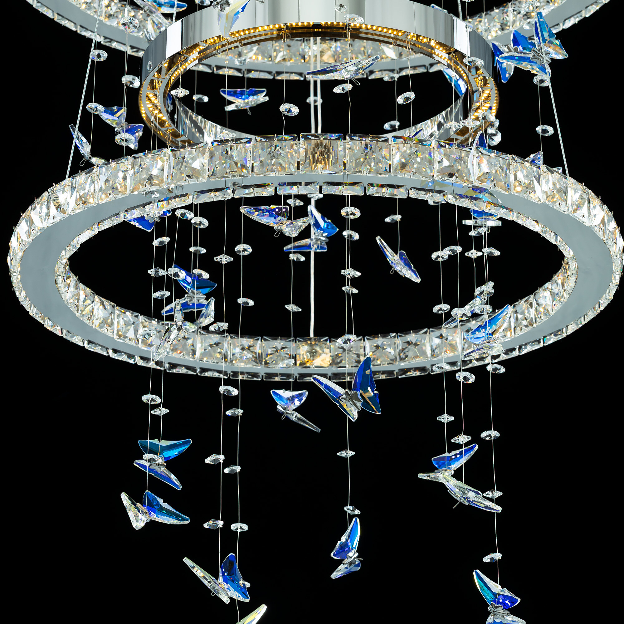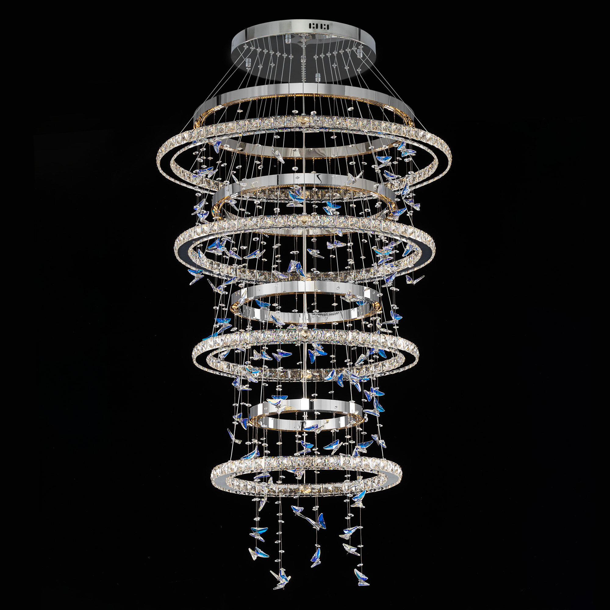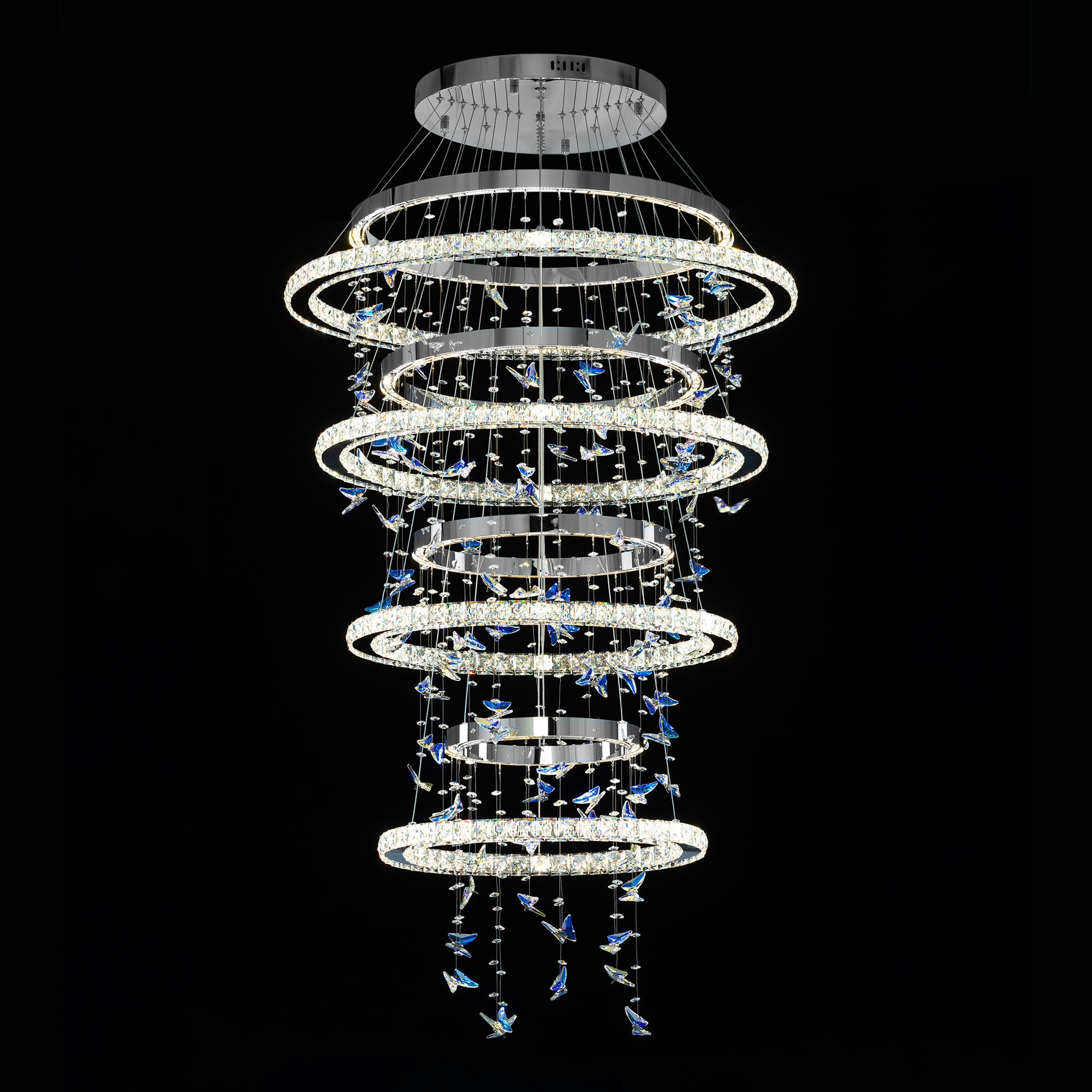 Светодиодная каскадная люстра Citilux ETERA CL322090 словно хрустальный водопад света, ниспадающий с потолка, превращает пространство в волшебный дворец из переливающихся бликов. Восемь подвесных колец из хромированного металла и огранённого хрусталя рассыпают по стенам искристые блики, а изящные подвески в форме бабочек отливают глубокой синевой.