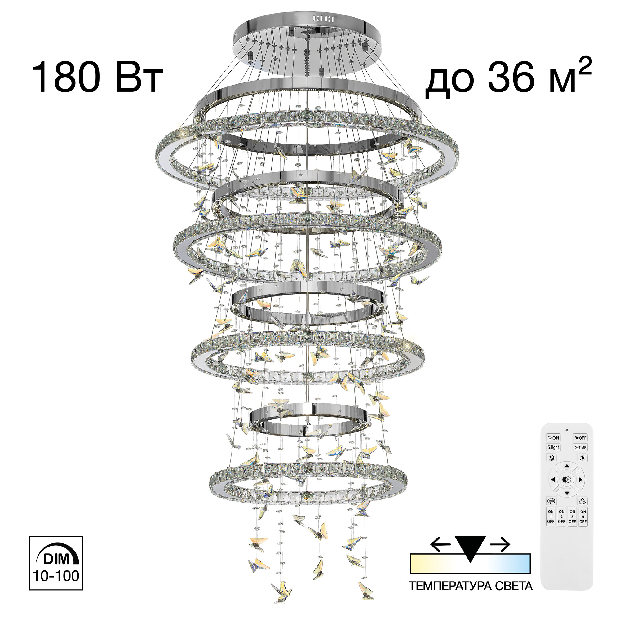 С помощью пульта вы легко настроите нужную атмосферу в помещении: плавно измените яркость от мягкого свечения (10%) до яркого дневного света (100%), выберите оттенок — от тёплого золотистого (3000K) до холодного кристально-белого (5500K). А если вечером вам нужно лишь лёгкое сияние, включите режим ночника или установите таймер отключения, чтобы свет мягко погас. Четыре независимых канала управления, позволяют синхронизировать люстру с другими светильниками коллекции, создавая гармоничную световую композицию.