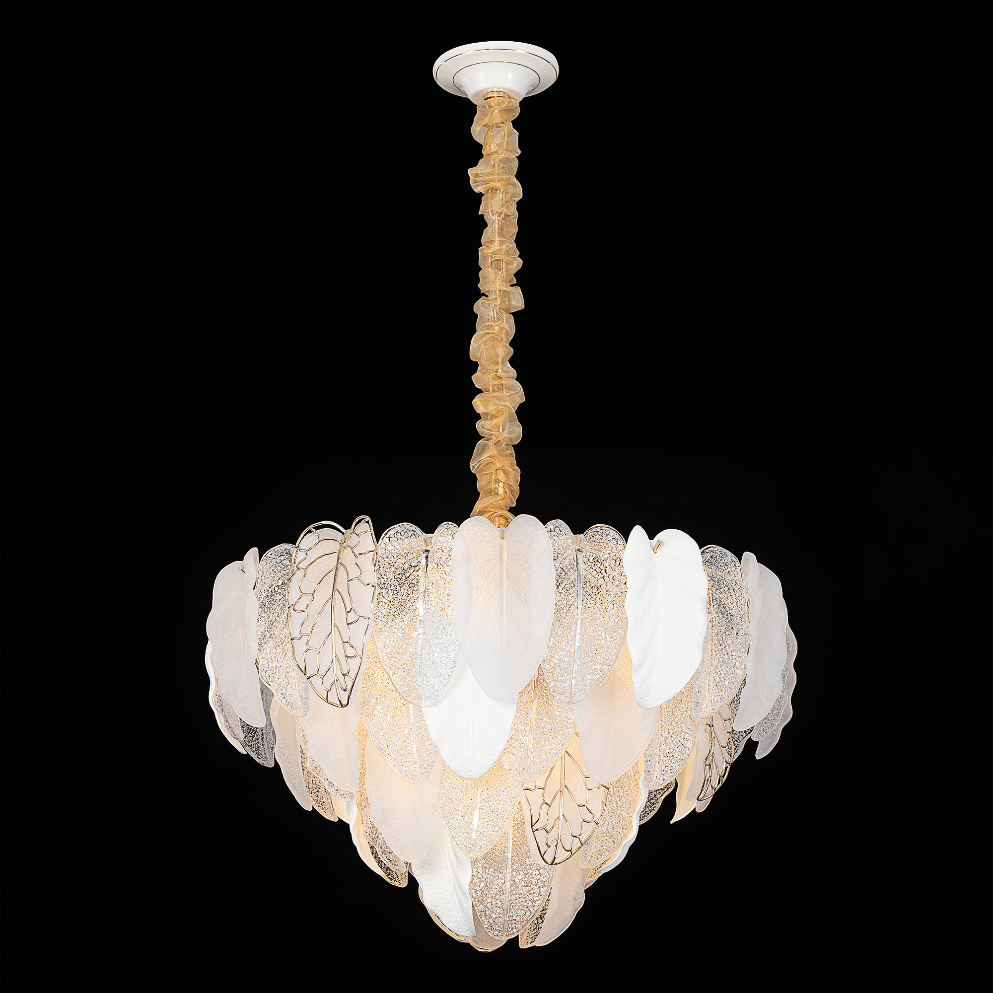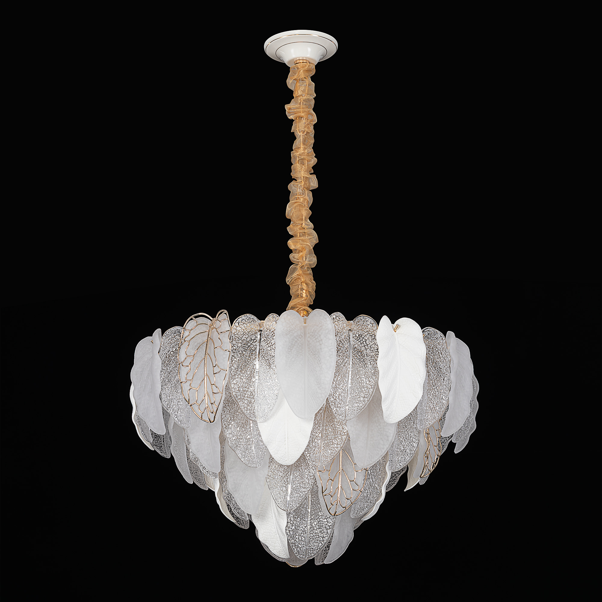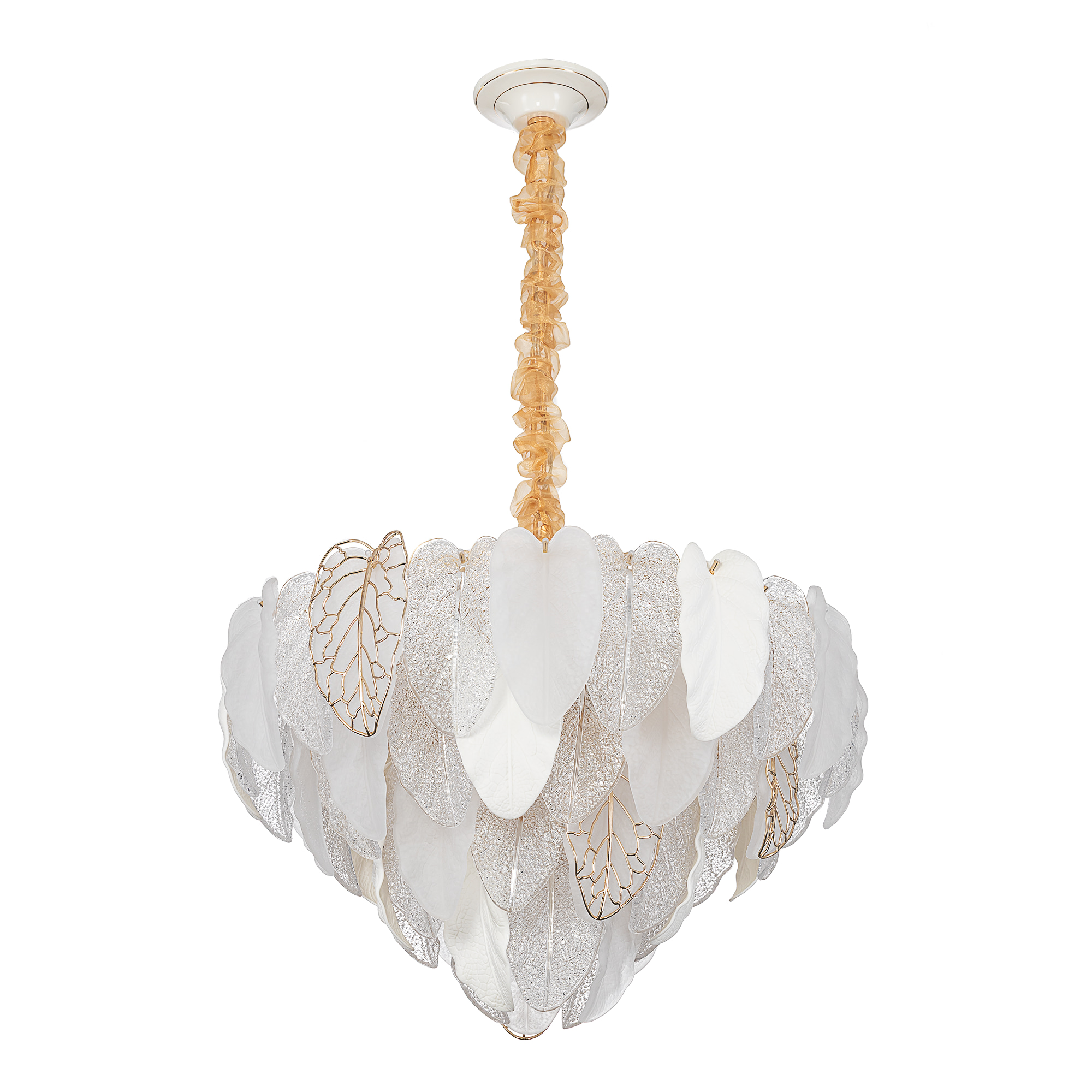 Белое керамическое основание, металлический каркас золотистого оттенка переливается в лучах света. Листья из полуматового и прозрачного рифленого стекла, белой керамики, а также металлические листья с прожилками, отлитые по ювелирной технологии, подчеркивают флористическую изысканность и четкость силуэта люстры. В изделии используются 15 лампочек с цоколем Е14, высоту подвесной цепи можно отрегулировать.