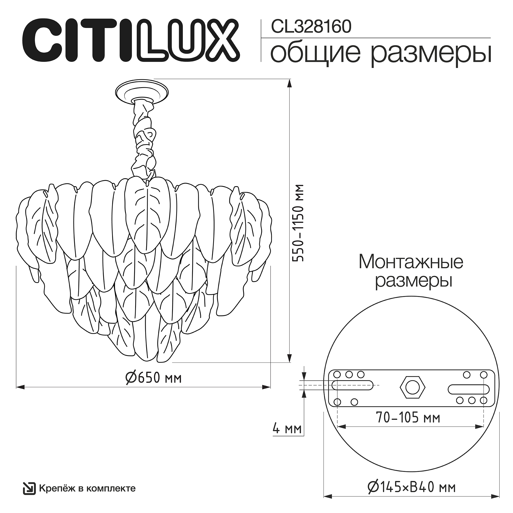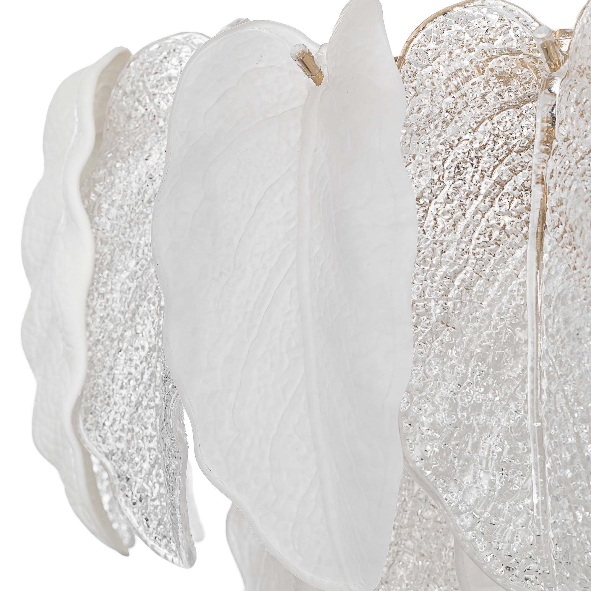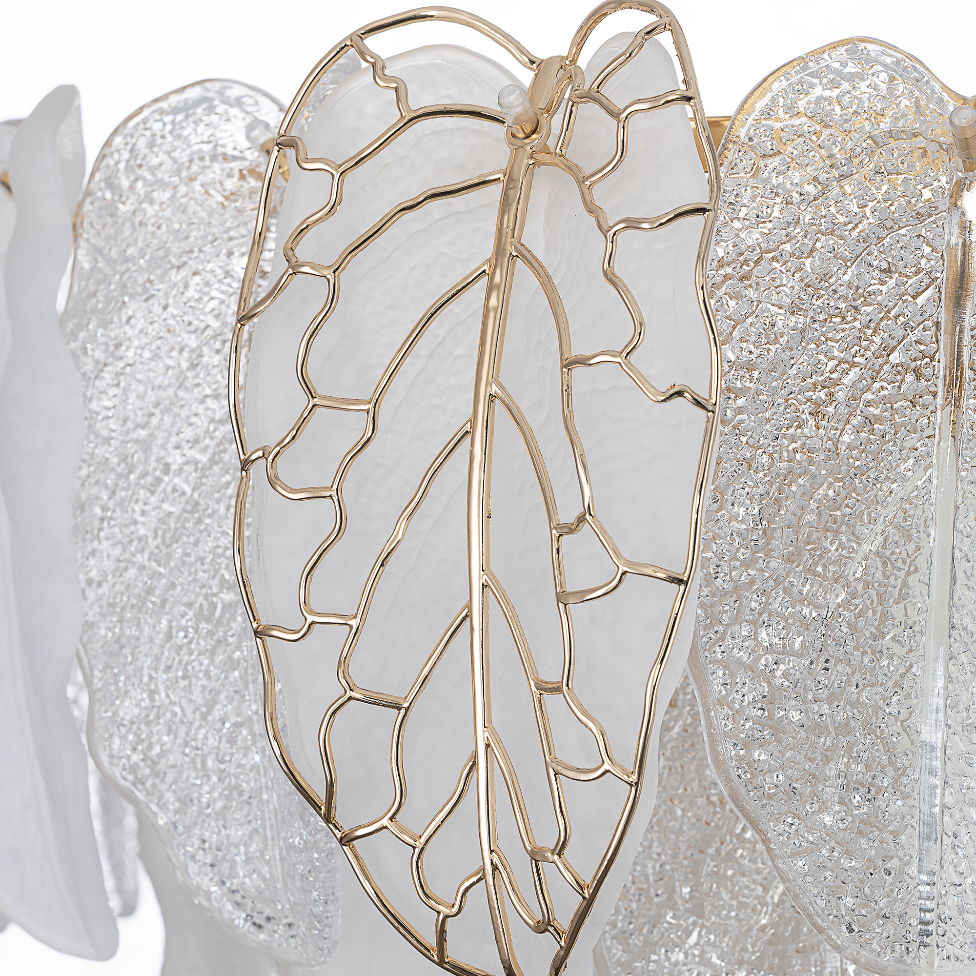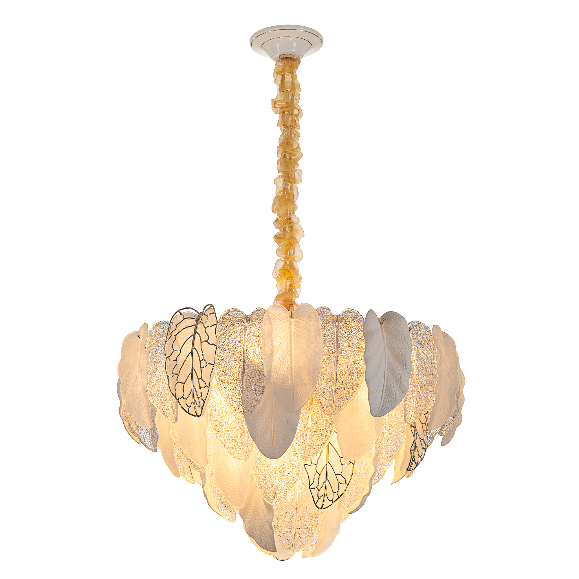 Белое керамическое основание, металлический каркас золотистого оттенка переливается в лучах света. Листья из полуматового и прозрачного рифленого стекла, белой керамики, а также металлические листья с прожилками, отлитые по ювелирной технологии, подчеркивают флористическую изысканность и четкость силуэта люстры. В изделии используются 15 лампочек с цоколем Е14, высоту подвесной цепи можно отрегулировать.