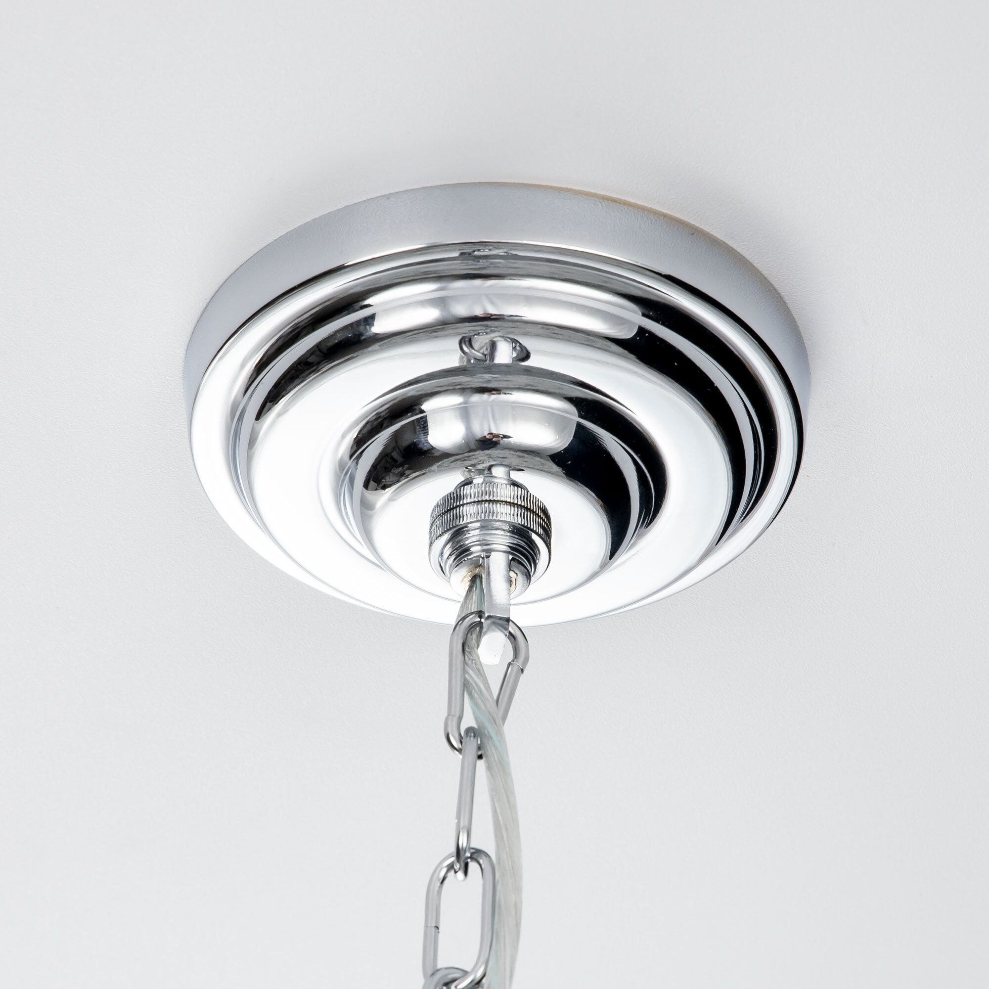 В изделии 6 ламп с цоколем Е14 максимальной мощностью для ламп накаливания 60Вт (в комплект не входят, приобретаются отдельно). Люстра подходит для общего и дополнительного освещения помещений как с высокими, так и с низкими потолками, длина цепи регулируется при установке, тип крепления – планка. Диаметр модели 46см, высота 48-110см, осветит до 21м².