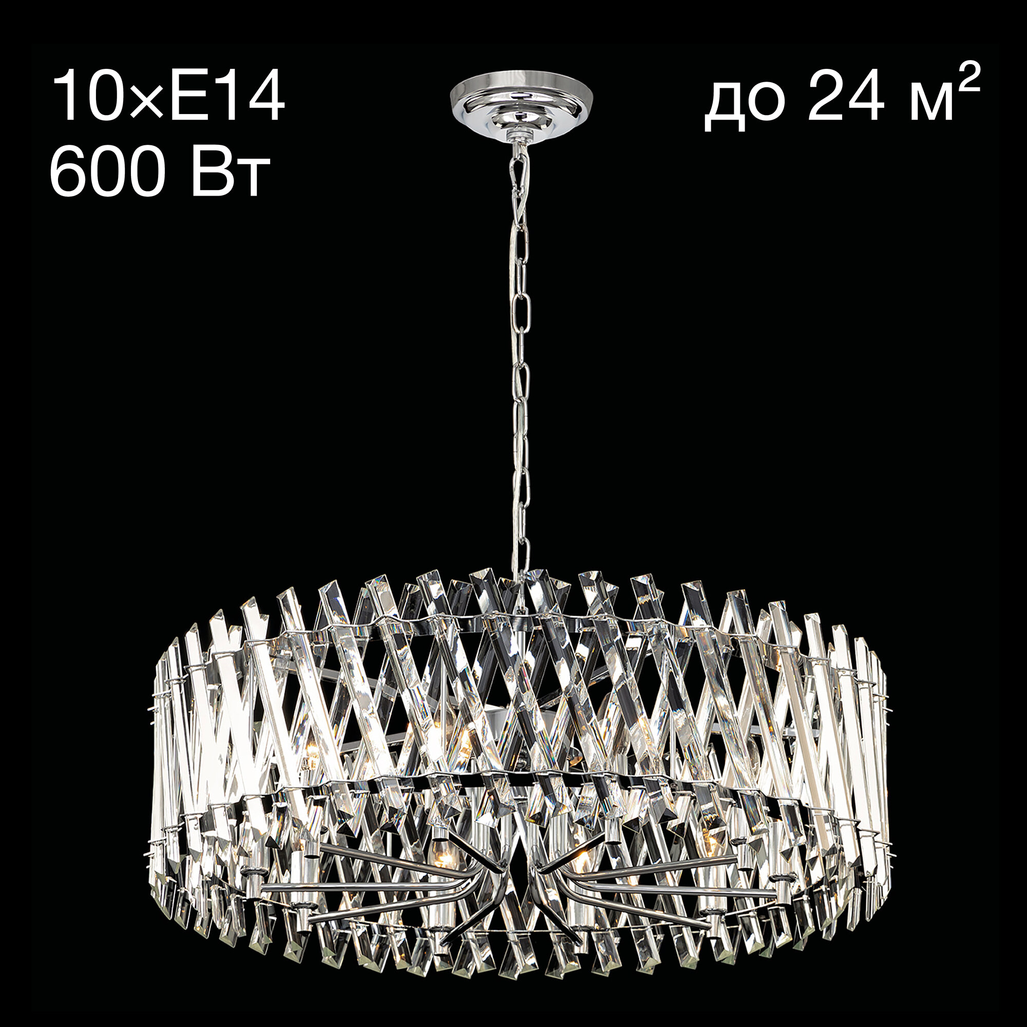 В изделии 10 ламп с цоколем Е14 максимальной мощностью для ламп накаливания 60Вт (в комплект не входят, приобретаются отдельно). Люстра подходит для общего освещения помещений как с высокими, так и с низкими потолками, длина цепи регулируется при установке, тип крепления – планка. Диаметр модели 77см, высота 45-110см, осветит до 24м².