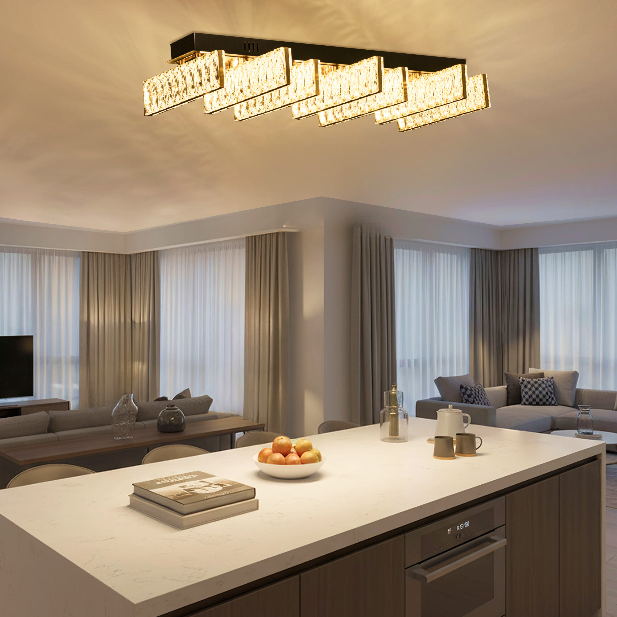 Каркас люстры — металлический, сочетаются черные и бронзовые элементы. На прямоугольном основании закреплены семь горизонтальных светодиодных модулей с хрустальным рассеивателем. Светодиодный свет с цветовой температурой 3000К мягко рассеивается в пространстве, играя на хрустальных гранях радужными искрами. Общая мощность люстры — 45Вт, ее можно установить на любой потолок, в том числе, натяжной.