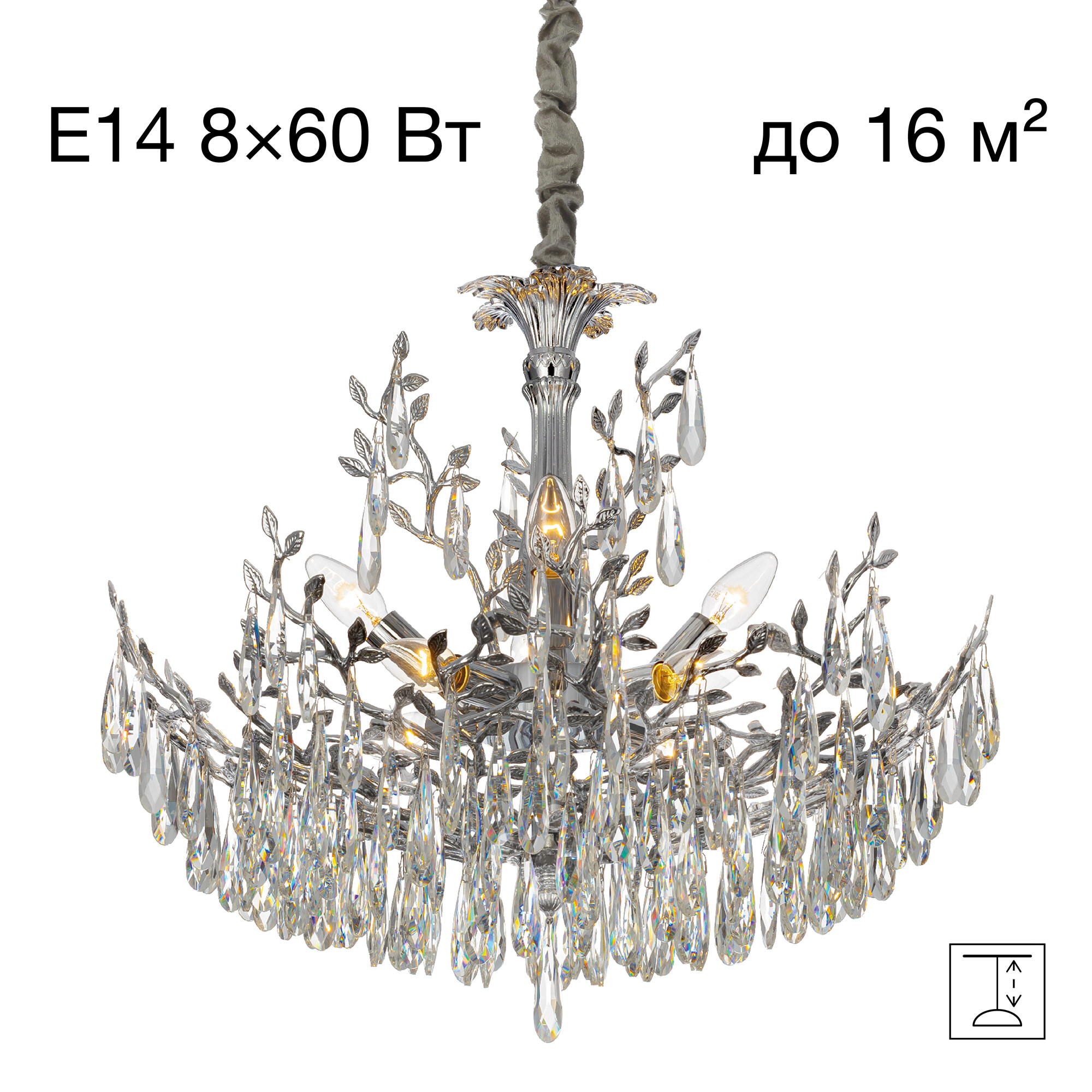 В изделии используются 8 ламп с цоколем Е14, максимальной мощностью для ламп накаливания 60Вт (лампы в комплект не входят, приобретаются отдельно). Рекомендуем устанавливать прозрачные светодиодные филаментные лампы.