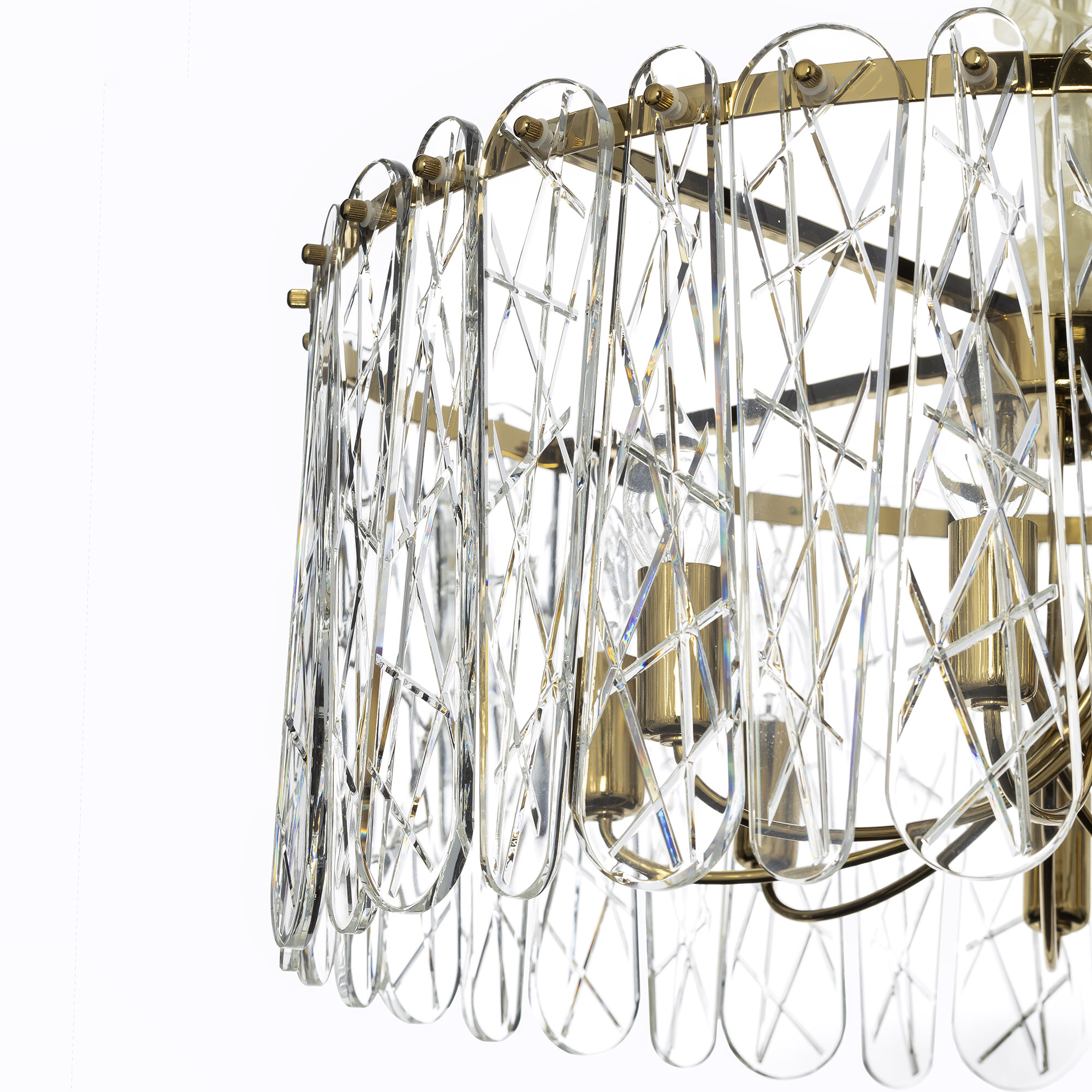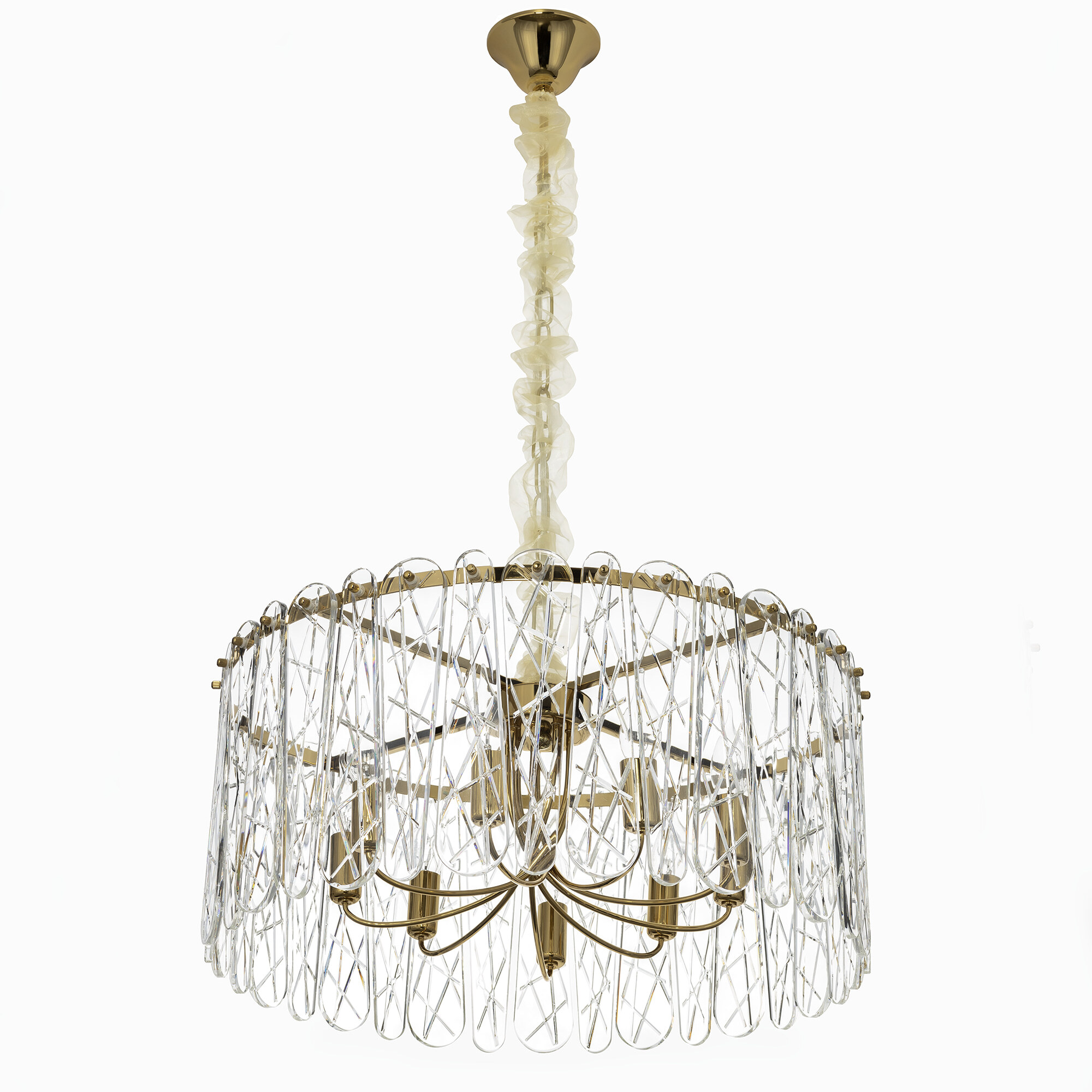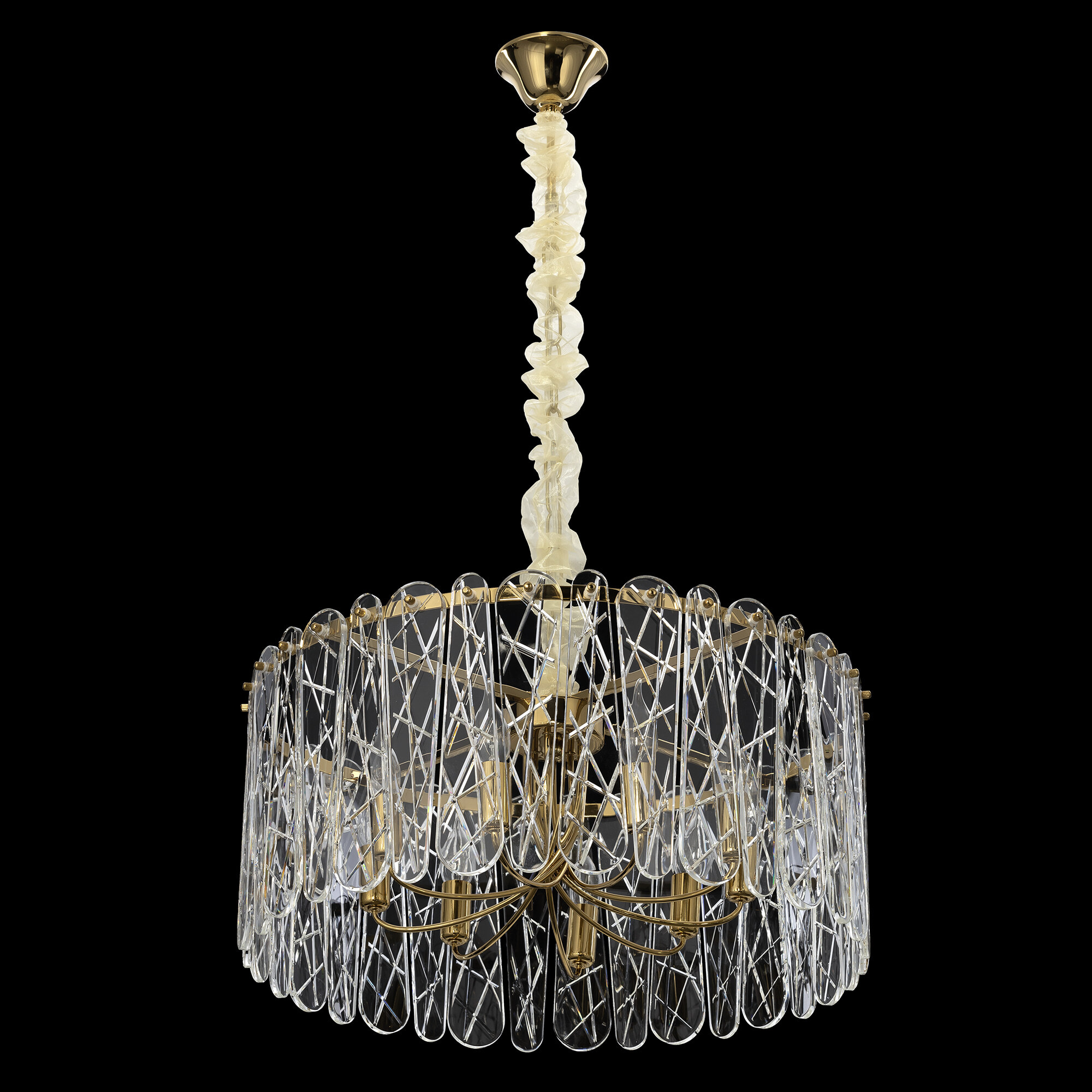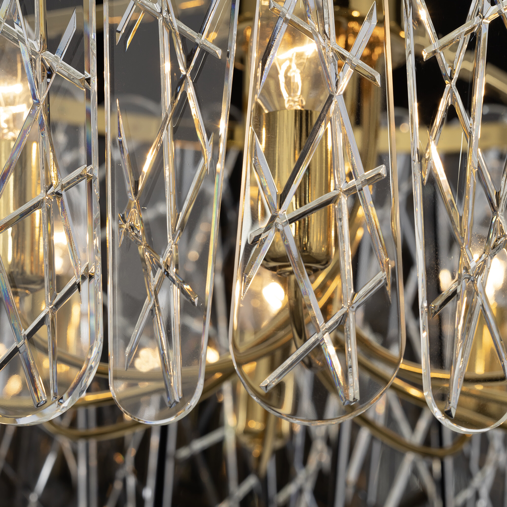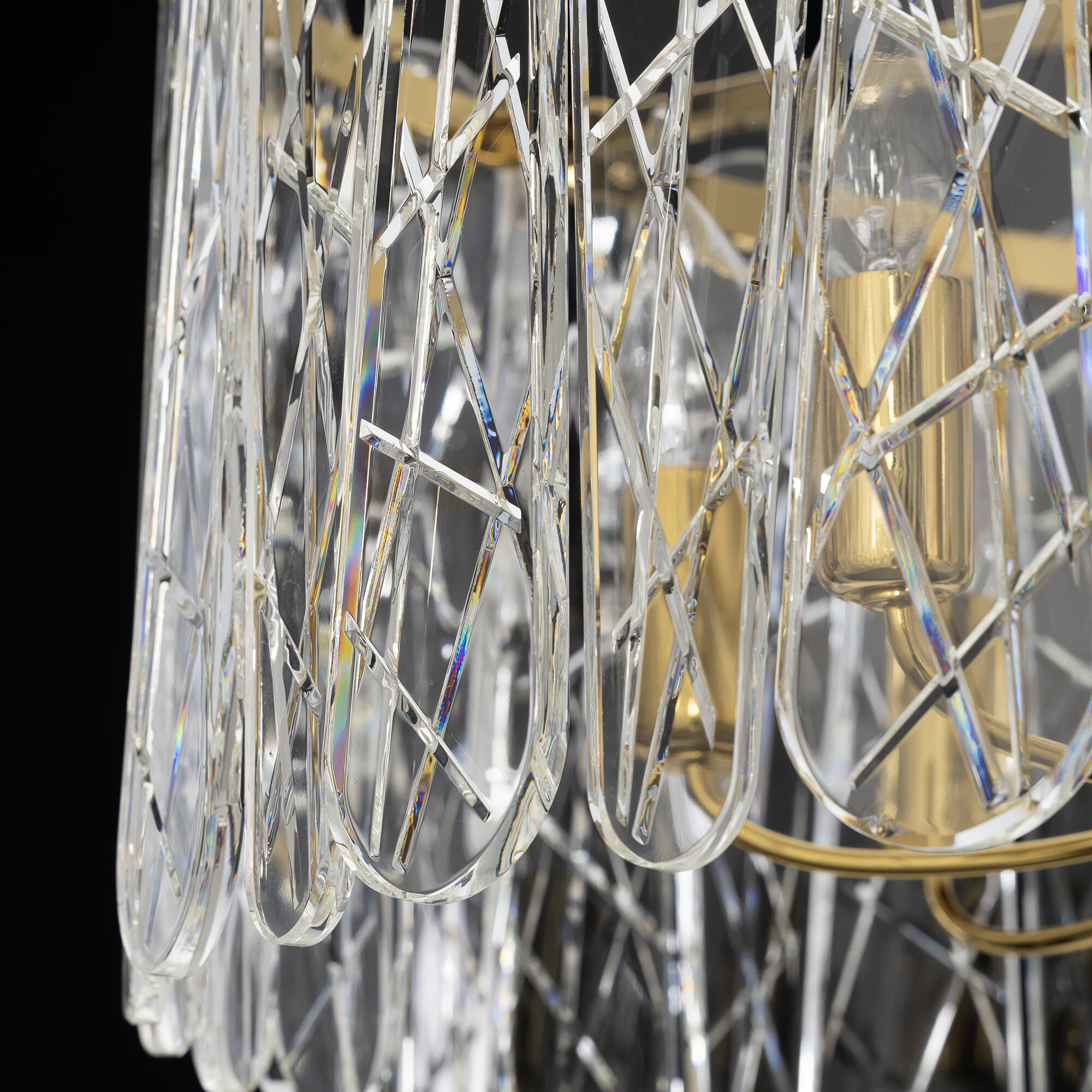 Каркас светильника из металла благородного золотого оттенка. Тонкие хрустальные пластины с замысловатым декоративным рисунком превращают свет в магию: мягкие лучи, проходя через хрусталь, рассыпаются по комнате миллионами радужных бликов.