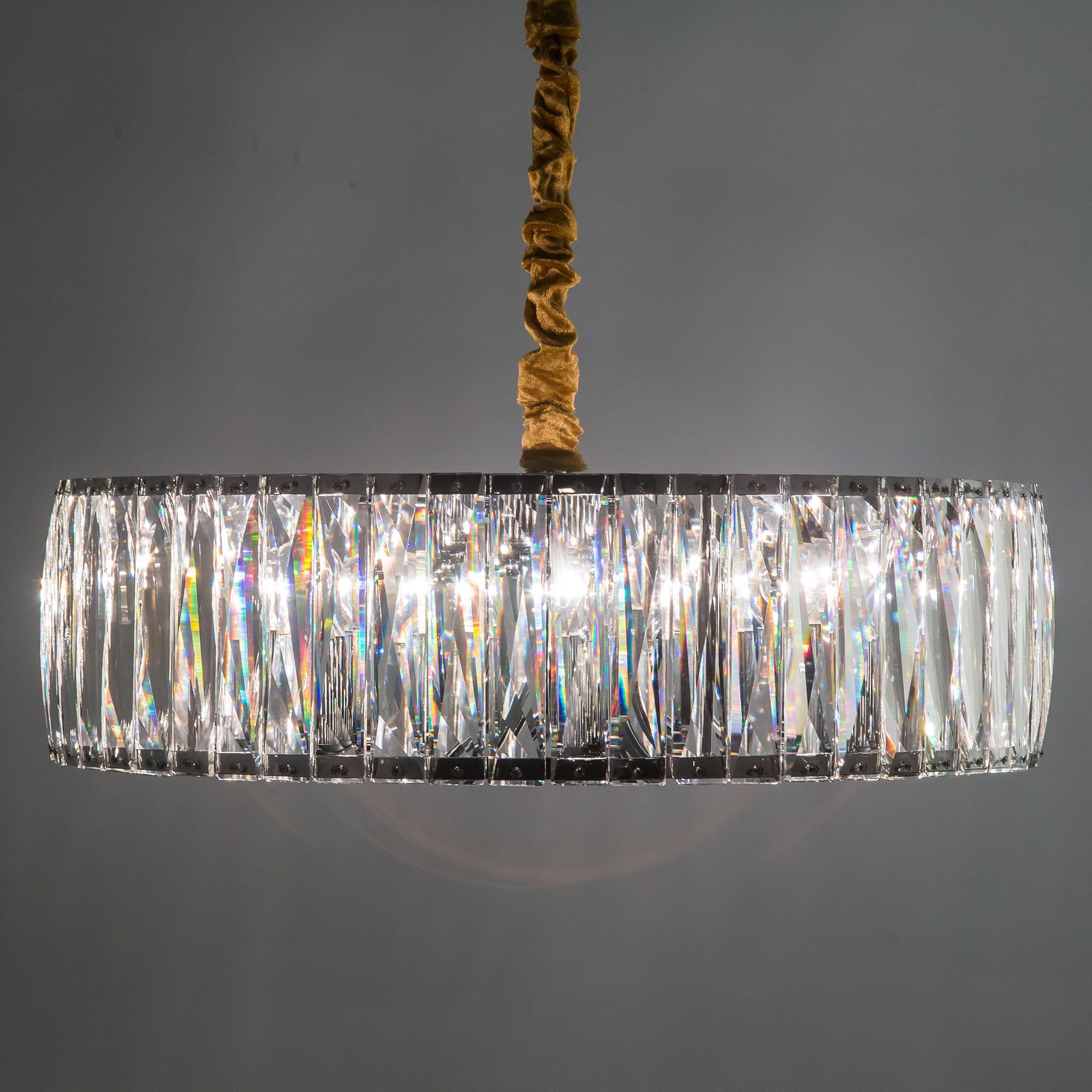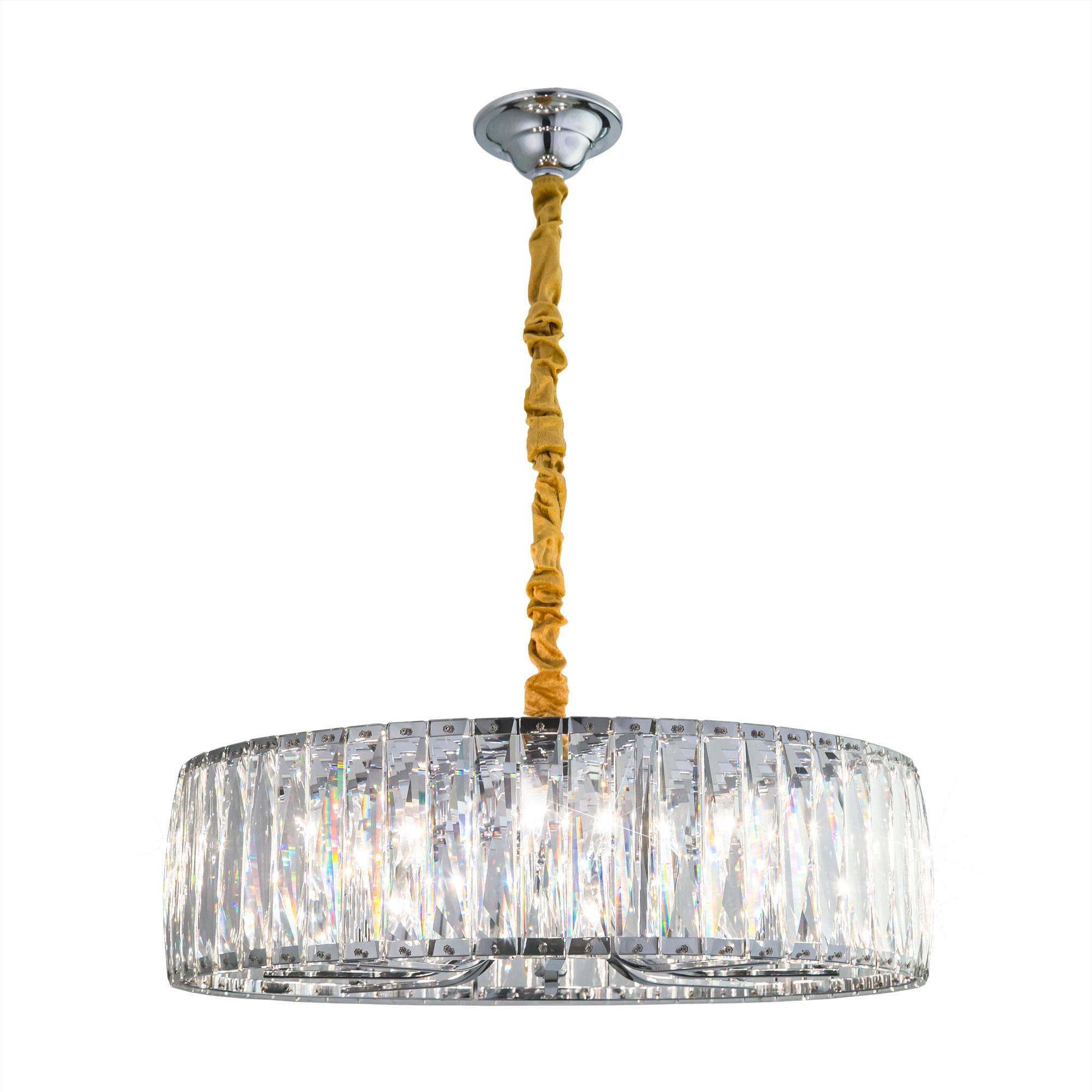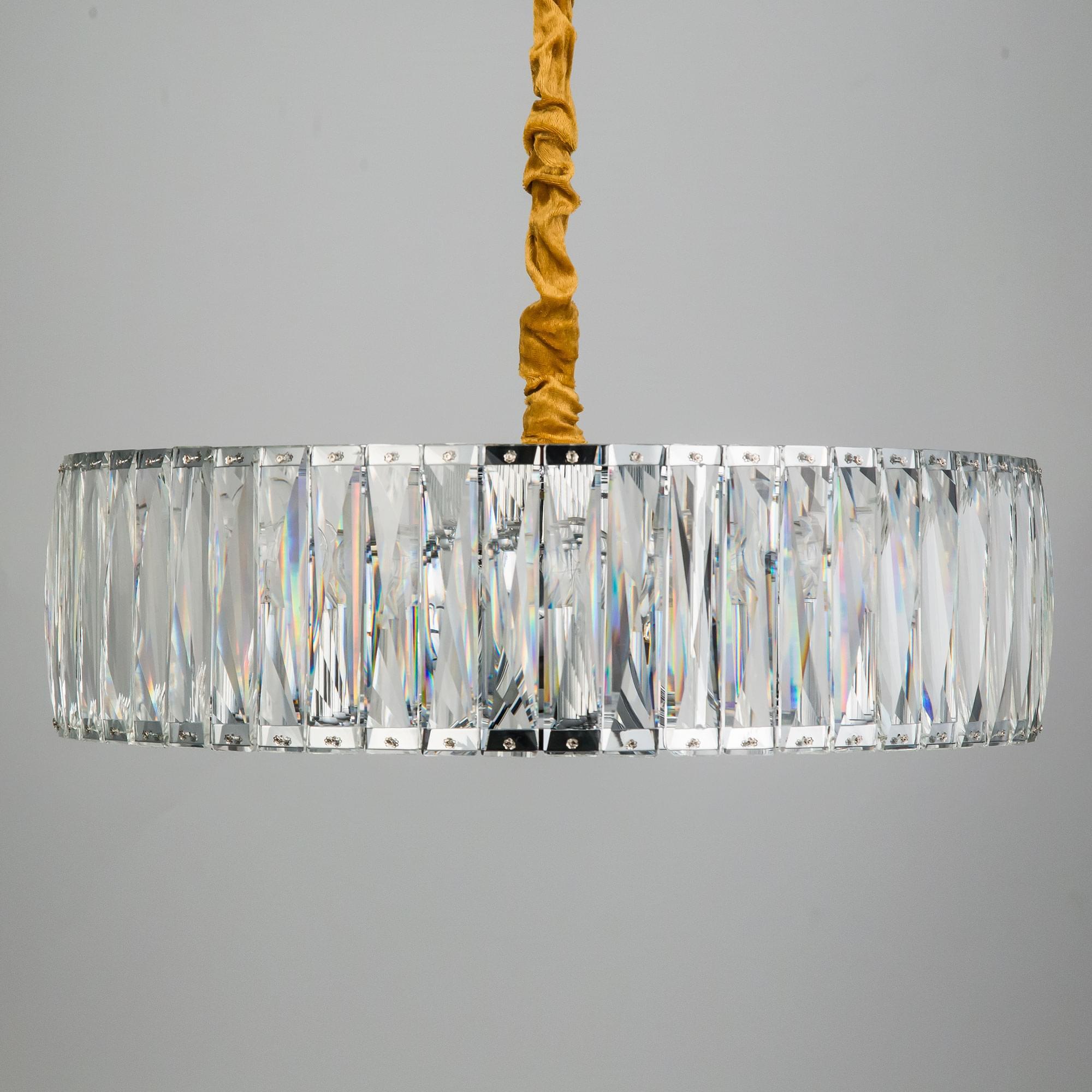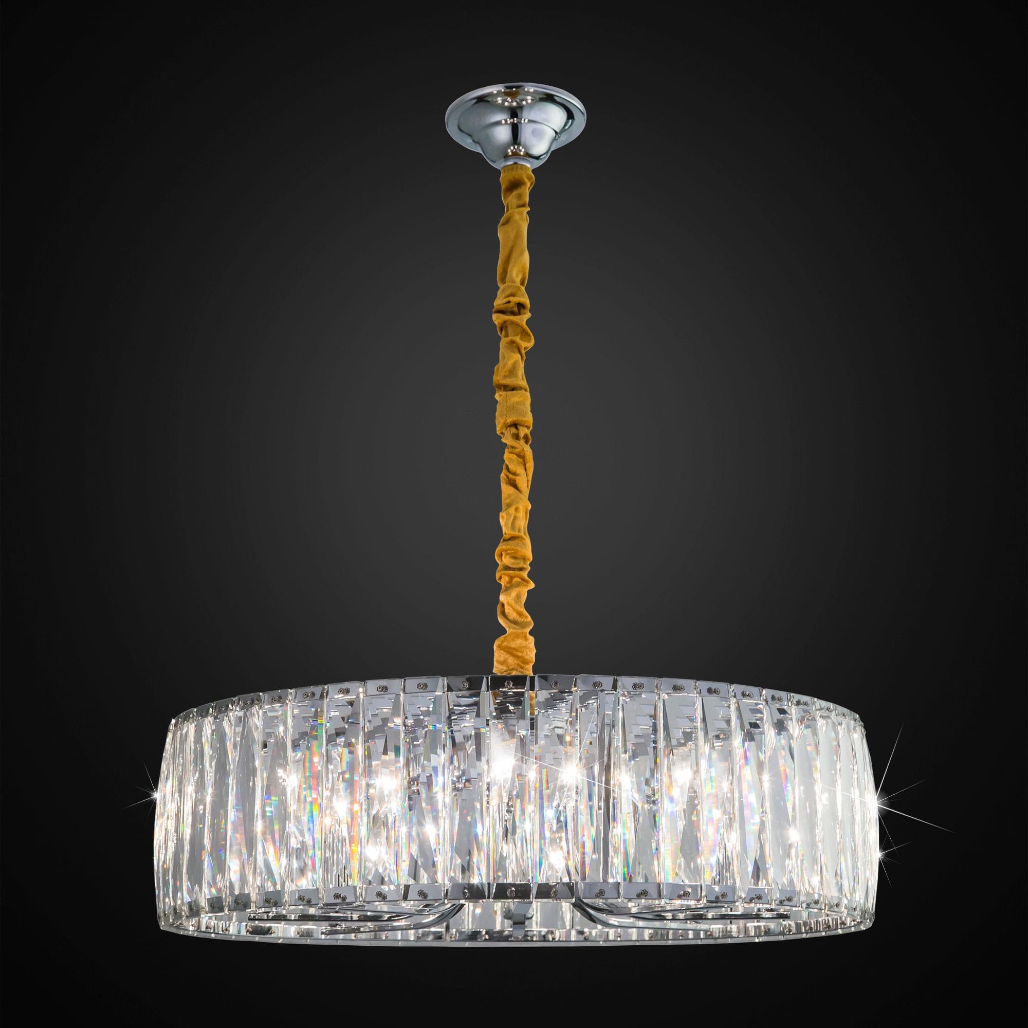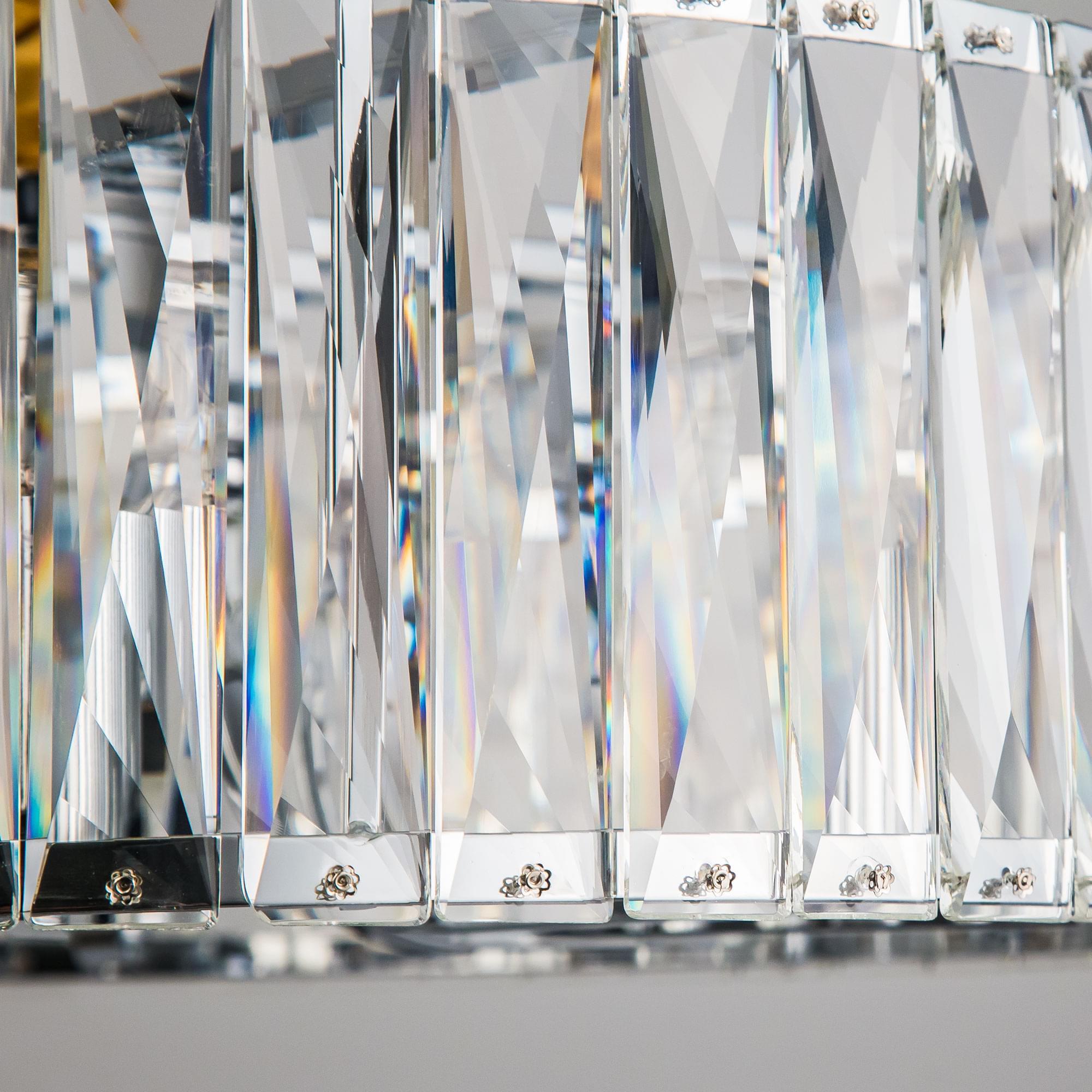 Корпус светильника выполнен из блестящего хромированного металла, в обрамлении хрустального абажура из прозрачных кристаллов, которые отражая свет, создают волшебное сияние и сказочную игру бликов.