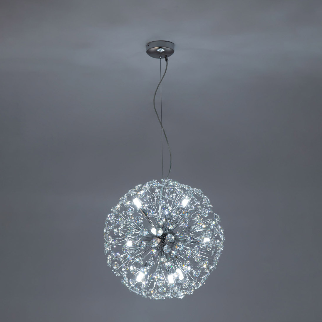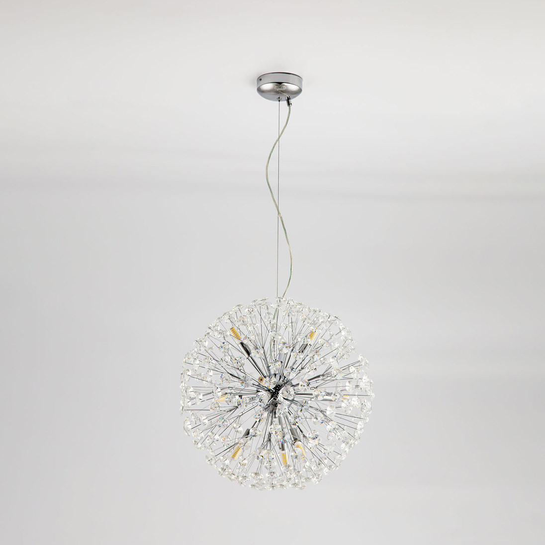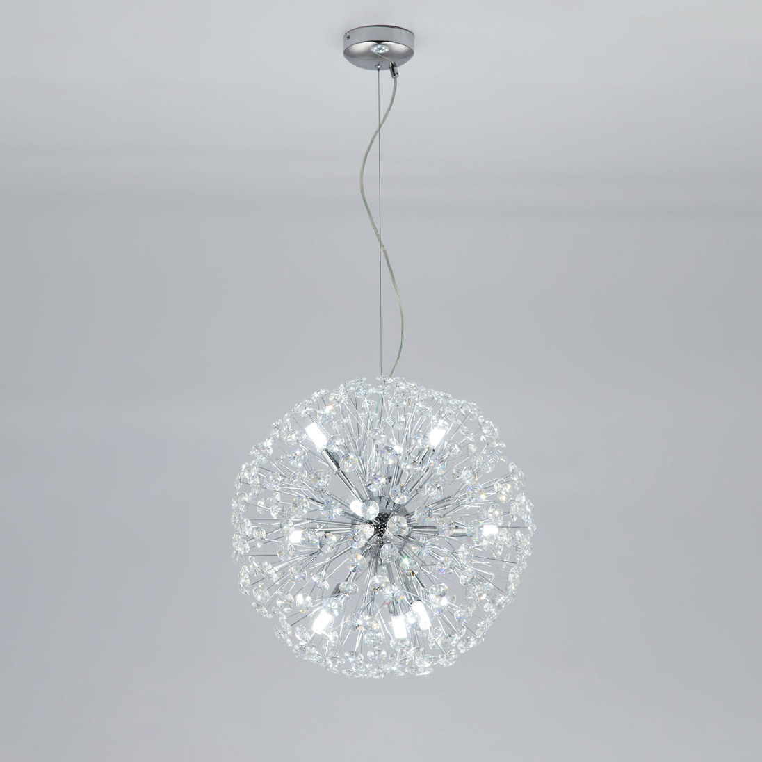 Потрясающая подвесная хрустальная люстра Eletto EL322P09.1 Betsy – это искусство современного стиля, привнесенное в ваш интерьер. Металлический глянцевый хромированный корпус олицетворяет утончённую элегантность. Оригинально ограненные хрустальные элементы, прозрачные как кристаллы, изыскано расположены на изящных стойках, придавая светильнику форму невесомого парящего шара.