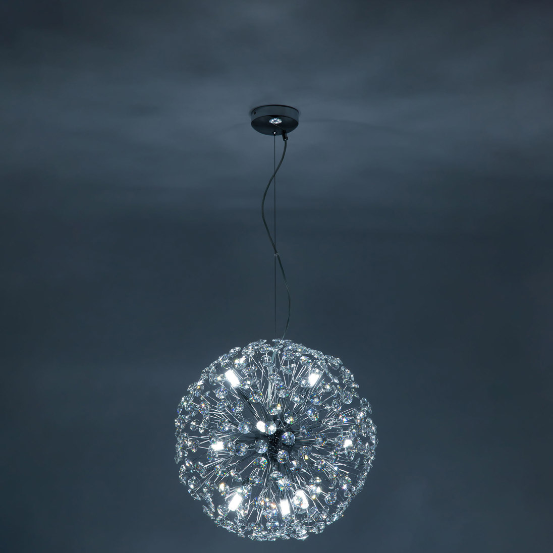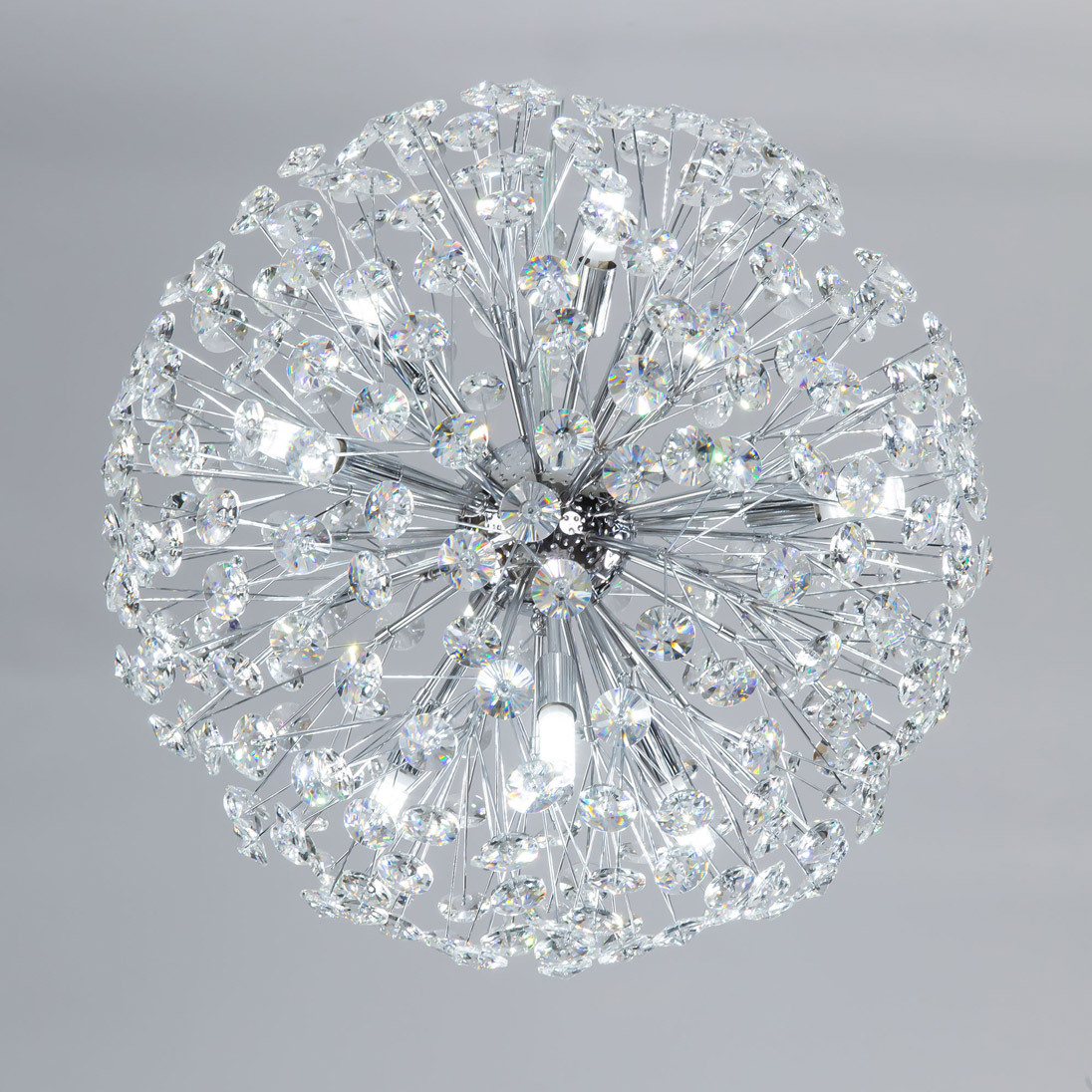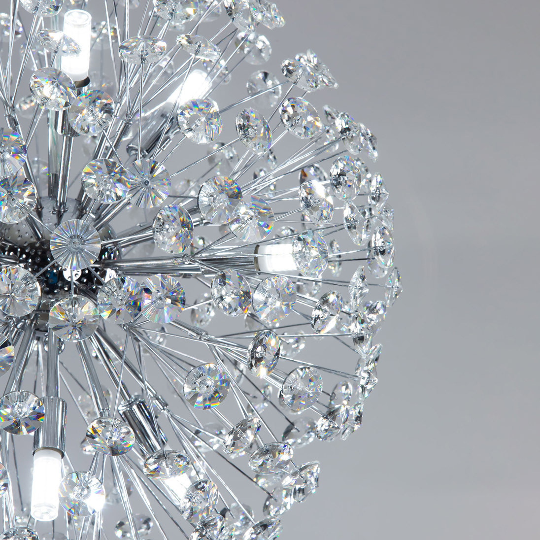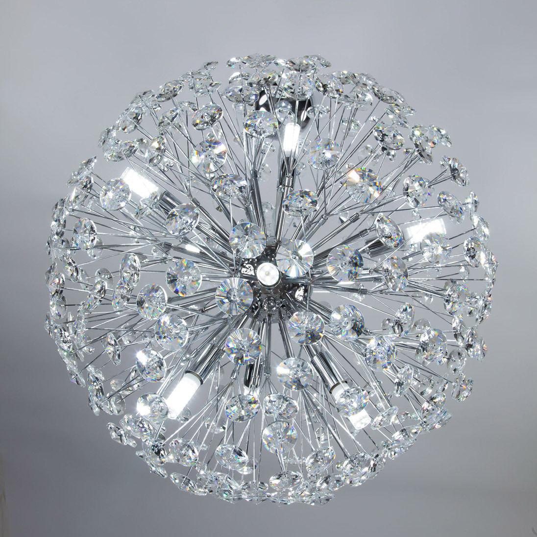 Потрясающая подвесная хрустальная люстра Eletto EL322P09.1 Betsy – это искусство современного стиля, привнесенное в ваш интерьер. Металлический глянцевый хромированный корпус олицетворяет утончённую элегантность. Оригинально ограненные хрустальные элементы, прозрачные как кристаллы, изыскано расположены на изящных стойках, придавая светильнику форму невесомого парящего шара.