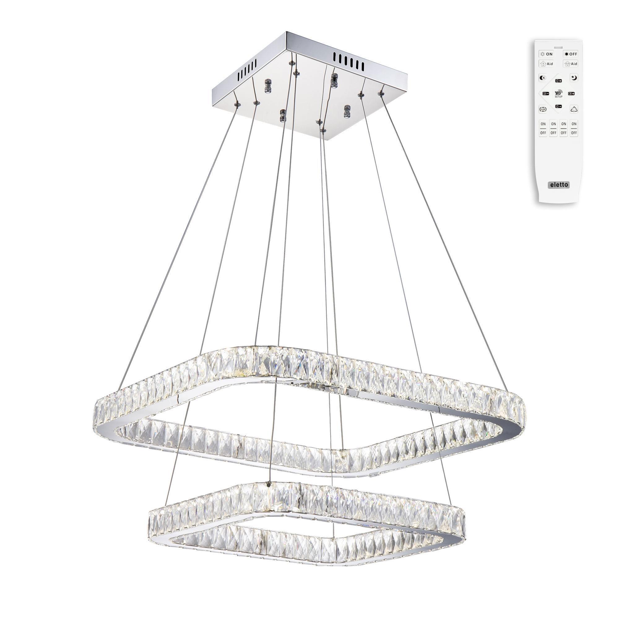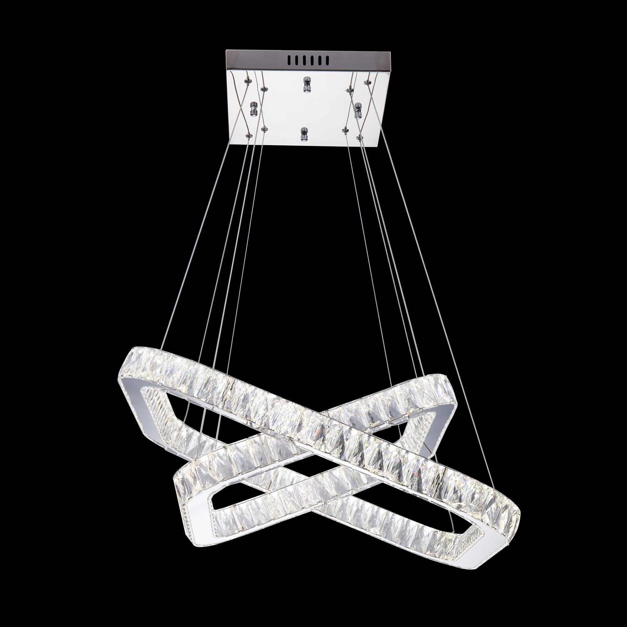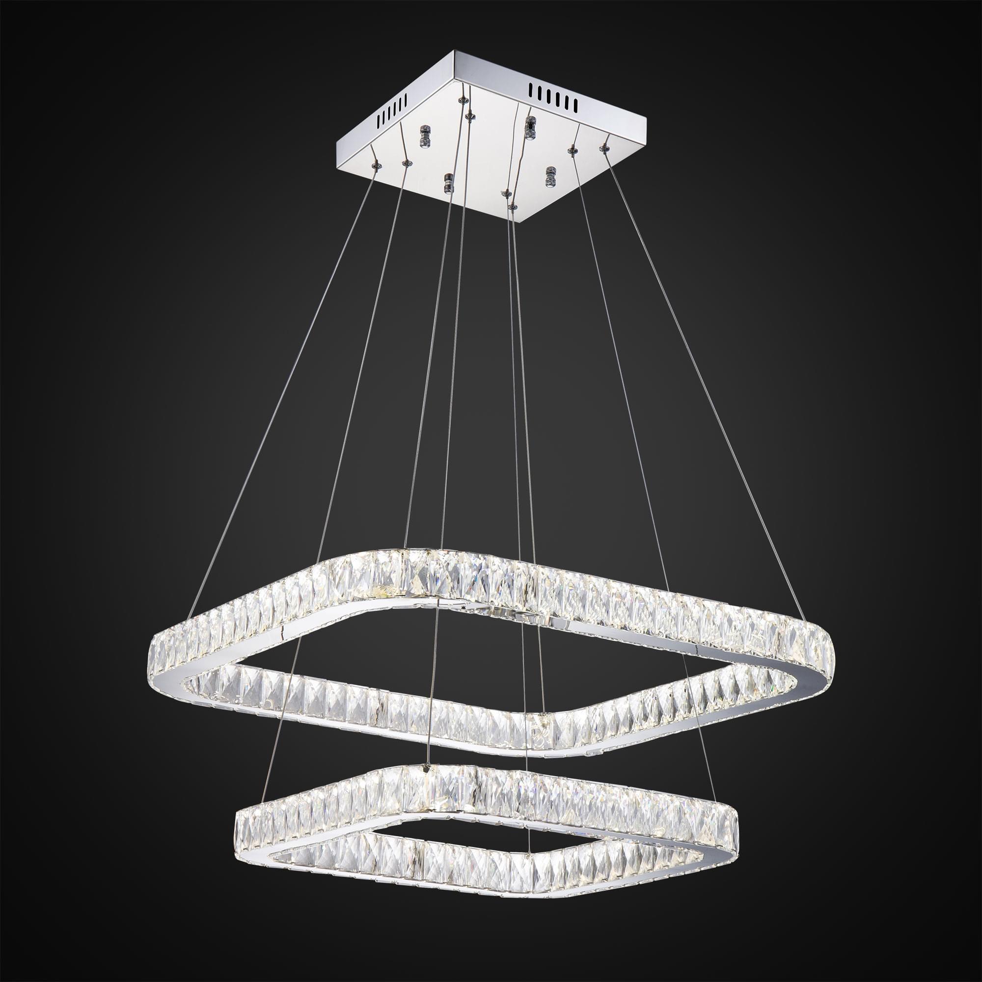 Корпус светильника металлический с глянцевым хромированным покрытием. Два хрустальных кольца квадратной формы, высоту и угол наклона каждого из которых можно легко изменить, подвешены на утончённых стальных тросиках. Размер светильника 70х70см, высота 25-160см. Источником света являются встроенные светодиоды мощностью 140Вт, свет безопасный для глаз, без мерцания и пульсаций.