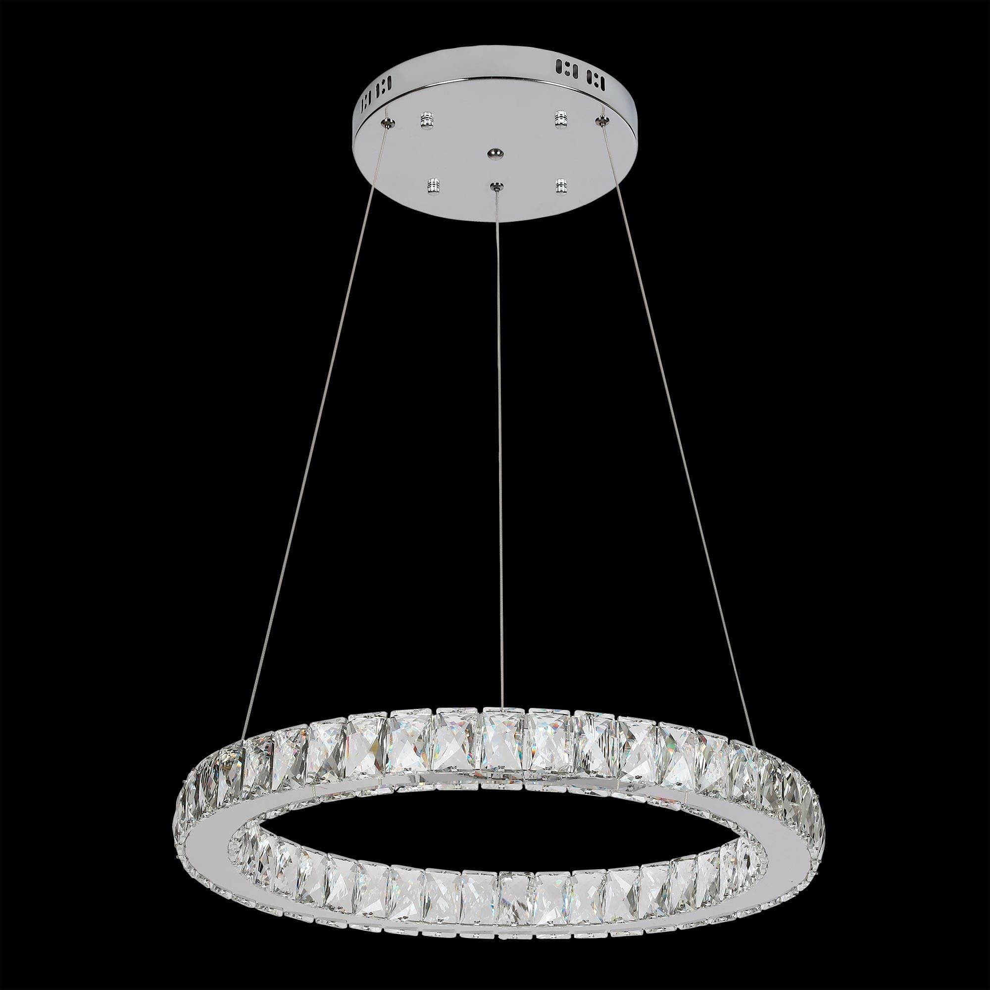 Корпус светильника металлический с глянцевым хромированным покрытием. Хрустальное кольцо изящно подвешено на утончённых стальных тросиках. Высота светильника регулируется при установке в диапазоне от 40см до 1,2м. Источником света являются встроенные светодиоды мощностью 80Вт.