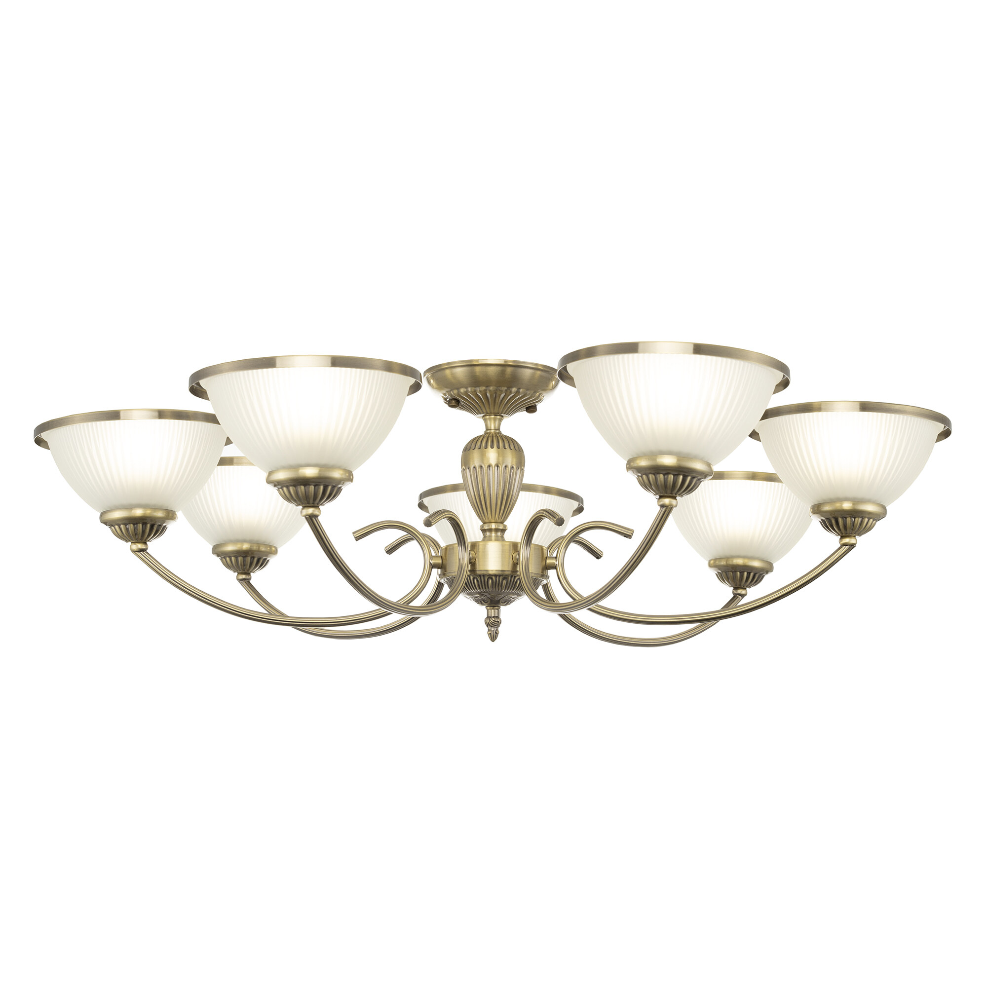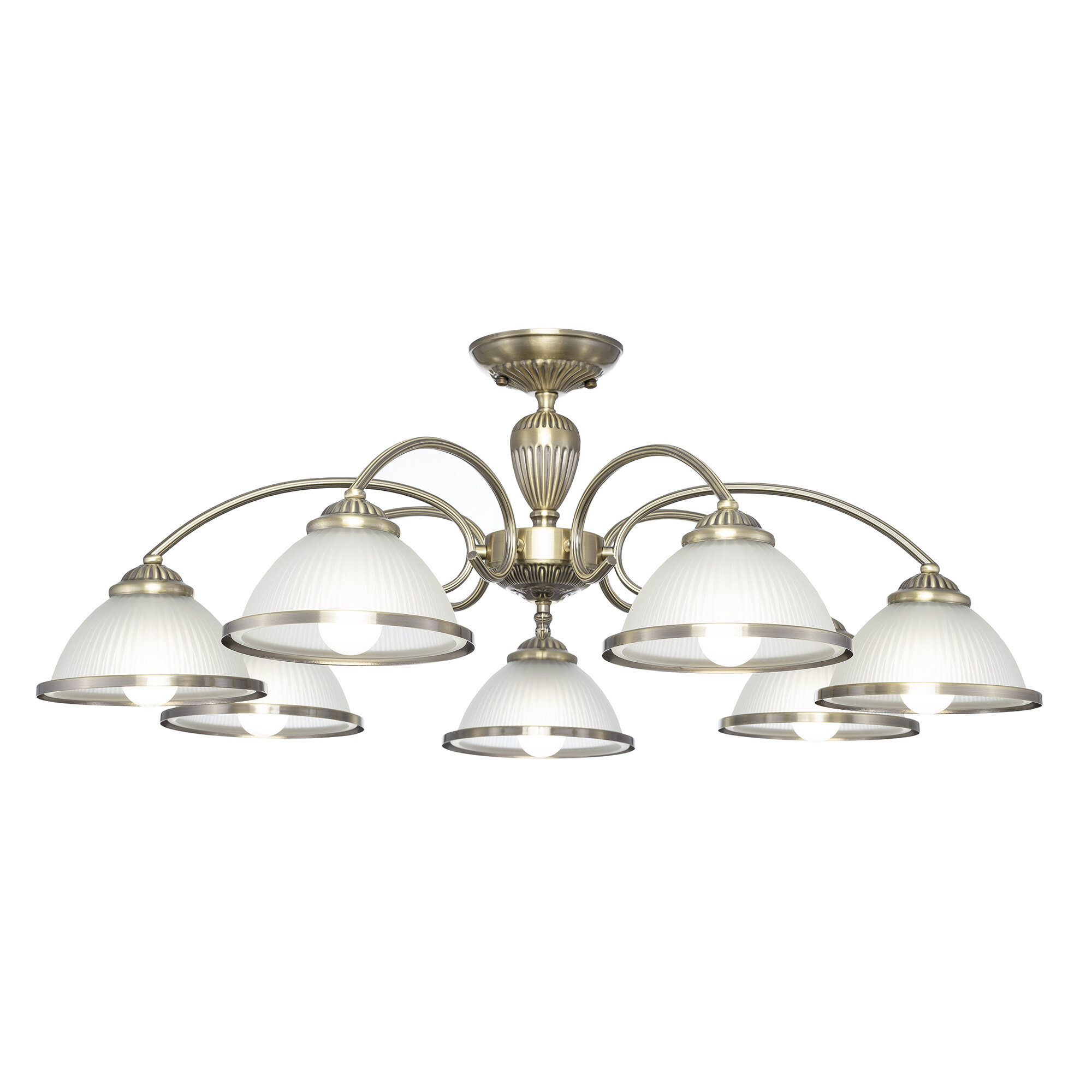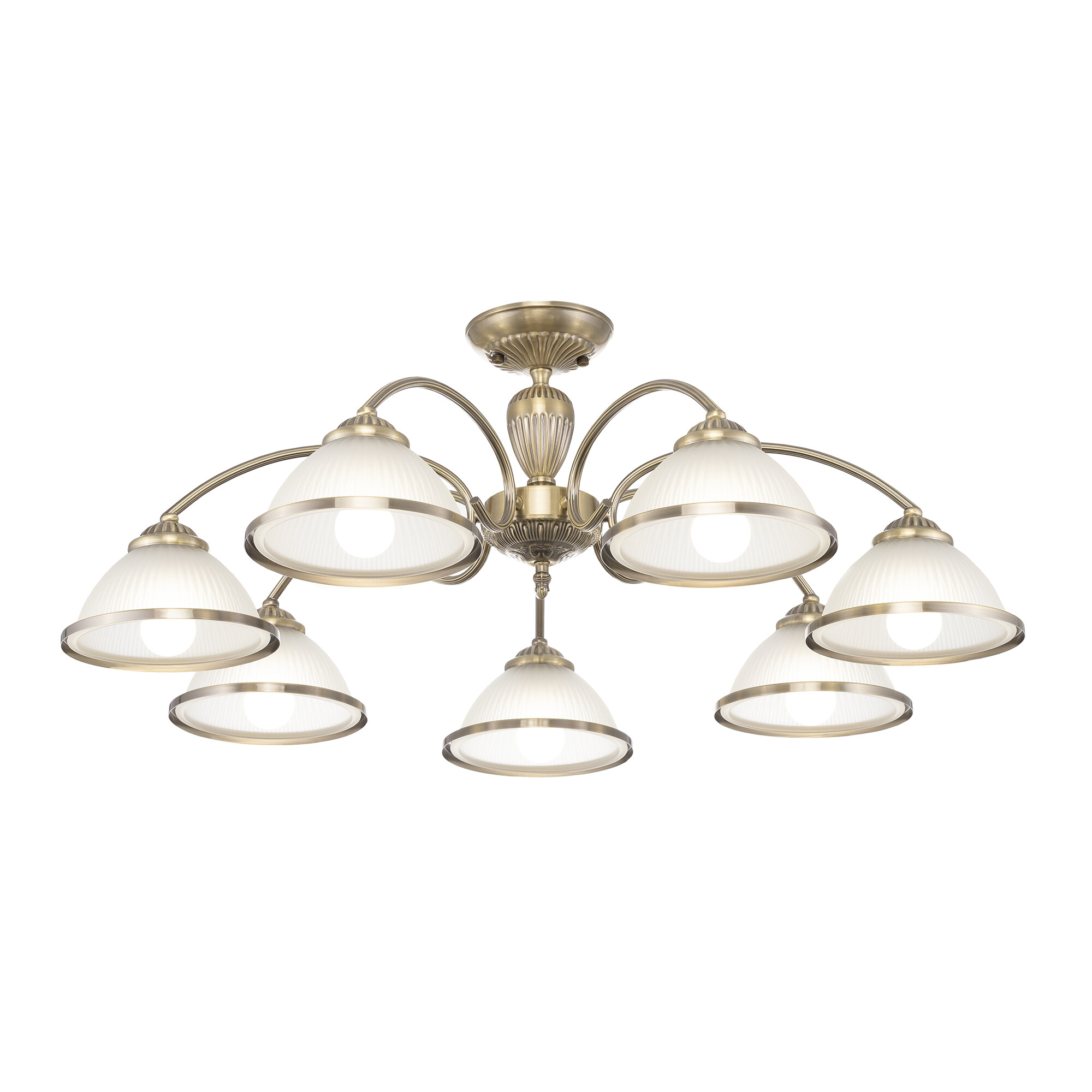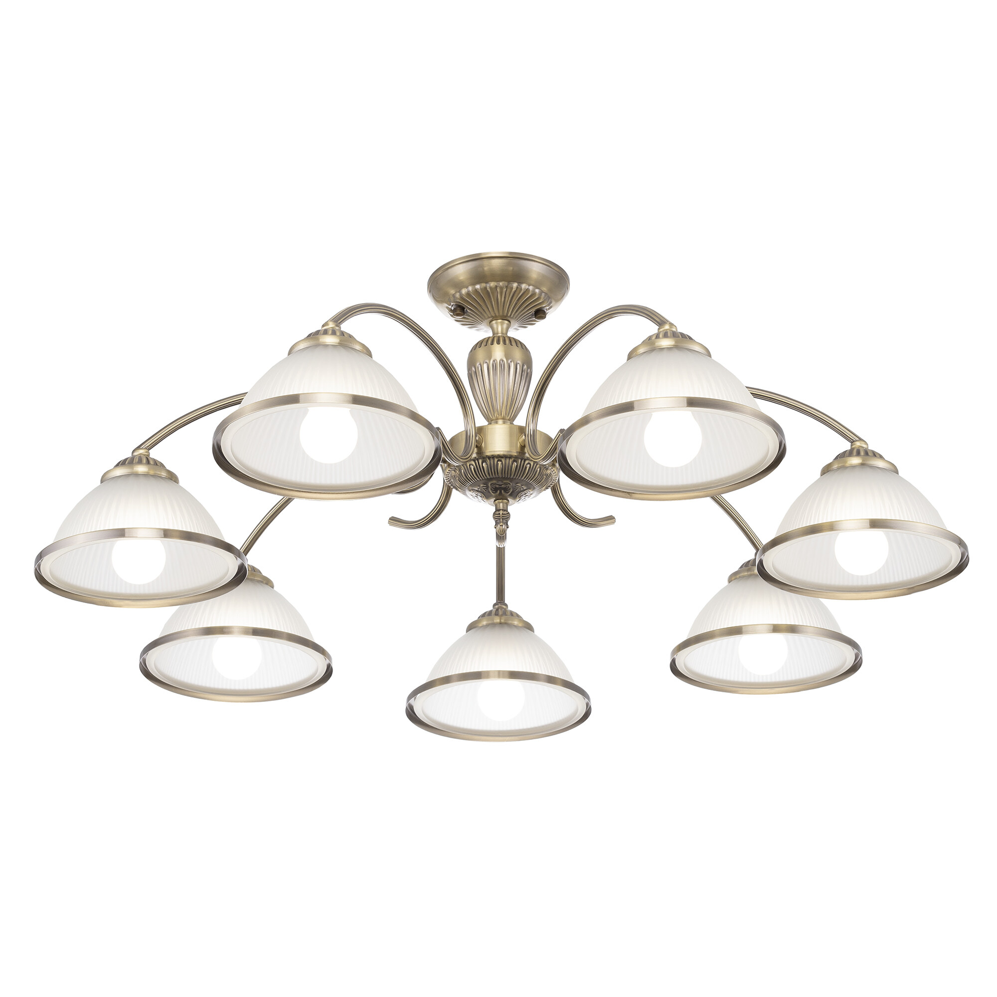 В изделии 7 ламп с цоколем Е27, максимальной мощностью для ламп накаливания 60Вт. Светодиодные лампы можно устанавливать более яркие. Светильник совместим с одноклавишным и двухклавишным выключателями, что позволяет регулировать уровень освещённости в любом помещении, будь то гостиная, спальня, кухня или кабинет. Подходит для всех видов потолков, в том числе натяжных, тип крепления – планка.