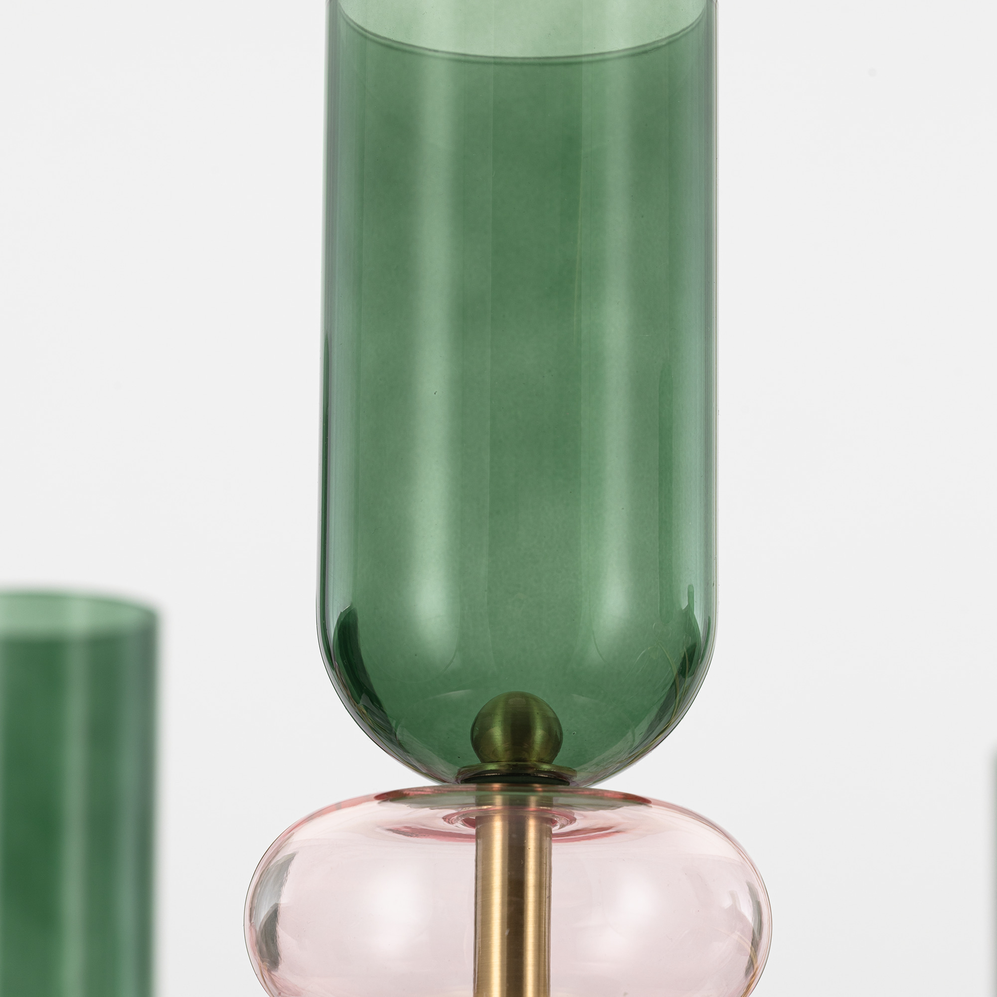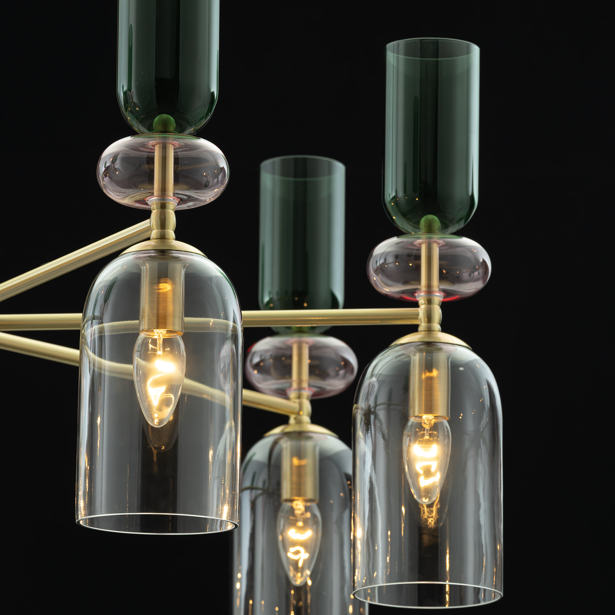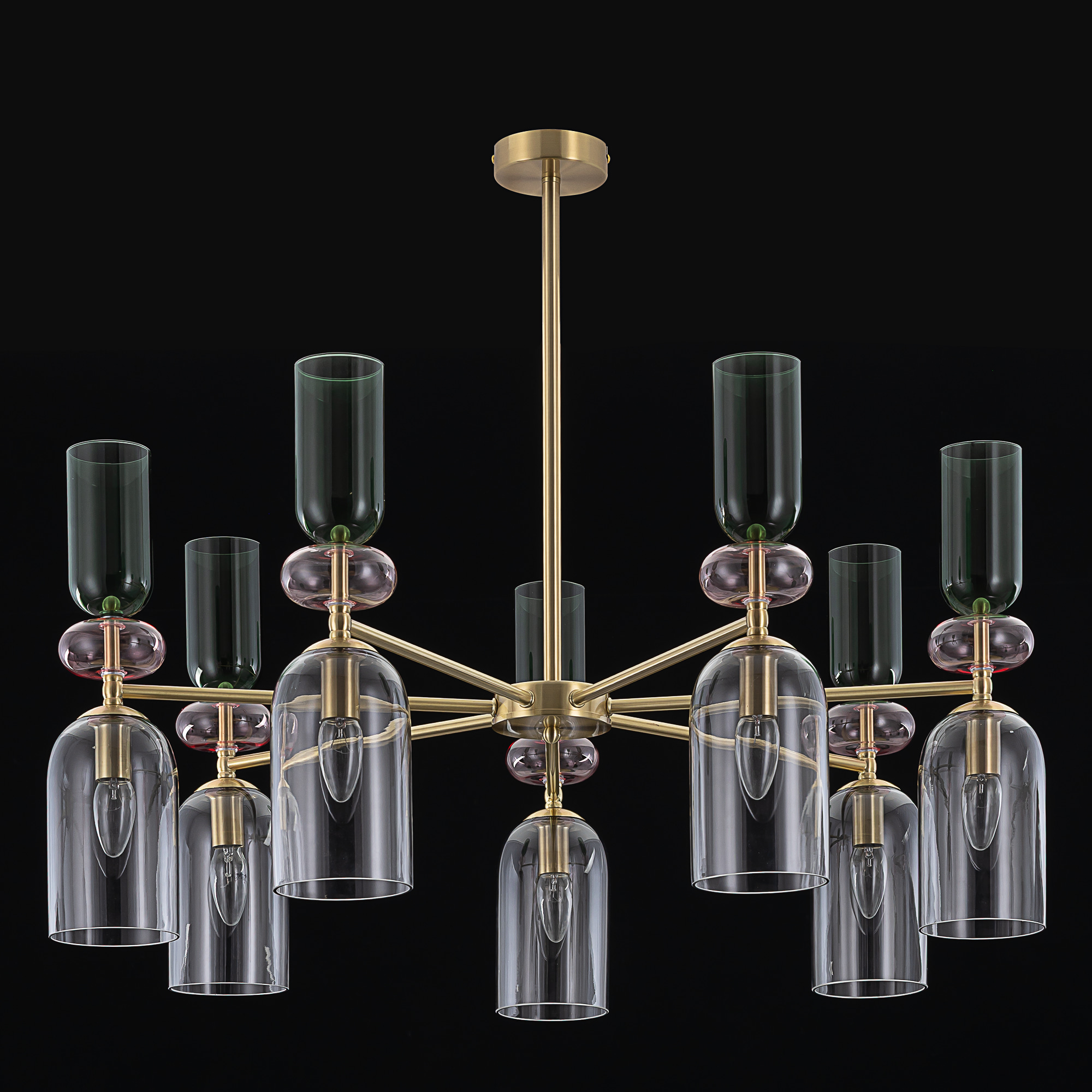 Каркас люстры из металлического сплава, стильного оттенка латунь. Изящные плафоны и декор — из прозрачного стекла с разноцветной тонировкой: розовой, зеленой и дымчатой. Оригинальное сочетание оттенков создает модный и комфортный свет.