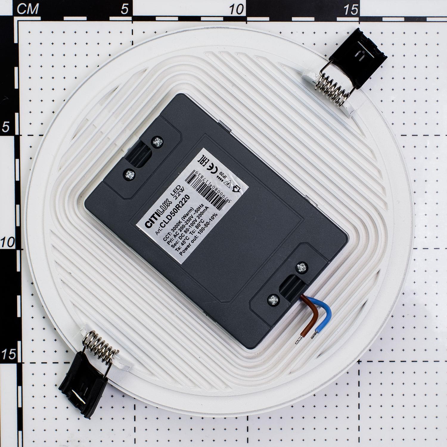 Изделие мощностью 22Вт, световой поток 1760Лм, цветовая температура – 3000К – тёплый свет, класс защиты IP20, осветит до 9м². Внешний диаметр светильника 17,5см, диаметр врезки 15,5см, глубина врезки 2см.