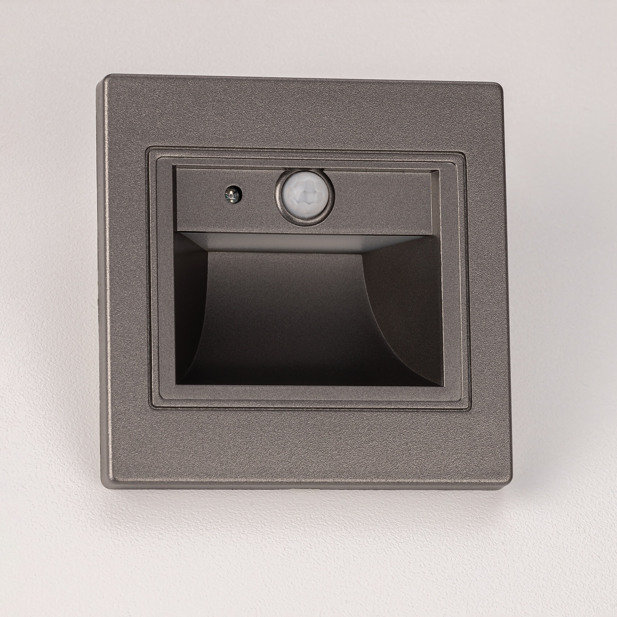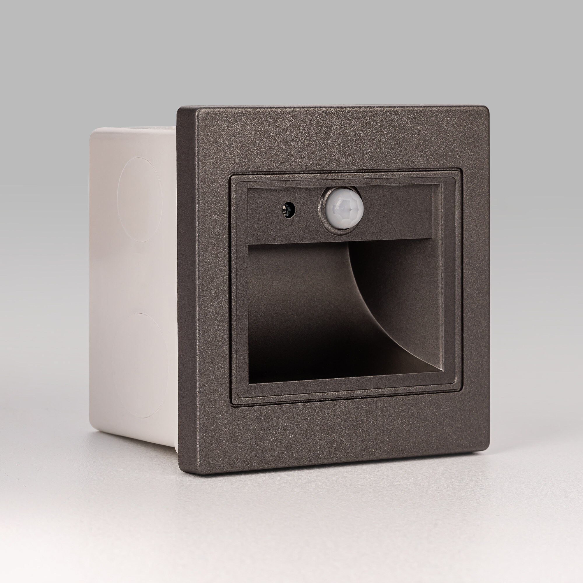 Светильник квадратной формы, корпус изготовлен из прочного полимера цвета графит. Для удобства монтажа, поставляется в комплекте с установочной коробкой.