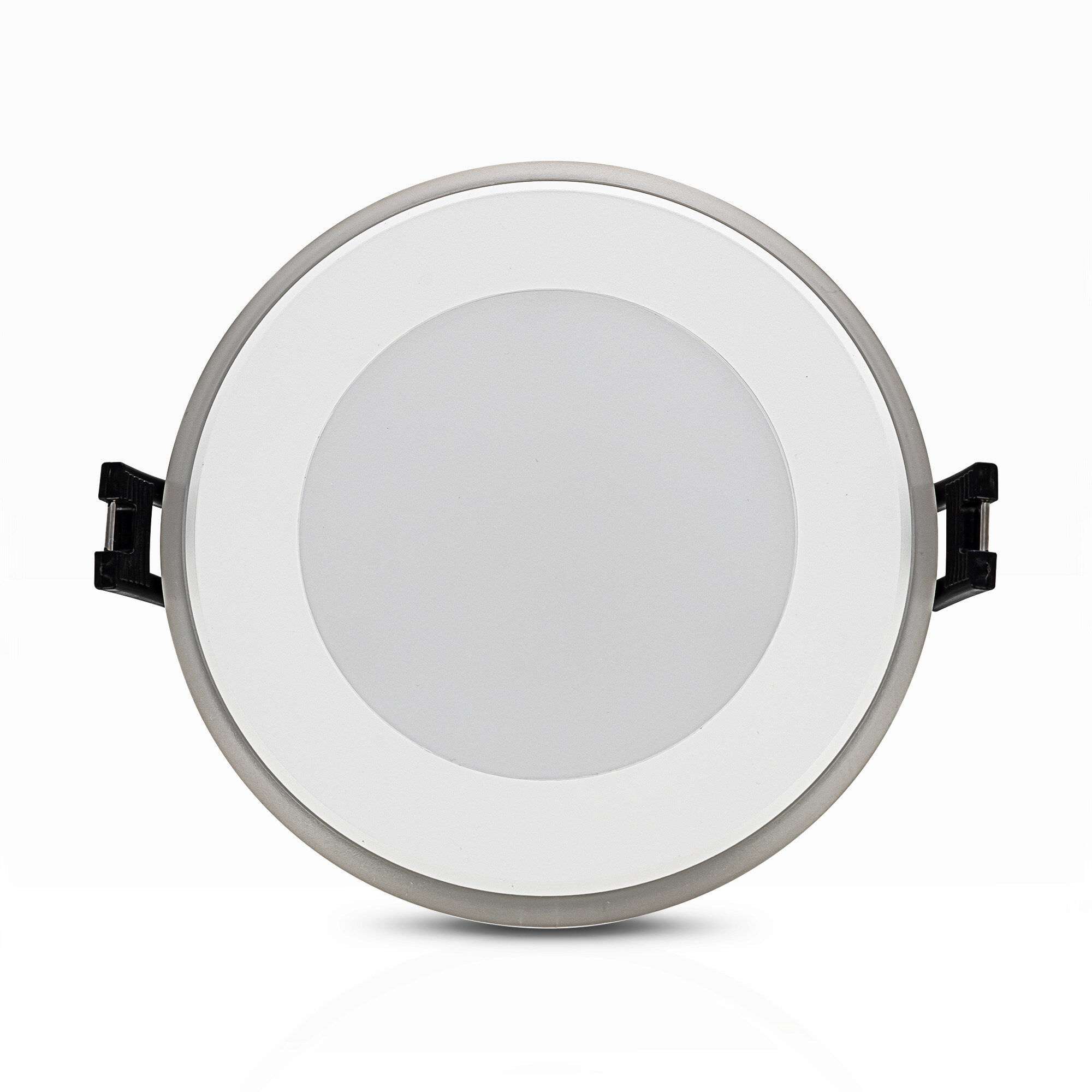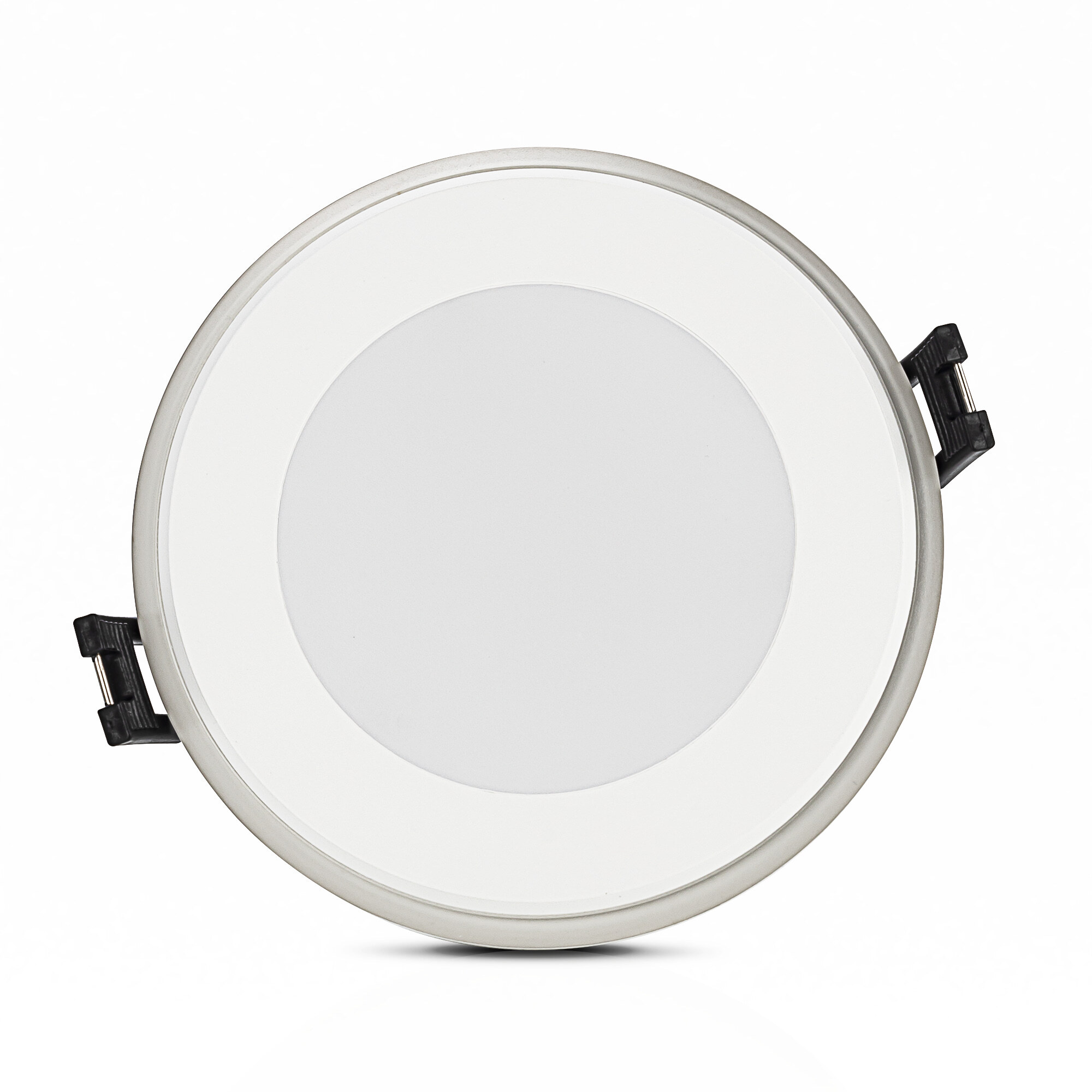Изделие мощностью 9Вт, световой поток 850Лм. Цветовая температуры основного света и подсветки на выбор 3000 - 4000 - 5500К. Установка осуществляется отдельными переключателями на тыльной стороне корпуса светильника. Класс защиты IP20.