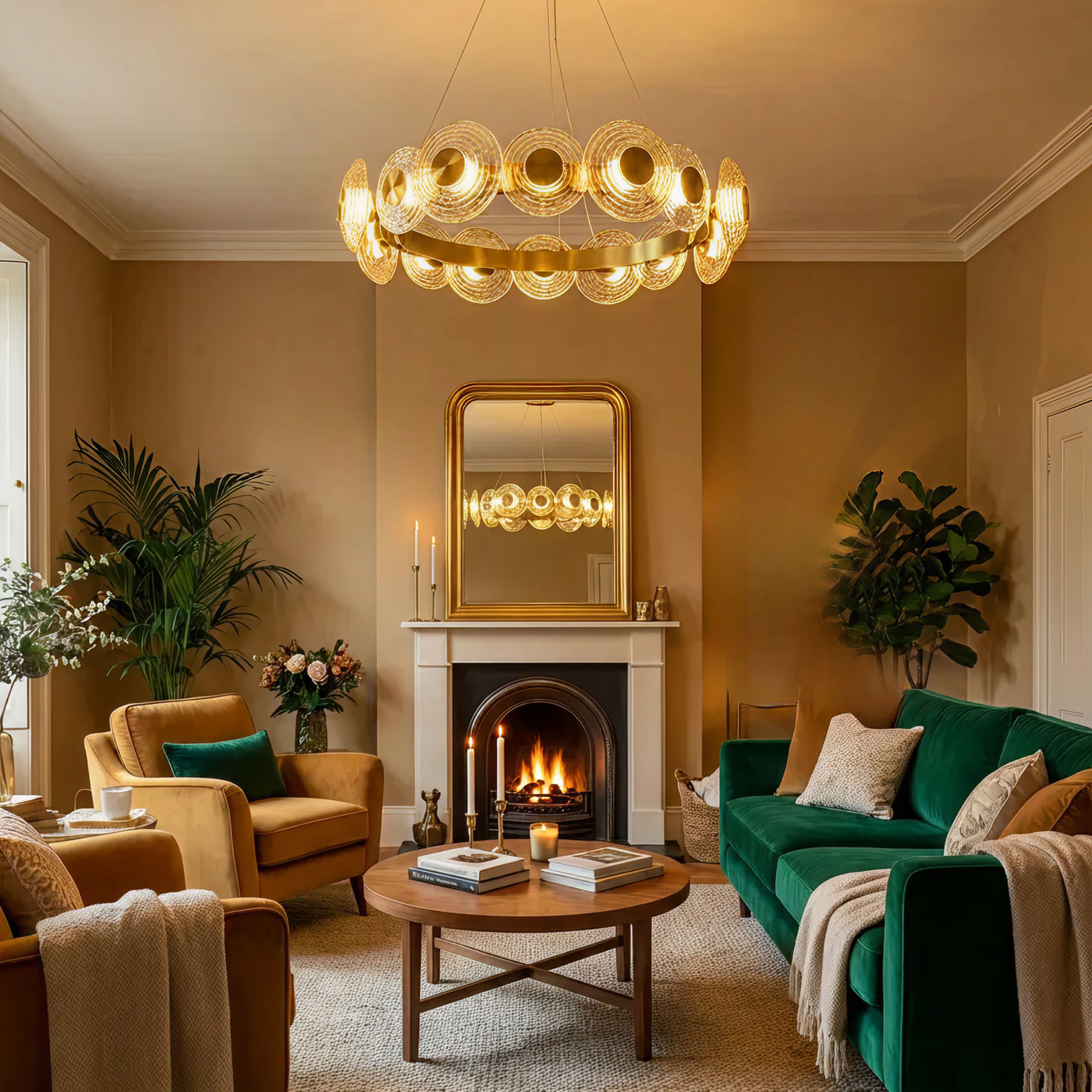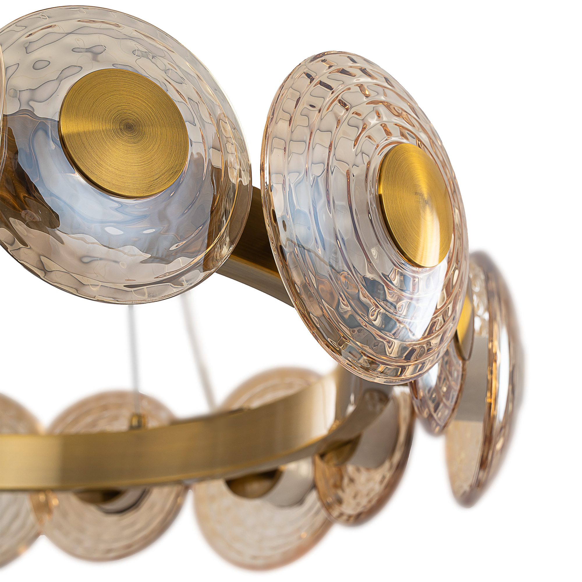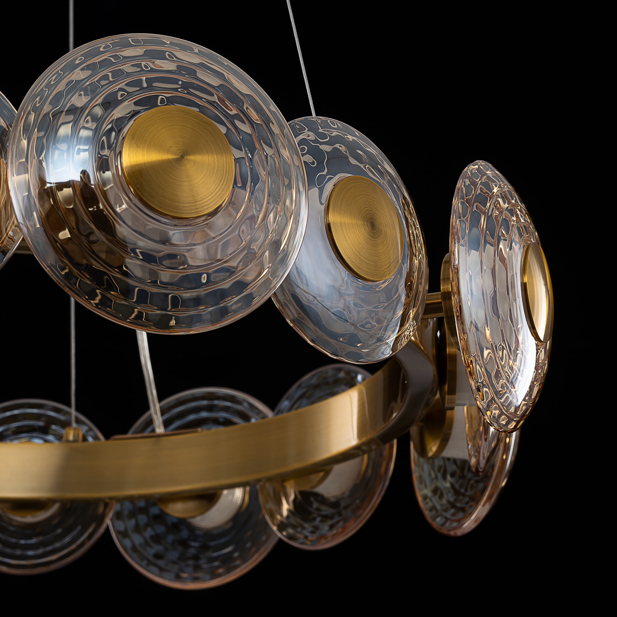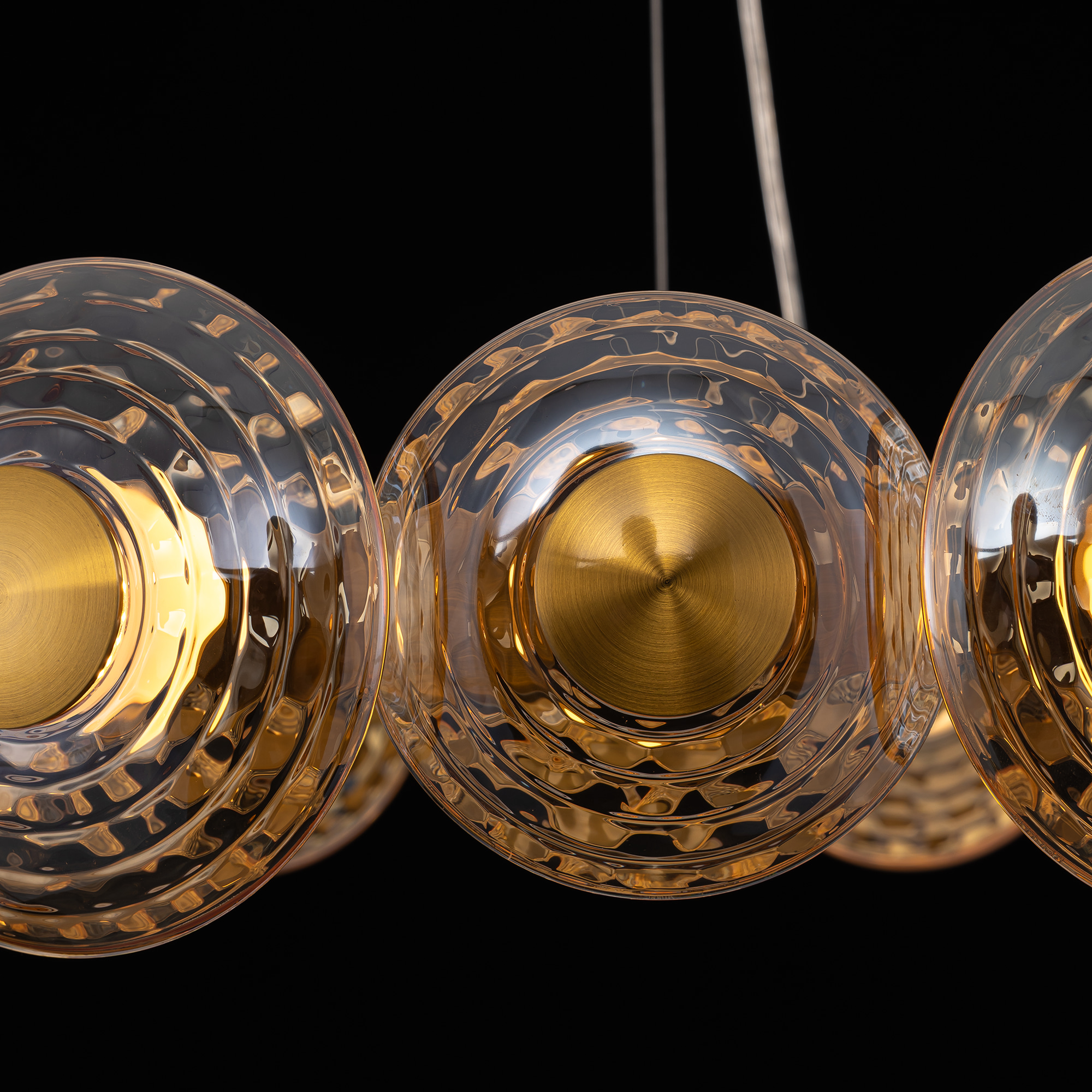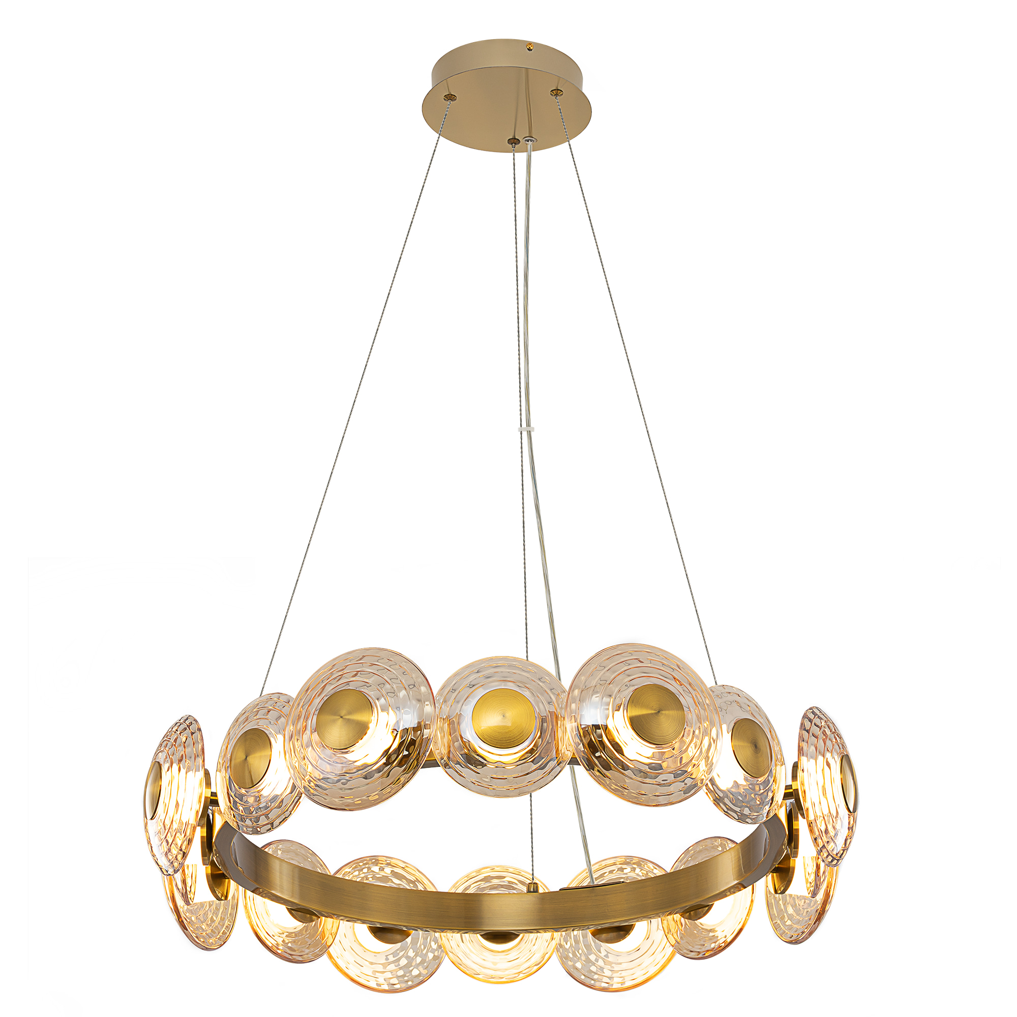 Корпус изготовлен из металла модного оттенка латуни. Круглые плафоны двух диаметров (13 и 15см) из стекла с насыщенной янтарной тонировкой расположены по кругу вокруг светодиодного модуля с рассеивателем из оптического полимера. Мощность изделия составляет 72Вт.
