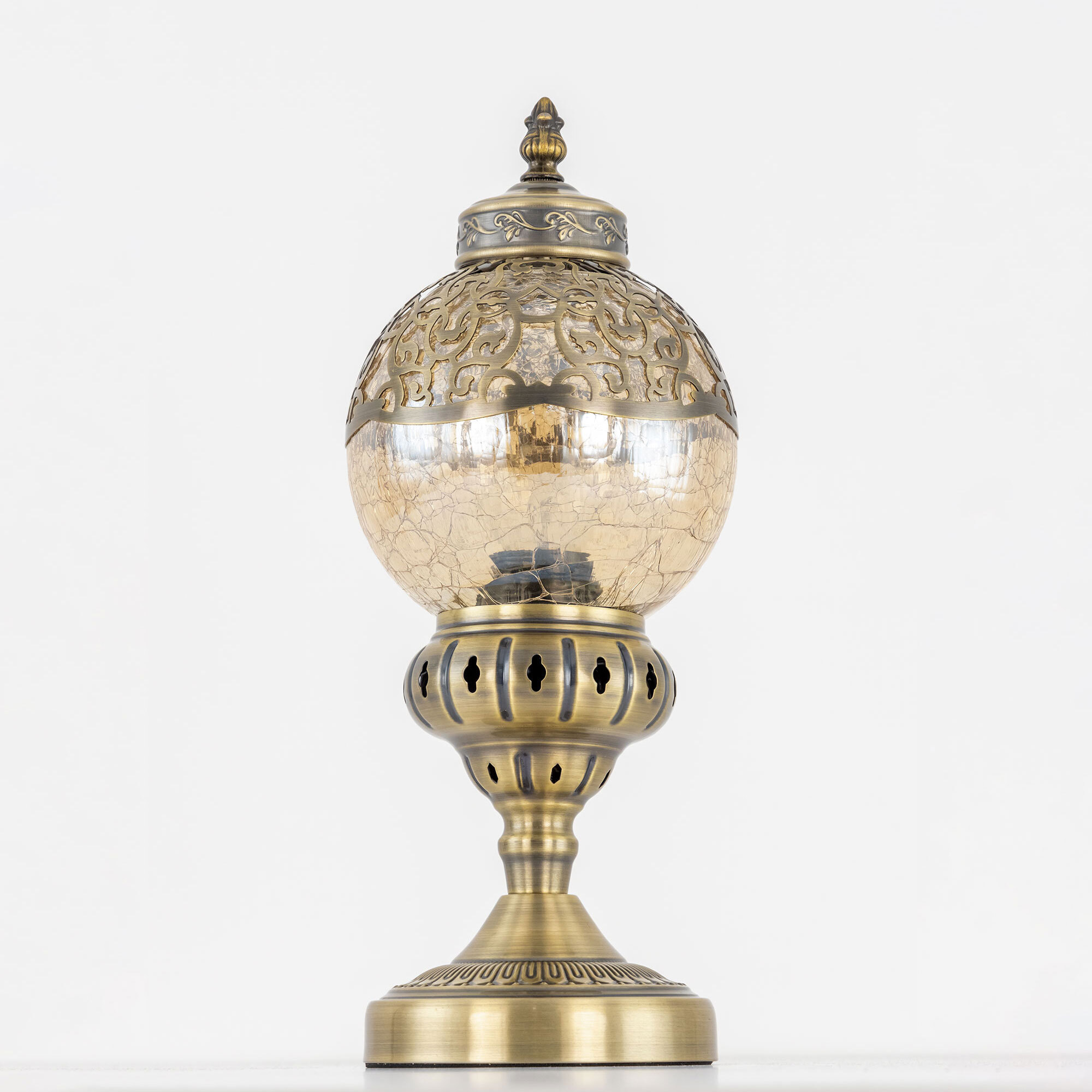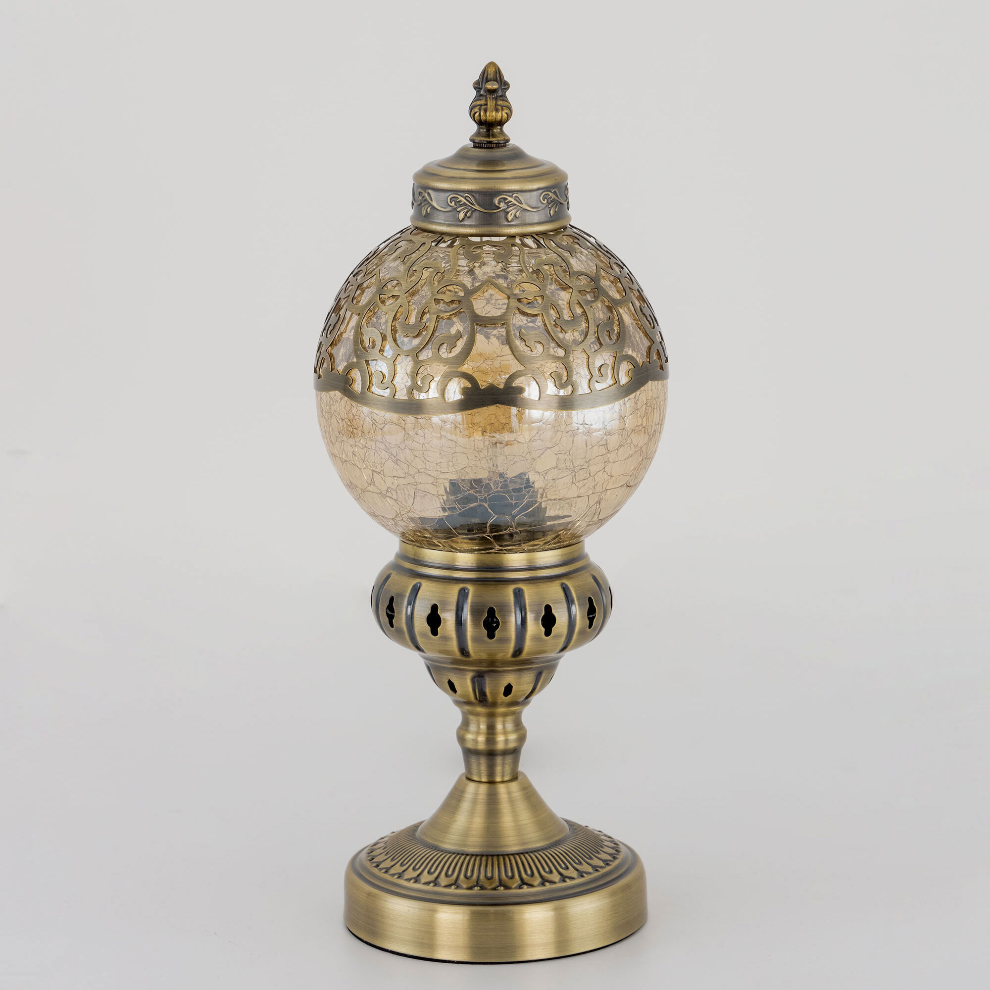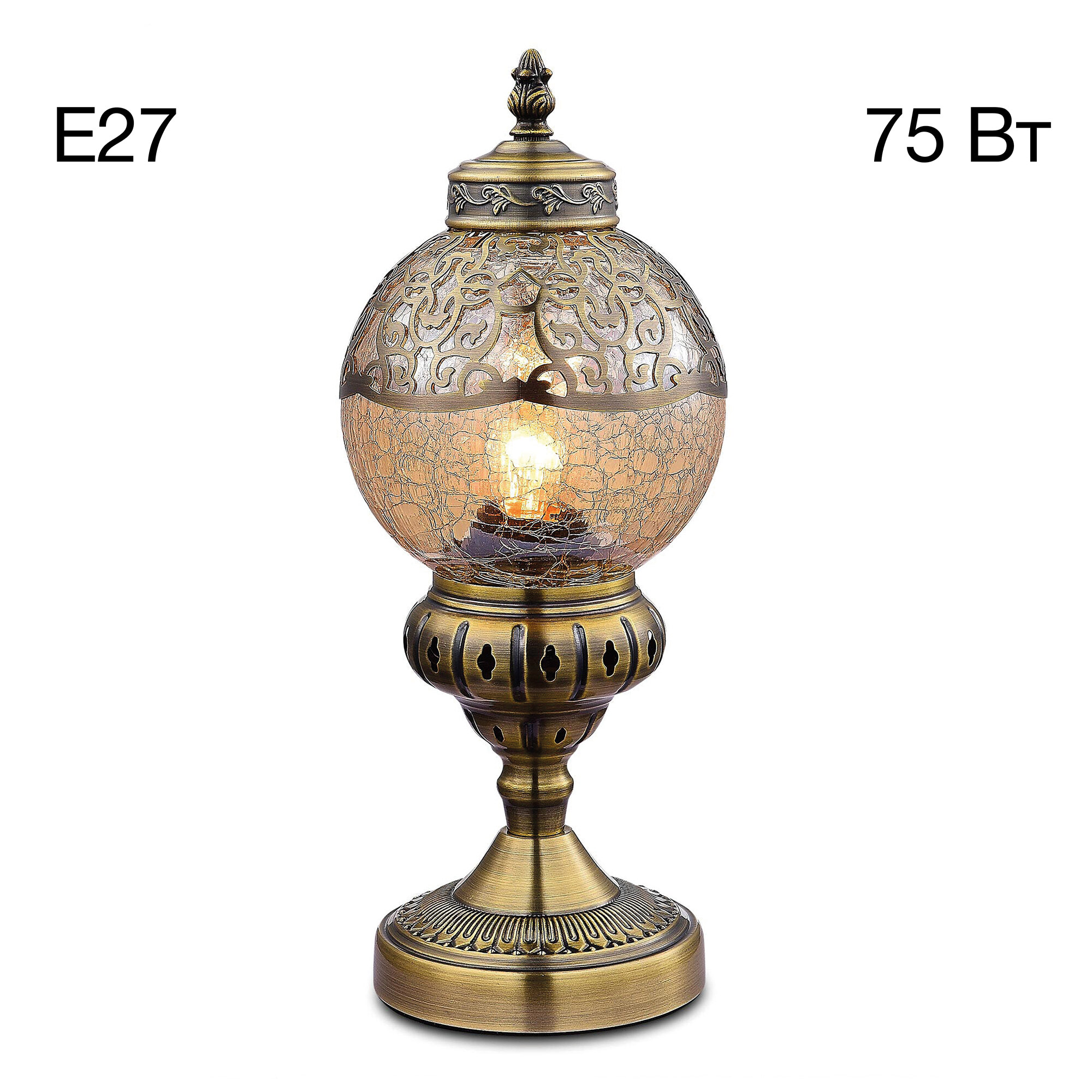 Восточная настольная лампа Citilux Каир CL419813 бронзового цвета. Основание светильника металлическое. Плафон в форме шара, изготовлен из прозрачного стекла оттенка шампань и украшен декоративными, ажурными элементами. В изделии одна лампочка с цоколем Е27, максимальной мощностью для ламп накаливания 75Вт, светодиодные лампы можно устанавливать более яркие. Высота светильника 37см, диаметр 15см. Длина шнура 1,7м, выключатель находится на расстоянии 20см от основания. Настольная лампа Citilux Каир CL419813 прекрасный вариант для атмосферного освещения квартир и загородных домов, уютных кафе, баров и ресторанов, оформленных в восточном стиле.Citilux CL419 CAIRO: Вдохновение в каждом луче.