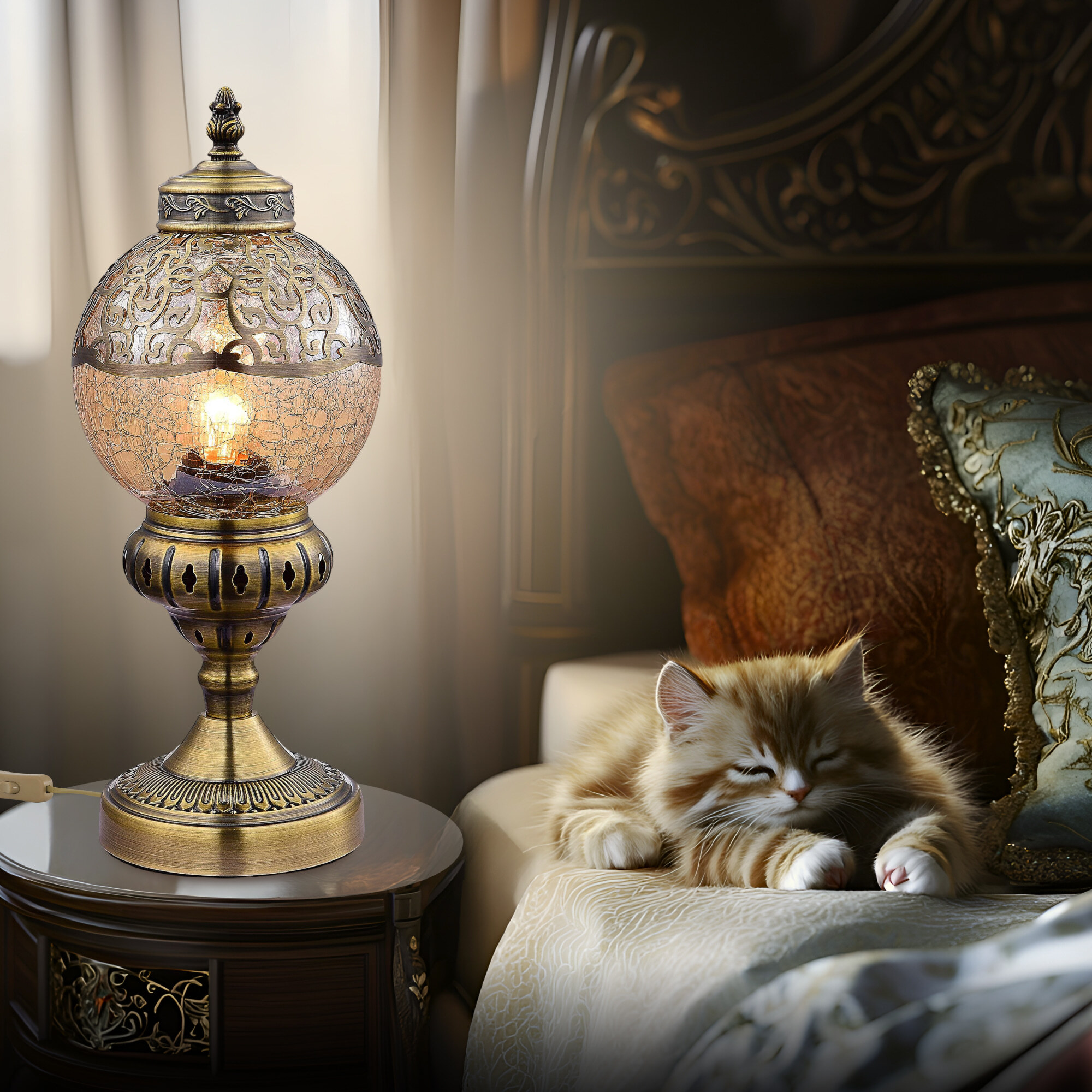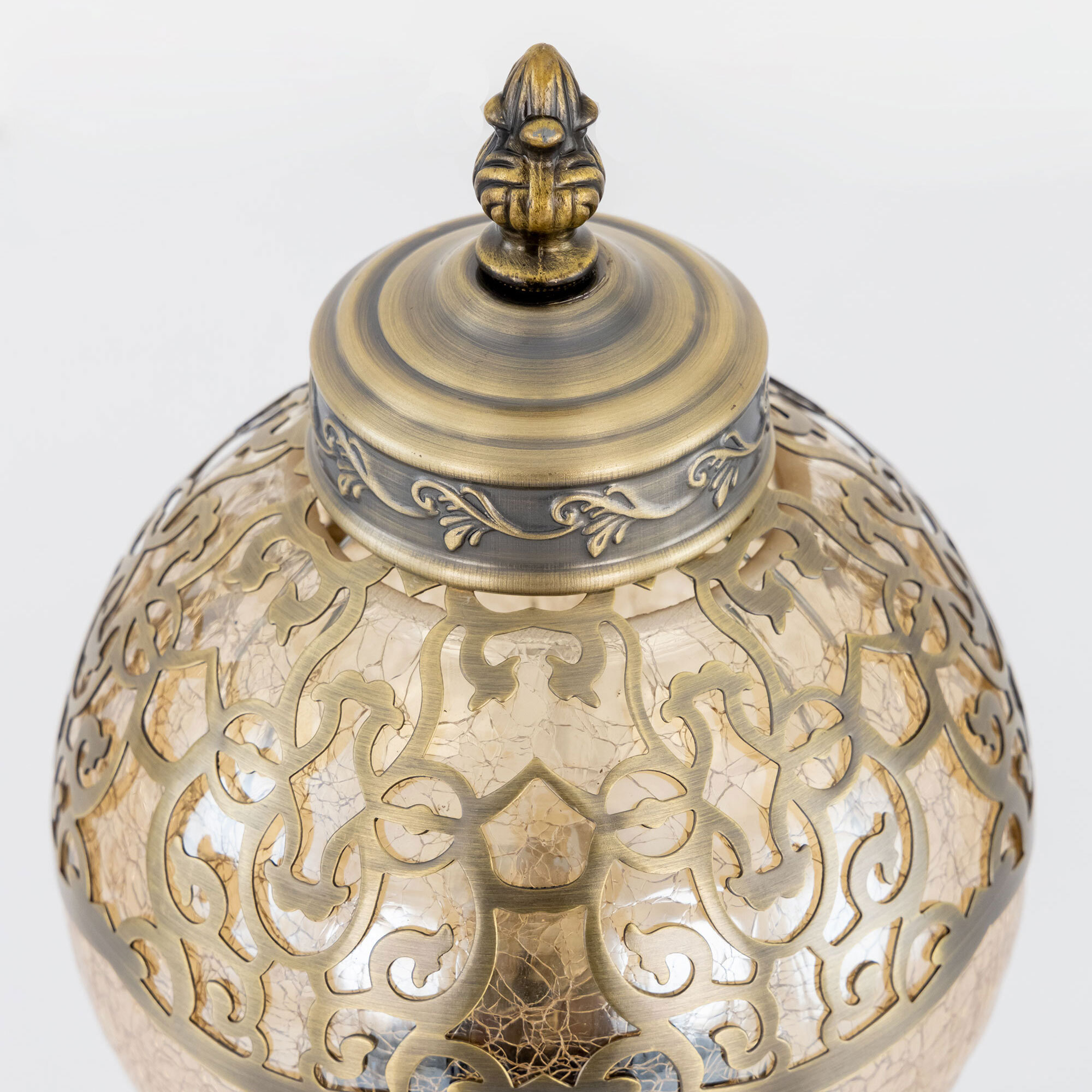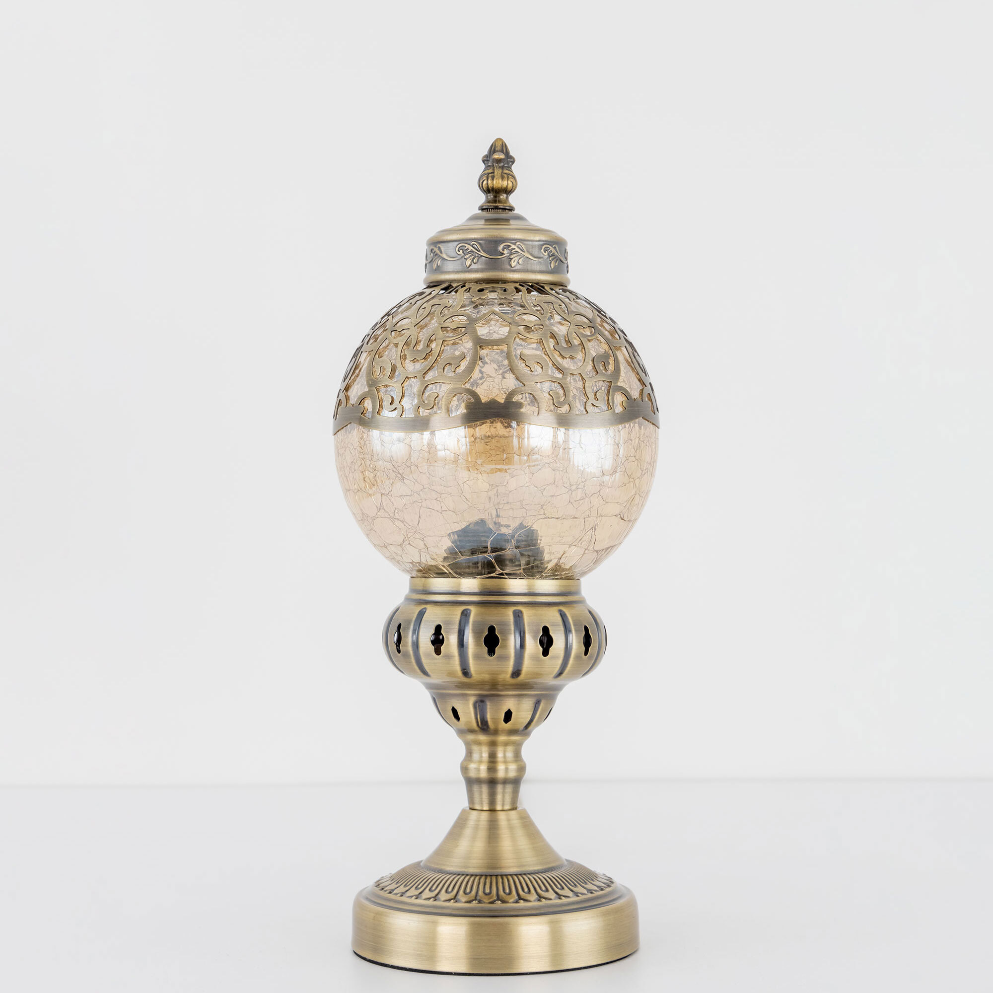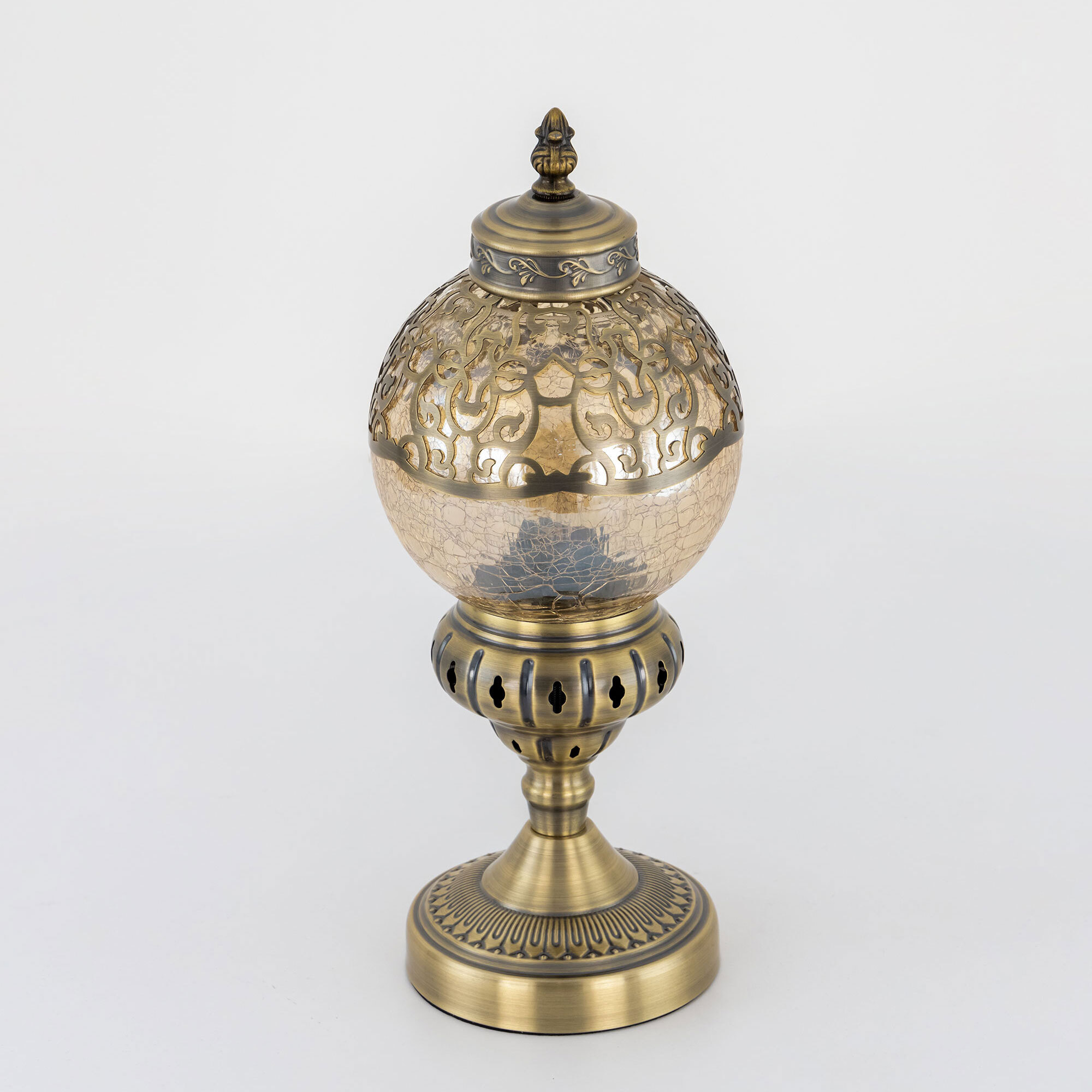 Восточная настольная лампа Citilux Каир CL419813 бронзового цвета. Основание светильника металлическое. Плафон в форме шара, изготовлен из прозрачного стекла оттенка шампань и украшен декоративными, ажурными элементами. В изделии одна лампочка с цоколем Е27, максимальной мощностью для ламп накаливания 75Вт, светодиодные лампы можно устанавливать более яркие. Высота светильника 37см, диаметр 15см. Длина шнура 1,7м, выключатель находится на расстоянии 20см от основания. Настольная лампа Citilux Каир CL419813 прекрасный вариант для атмосферного освещения квартир и загородных домов, уютных кафе, баров и ресторанов, оформленных в восточном стиле.Citilux CL419 CAIRO: Вдохновение в каждом луче.