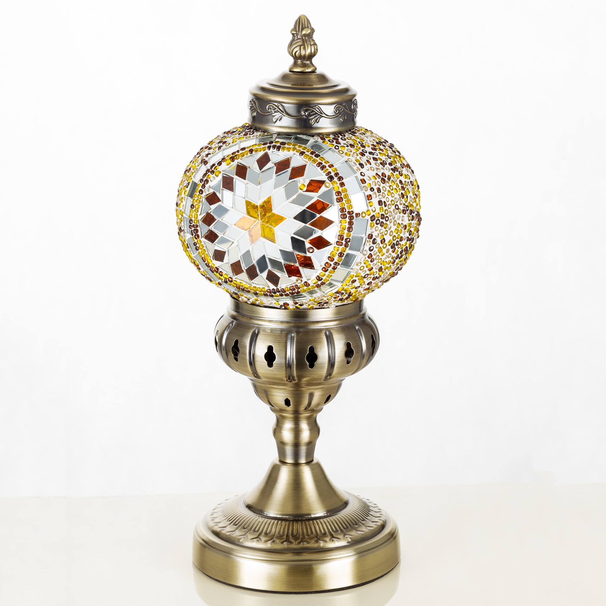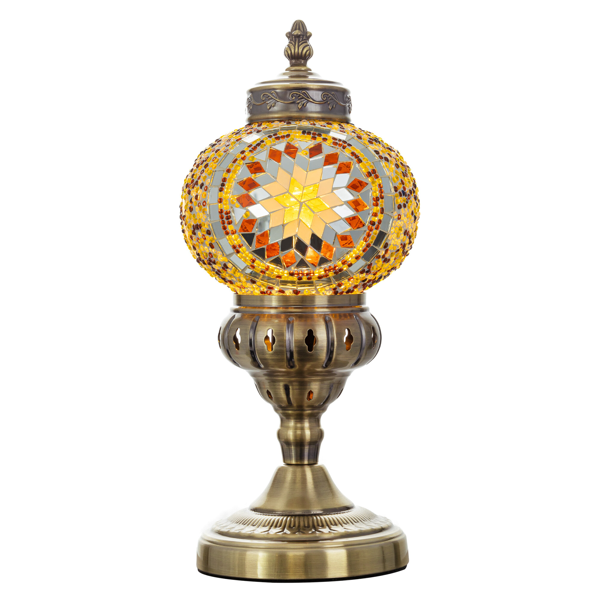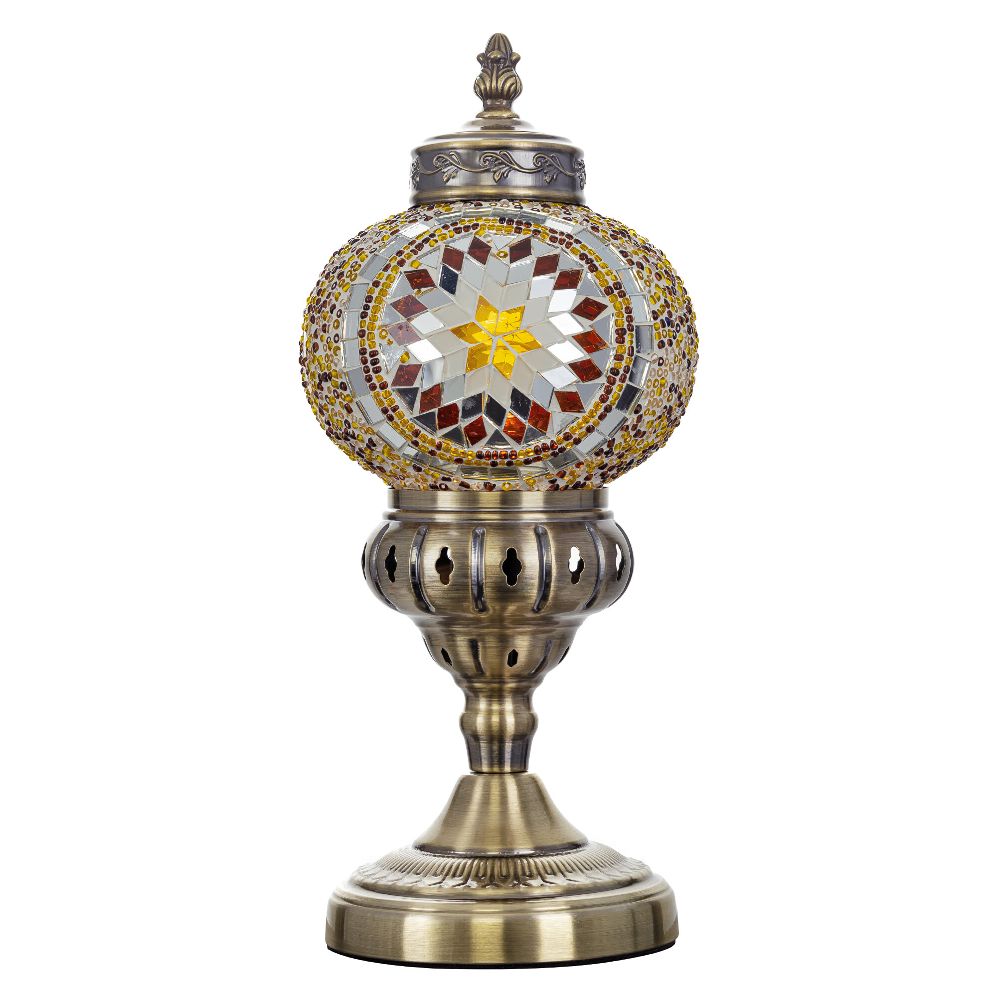 Погрузитесь в атмосферу таинственного Востока с настольным светильником Citilux Каир CL419815! Металлический корпус цвета благородной бронзы украшен изысканной чеканкой, а плафон в форме шара, декорированный стеклянной мозаикой с янтарными оттенками, создаёт мягкое, тёплое свечение, наполняющее пространство уютом и гармонией.