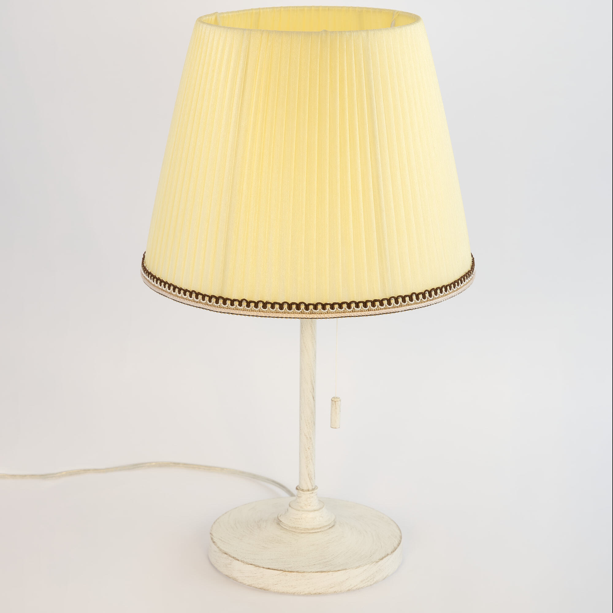 Настольный светильник Ситилюкс Линц CL402723 с тканевым абажуром и удобным выключателем. Основание металлическое, молочного цвета с золотистой патиной. Плиссированный абажур из полупрозрачной органзы кремового цвета декорирован изящной тесьмой. В изделии 1 лампа с цоколем Е27 максимальной мощностью для ламп накаливания 40Вт (в комплект не входит, приобретается отдельно). Светодиодные лампы можно устанавливать более яркие. Выключатель типа сонетка («дёргалка») находится на основании. Высота светильника 45см, диаметр 28,5см, длина сетевого провод 1,8м.