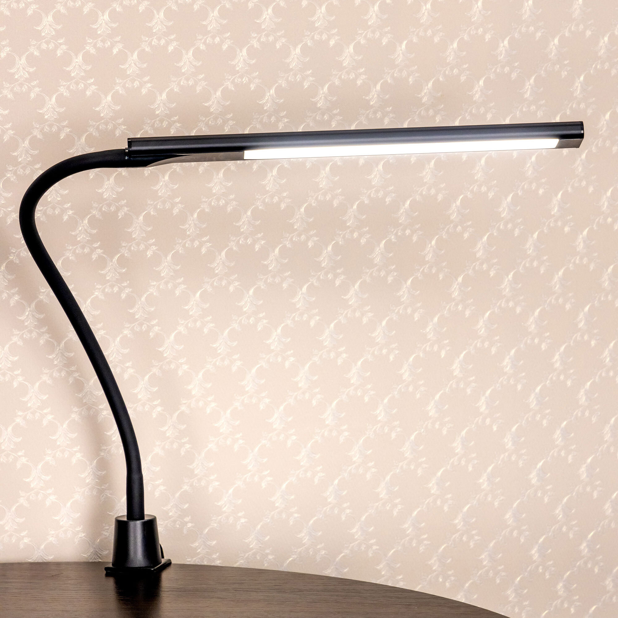 Удобное крепление – струбцина надежно фиксирует лампу на столе или полке.
