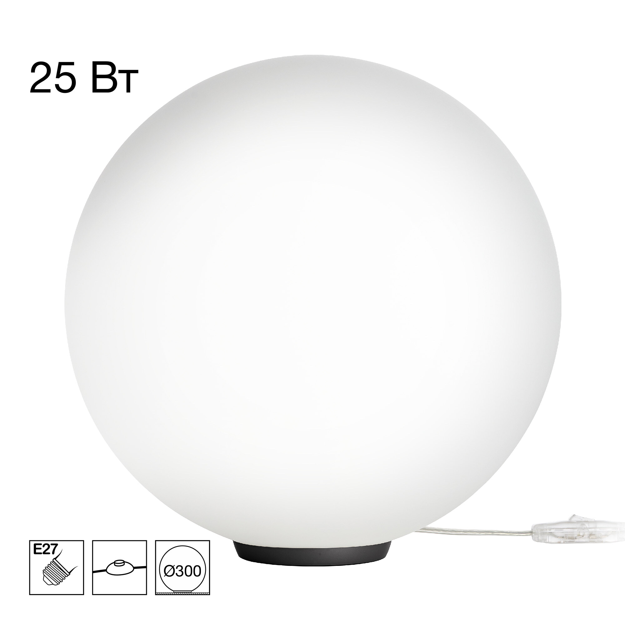 На черном основании высотой 12мм из высокопрочного полимера располагается белый матовый плафон-сфера диаметром 30см, изготовленный из специализированного оптического полимера. Удобный выключатель располагается на проводе.