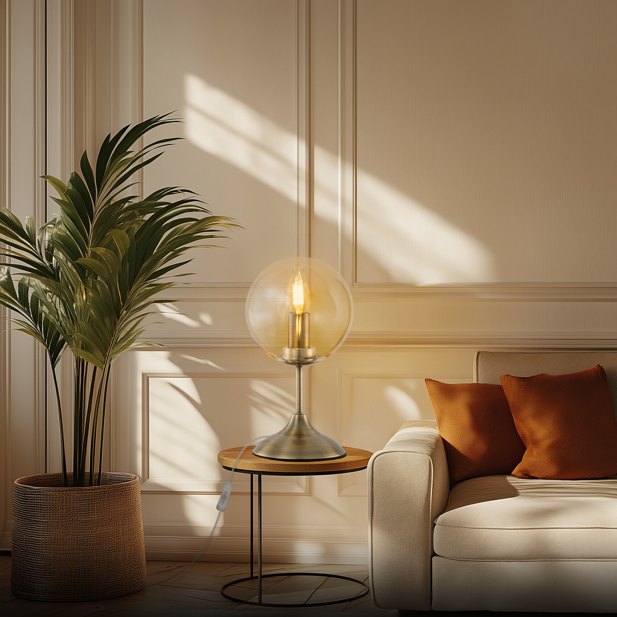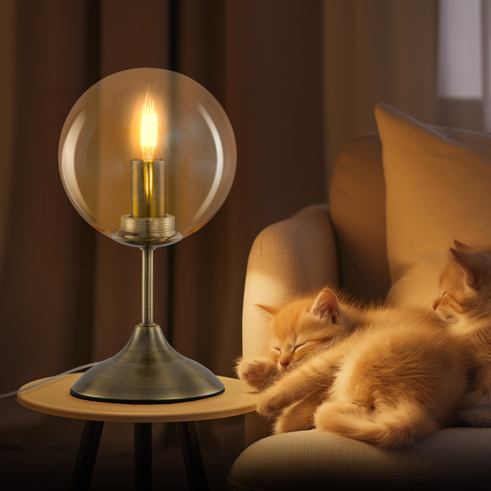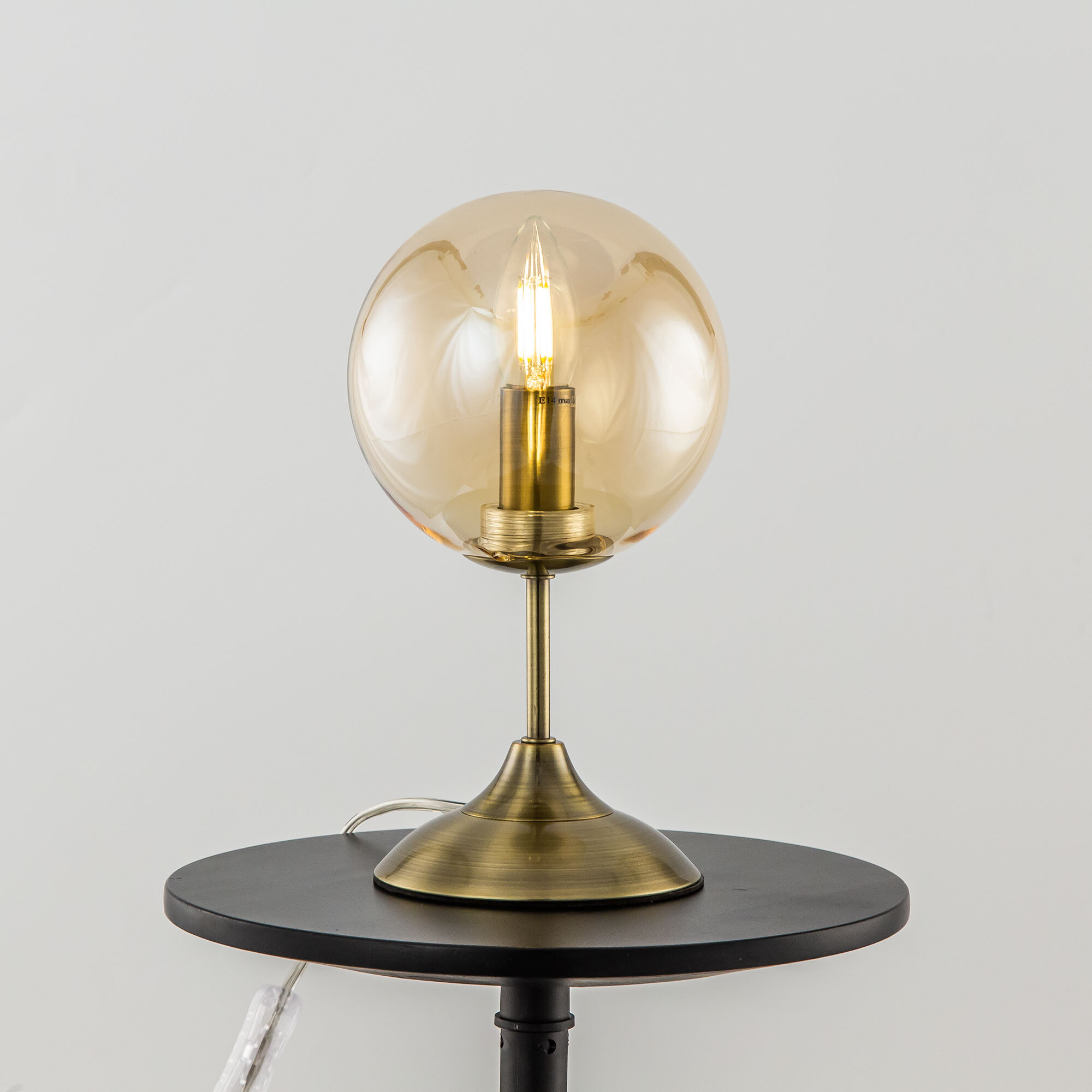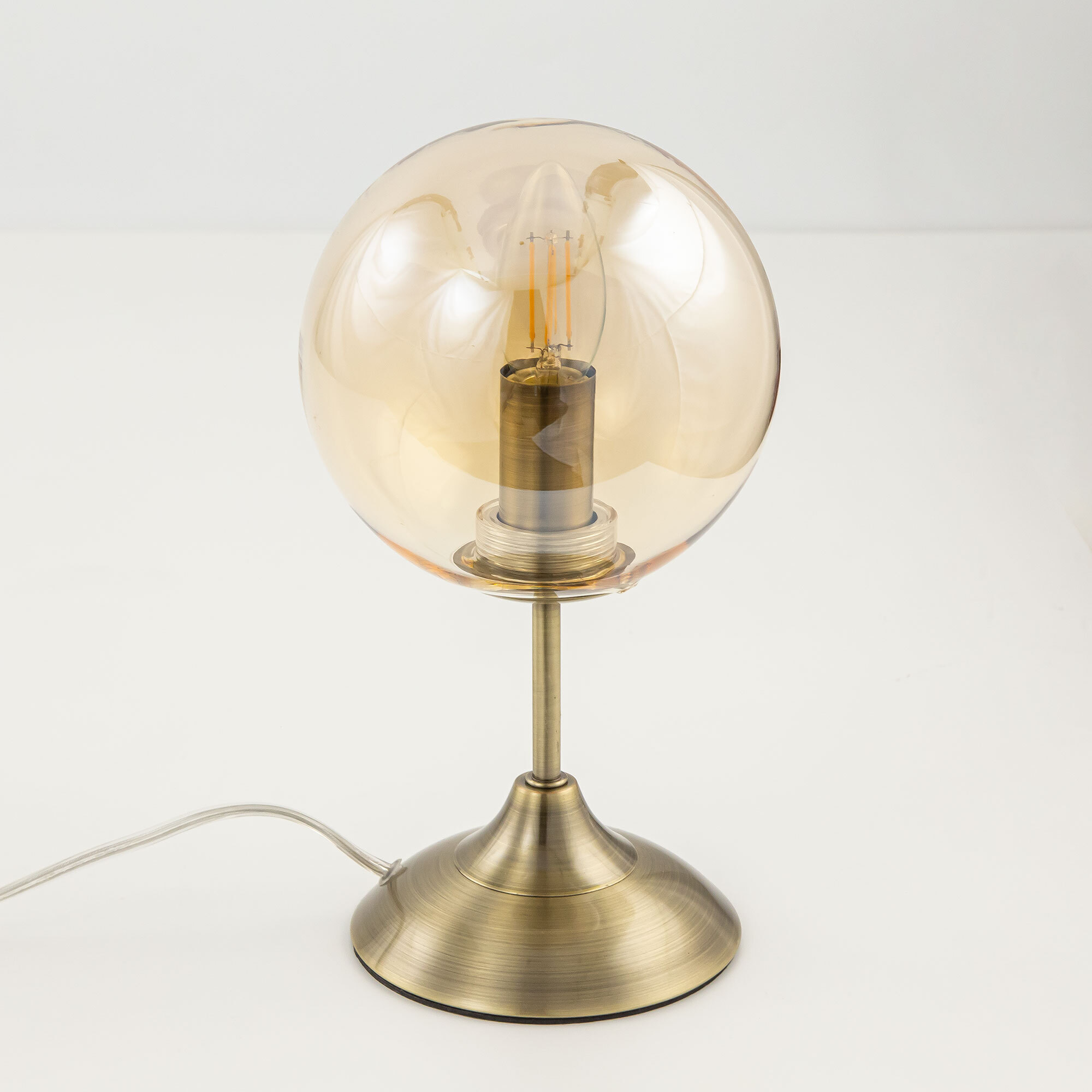 Настольная лампа CL102813 с одним плафоном. Корпус модели изготовлен из металла, цвет бронза. Плафон стеклянный в форме шара, прозрачный цвета шампань. Сетевой провод прозрачный длиной 1,7 метра, на нем расположен выключатель на расстоянии 20 см от основания. В этом настольном светильнике используется лампа в форме свечи с цоколем Е14, максимальная мощность лампы накаливания 40 Вт. Площадь освещения около 2,5 метров. Светодиодные лампы можно использовать большей мощности. Однорожковая настольная лампа Томми CL102813 отлично подойдет для помещений, оформленных в современном стиле.Citilux CL102 TOMMY: Вдохновение в каждом луче.