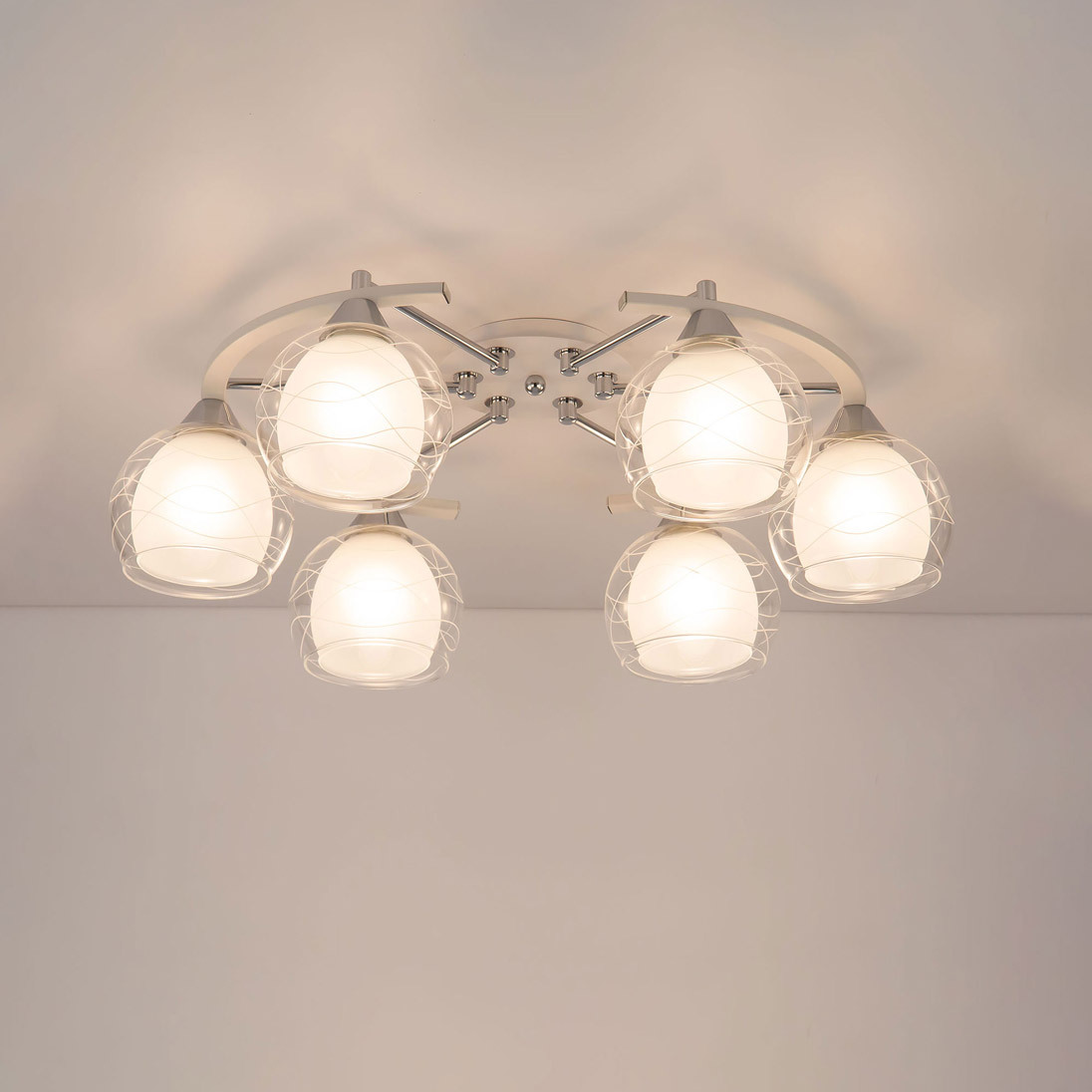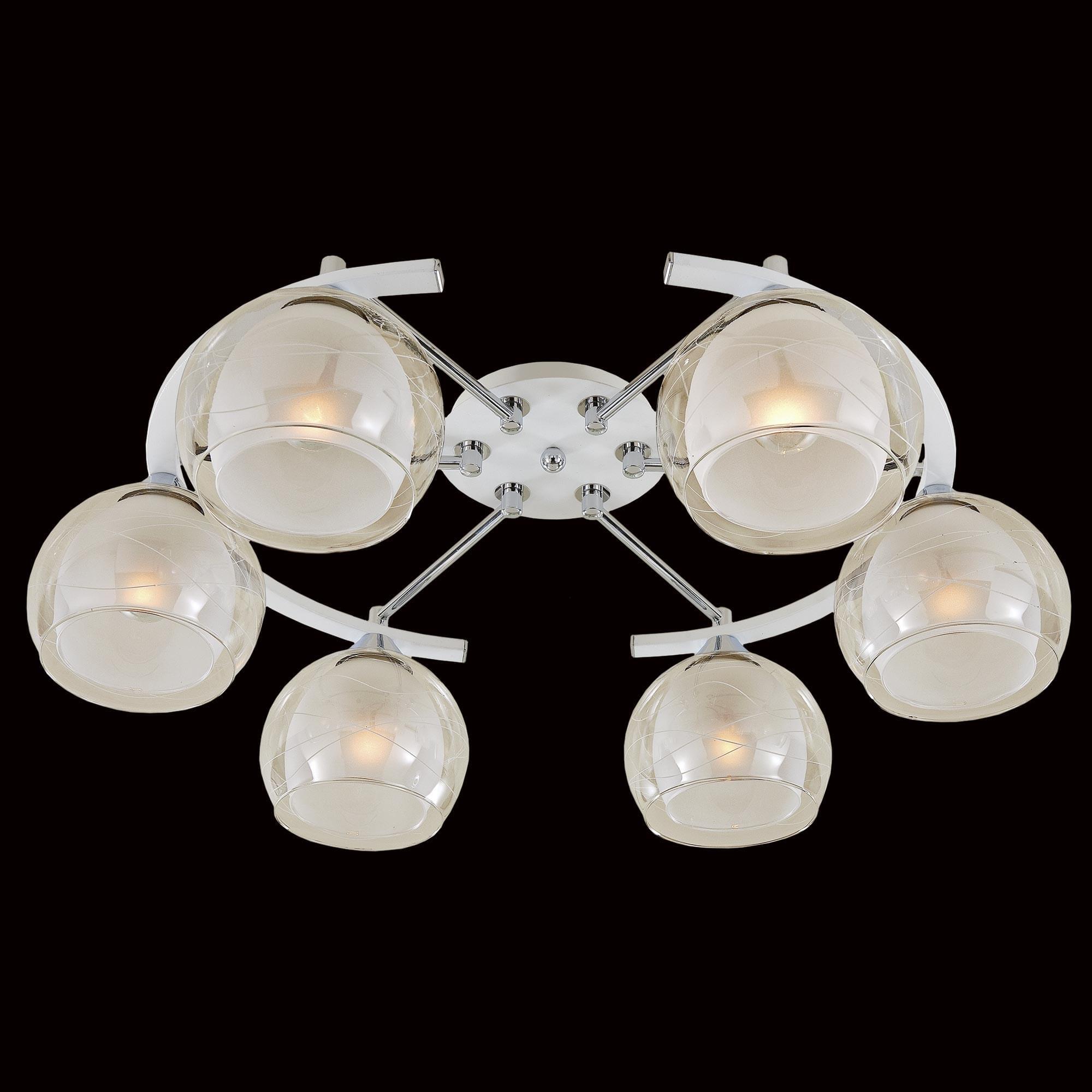 Потолочные светильники серии «Буги» выделяется интересным дизайном в стиле модерн. Люстры сделаны из легкого метала и интересными стеклянными двойными плафонами. Внешняя сторона плафона прозрачная с дизайнерским узором, а внутренняя полупрозрачная. За счёт полупрозрачного плафона свет в помещении получается очень яркий, равномерно рассеянный, но вместе с тем мягкий, приятный для зрения. Арматура модели на шесть рожков с завода в упаковке собрана и скоммутирована на двойной выключатель. Деление осуществлено 4х2, с одной клавиши будет включаться четыре плафона, со второй ещё два. Подключение произведено через один плафон. Люстры производятся в двух цветах: белый плюс хром, идеальное решение для нежных и светлых интерьеров, и алюминий плюс хром, который лучше сочетается с современными дизайнами. Арматура слегка вытянута, не идеальный круг. Такое конструктивное решение позволяет достигать хороших показателей освещённости по углам комнаты. Крепятся люстры под потолком тем самым они не занимают место и прекрасно подходят к помещениям с небольшой высотой потолка. Патроны выполнены из термостойких материалов, выдерживают лампы накаливания до 75 ватт включительно, а энергосберегающие, или светодиодные лампы можно использовать любой яркости, что позволит вам осветить большие площади. Площадь освещения моделей на четыре рожка до 21 квадратного метра.