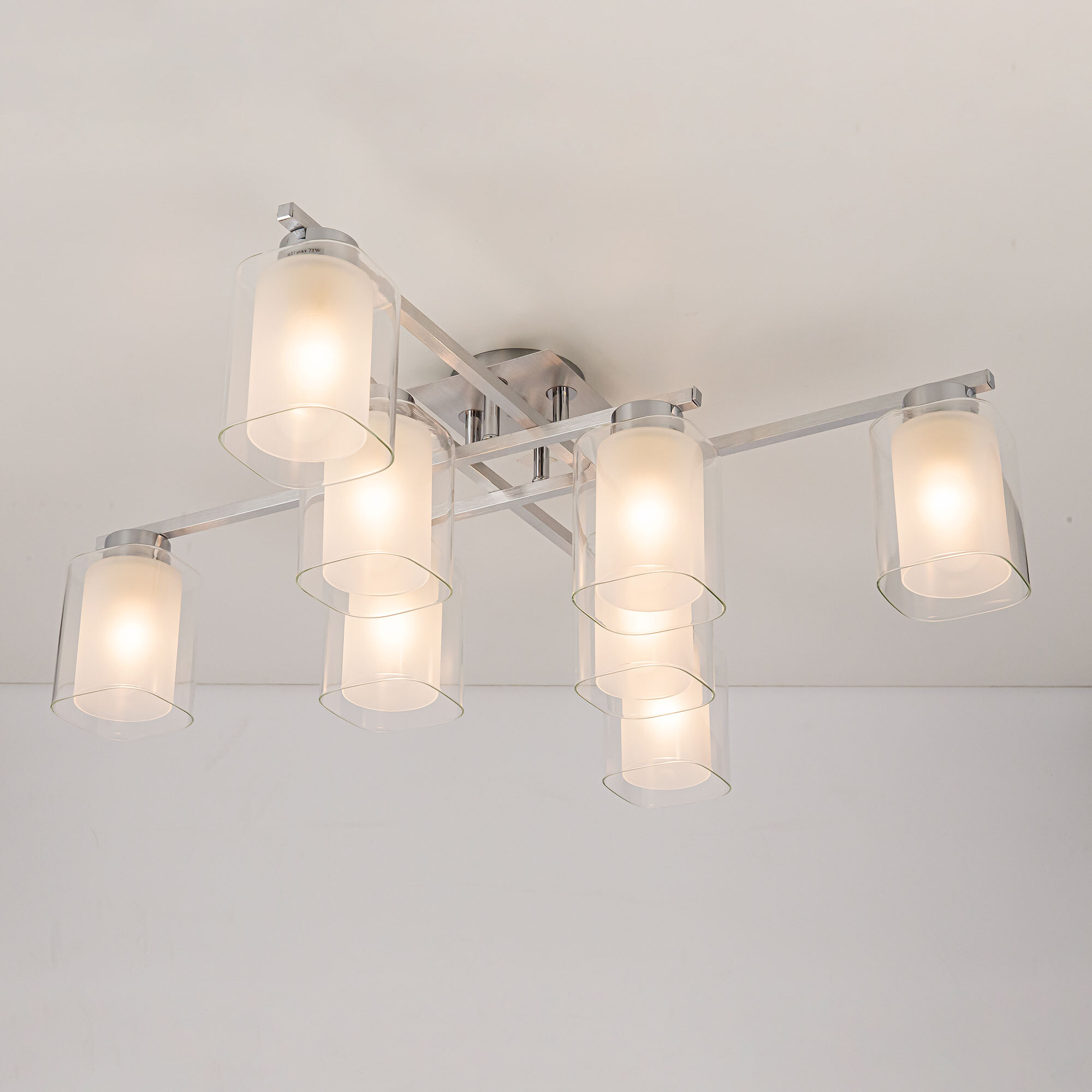 Люстра потолочная Citilux Диез CL111180 на восемь плафонов. Корпус металлический, цвет алюминий, с декоративными хромированными элементами. Плафоны стеклянные, двойные. Внешний плафон прозрачный, в сечении имеет форму квадрата. Внутренний плафон полуматовый цилиндрической формы. Модель можно использовать как с одноклавишным, так и с двухклавишным выключателем. В светильнике используются 8 ламп с цоколем Е27 и максимальной мощностью для ламп накаливания 75 Вт. Суммарная мощность 600Вт. Светодиодные лампы можно использовать более яркие. Площадь освещения около 24 кв. метров. Тип крепления люстры к потолку – планка, крепеж в комплекте. Модель отлично подойдет для освещения гостиной, зала или спальни, оформленных в современном стиле.Citilux CL111 DIEZ: Вдохновение в каждом луче.