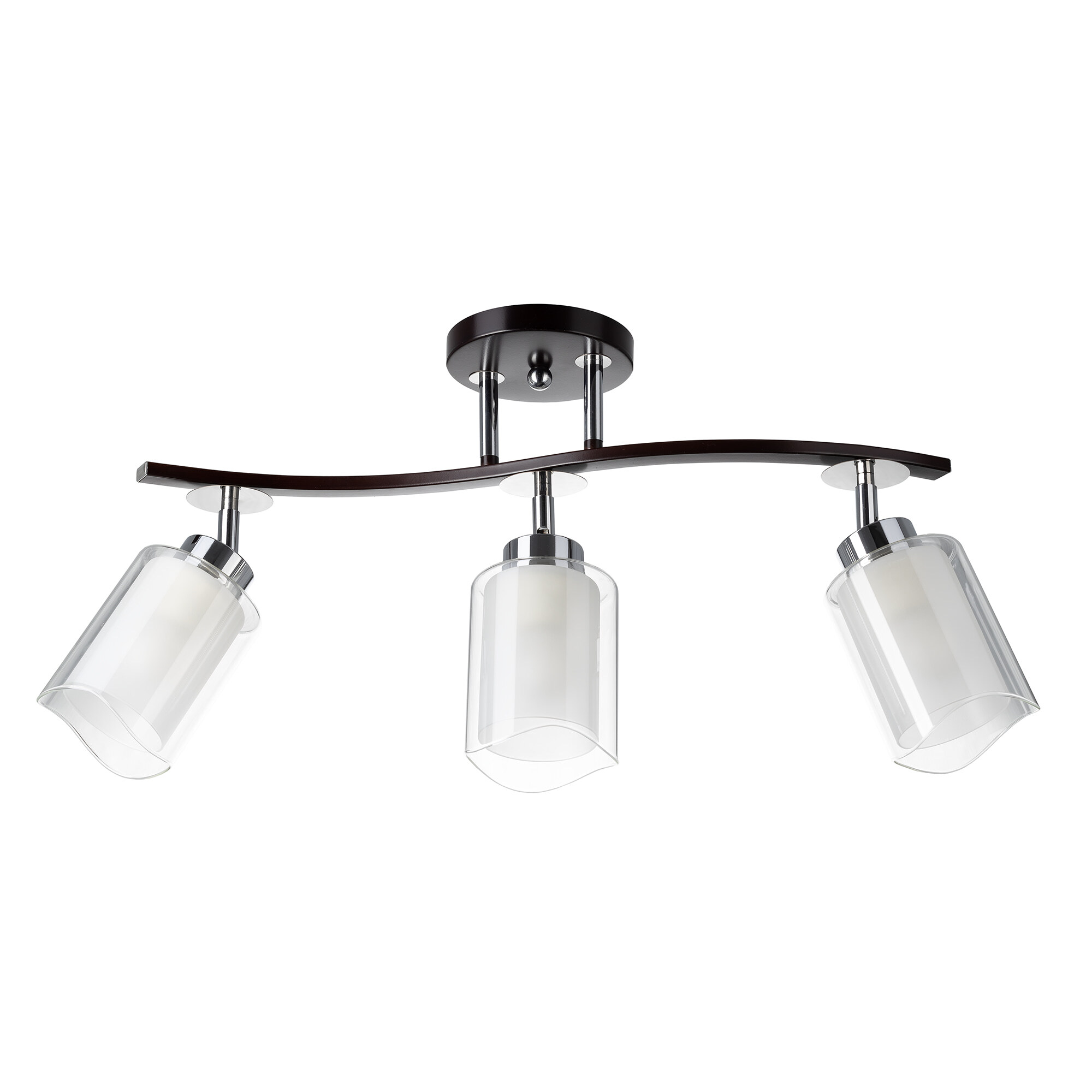 Потолочный светильник коллекции Фортуна на 3 рожка выполнен в цвете венге с декоративными хромовыми элементами. Плафоны оснащены поворотным механизмом, что позволяет зафиксировать их в любом положении. Это технологическое решение даёт возможность изменить дизайн светильника, а также оптимально распределить освещение в помещении. Цоколь патрона Е27 с ограничением по мощности для ламп накаливания до 75 ватт, светодиодные лампочки можно ставить любой мощности. Плафоны выполнены из стекла, наружное прозрачное, а внутреннее белое матовое. Каркас люстры сделан из металла. Площадь освещения до 11 квадратных метров. Тип крепежа: потолочный. Размер: Длинна: 56,5 см, Высота: 25 – 33 см, Ширина: 13 см.
