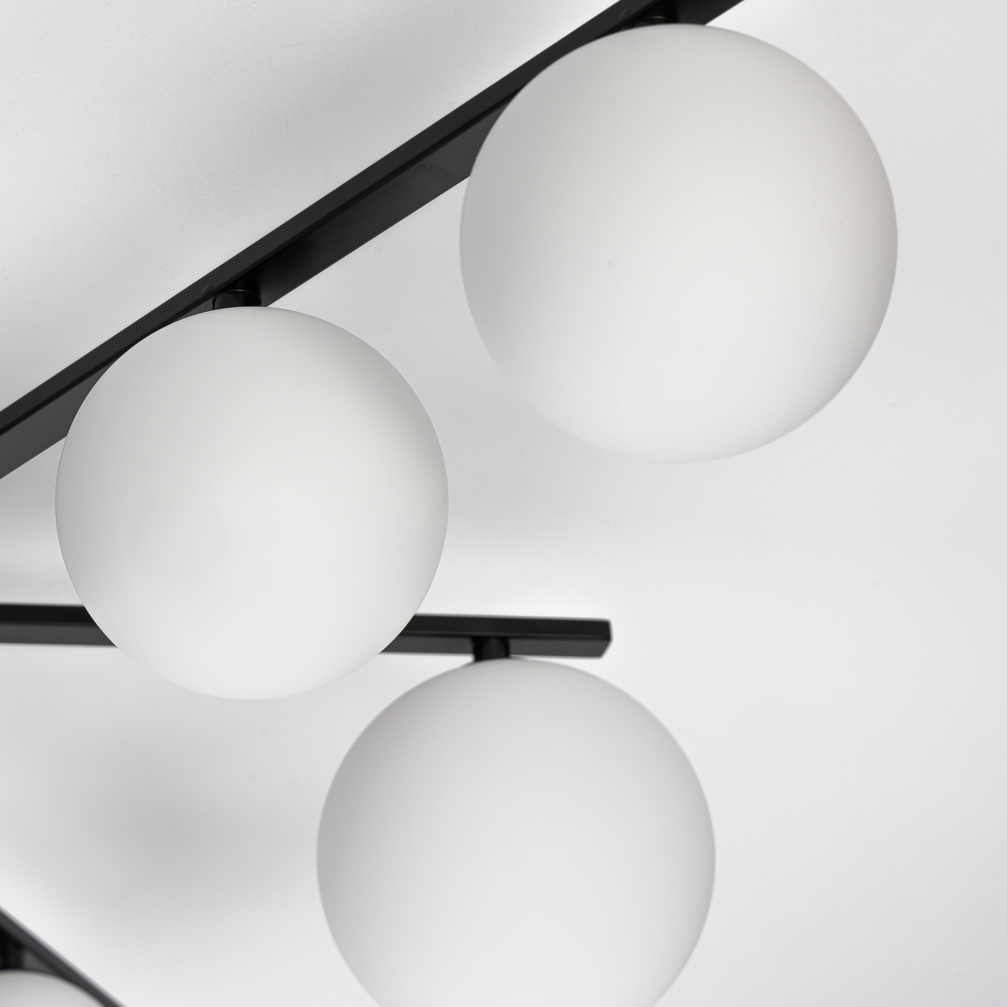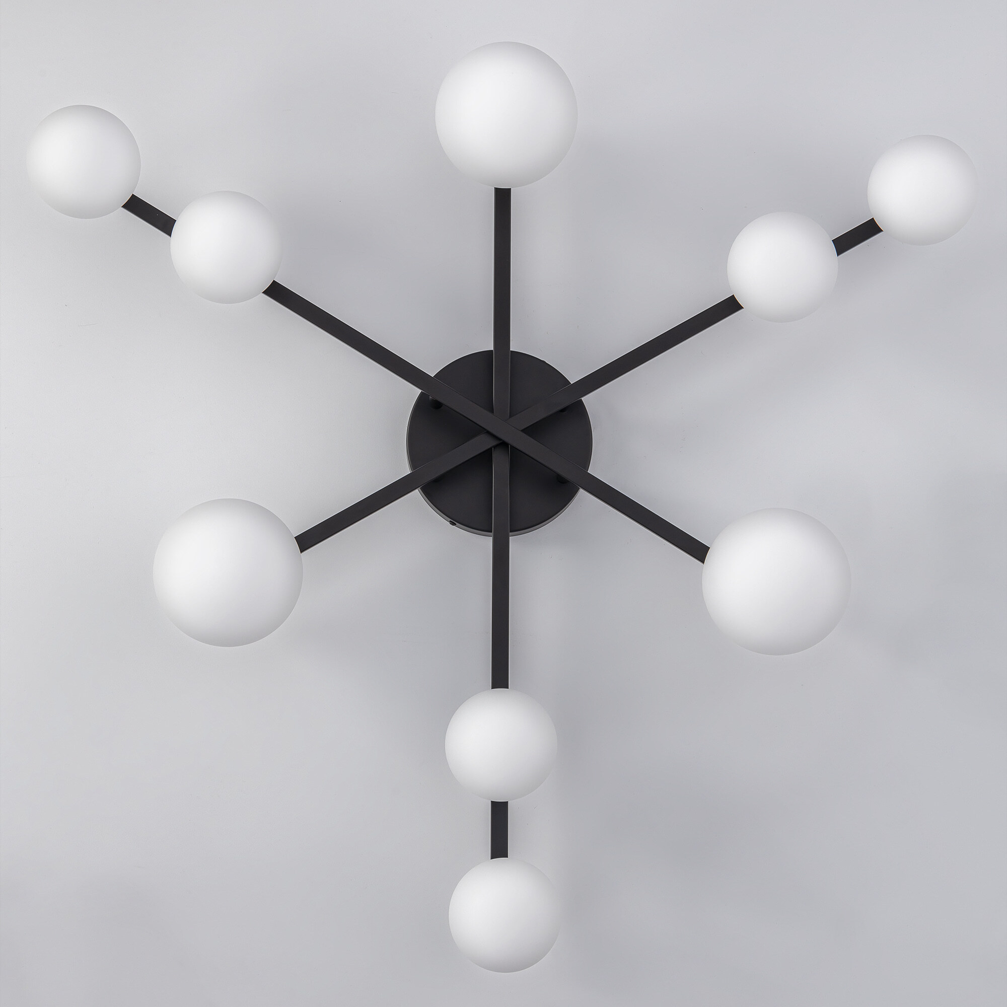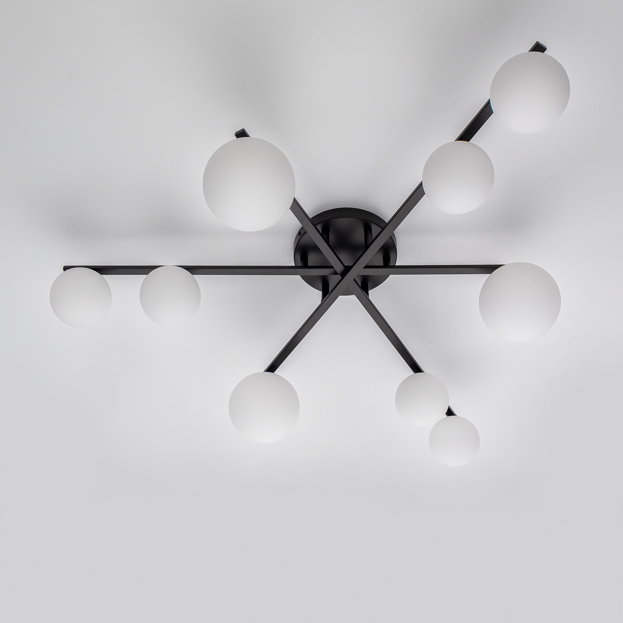 Элегантный металлический корпус чёрного цвета придаёт люстре утончённую изысканность, а плафоны из матового стекла в форме шаров создают мягкое и равномерное освещение, подчёркивая гармонию форм и материалов. Длинные рожки-штанги с плафонами двух размеров (10 и 13см) обеспечивают оптимальное распределение света, делая люстру не только красивой, но и практичной.