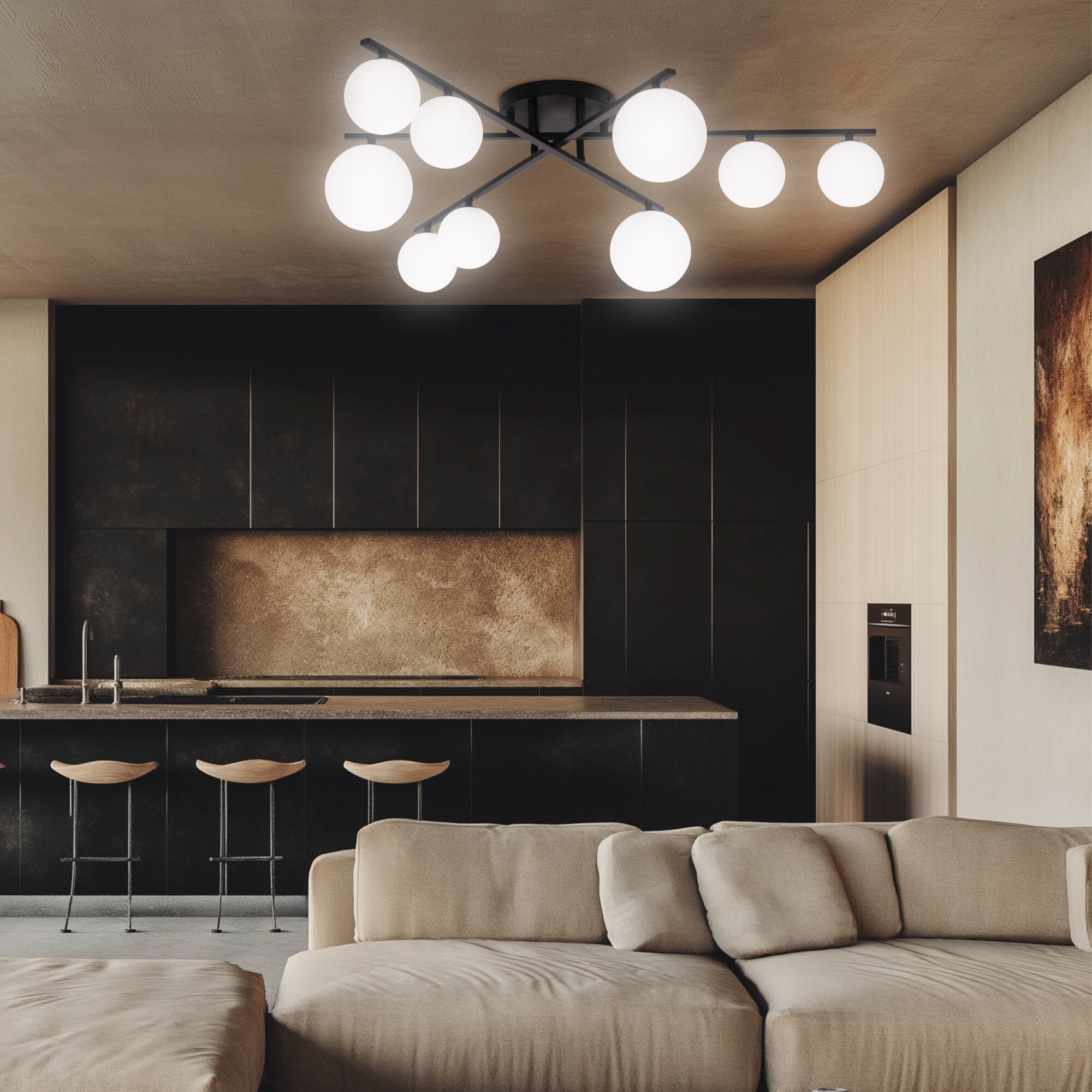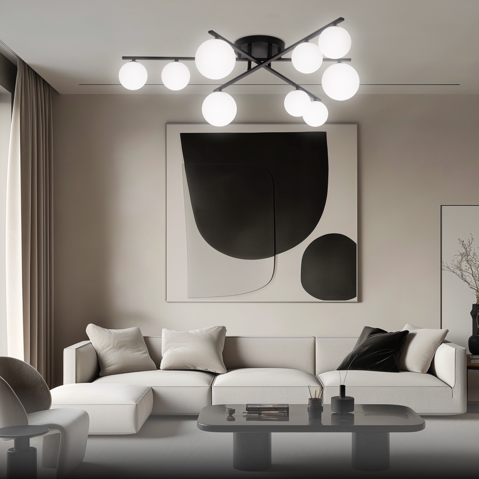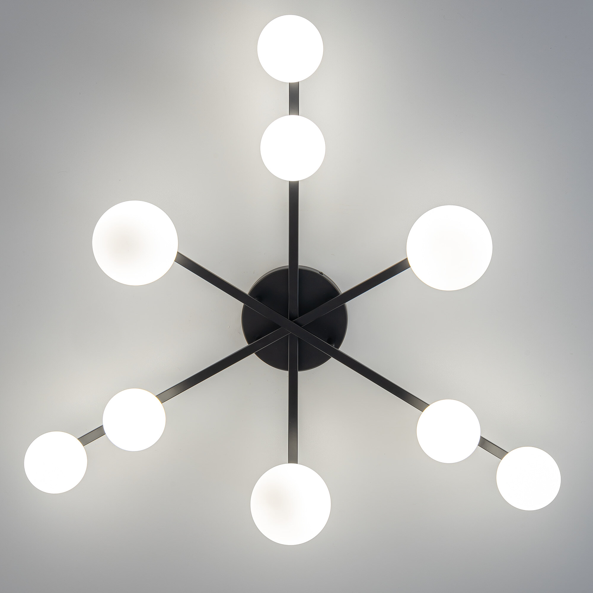 Элегантный металлический корпус чёрного цвета придаёт люстре утончённую изысканность, а плафоны из матового стекла в форме шаров создают мягкое и равномерное освещение, подчёркивая гармонию форм и материалов. Длинные рожки-штанги с плафонами двух размеров (10 и 13см) обеспечивают оптимальное распределение света, делая люстру не только красивой, но и практичной.