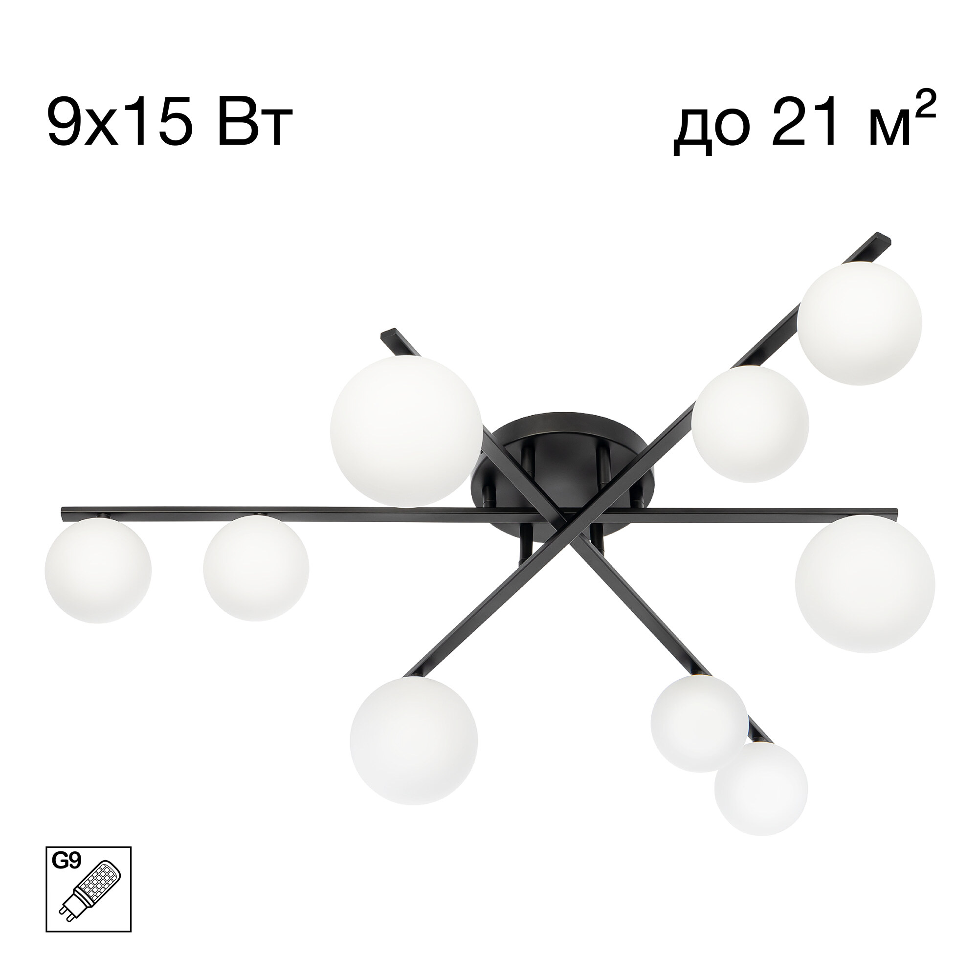 В изделии используются 9 ламп с цоколем G9 максимальной мощностью 15Вт (в комплект не входят). Диаметр ламп не более 18мм. Возможность подключения к одноклавишному или двухклавишному выключателю позволяет регулировать интенсивность освещения, создавая нужную атмосферу в помещении.