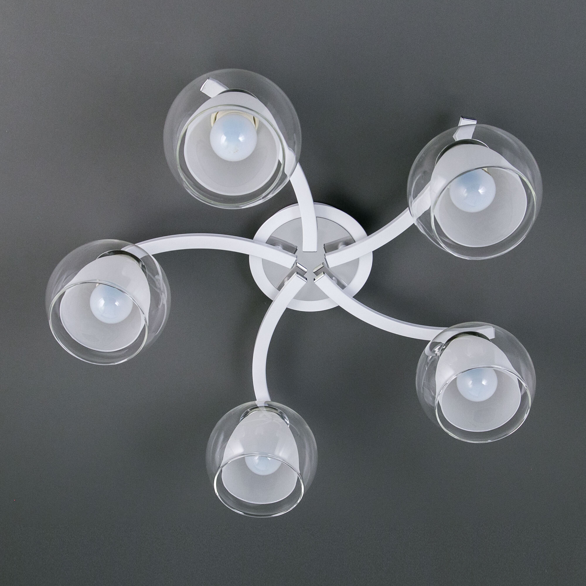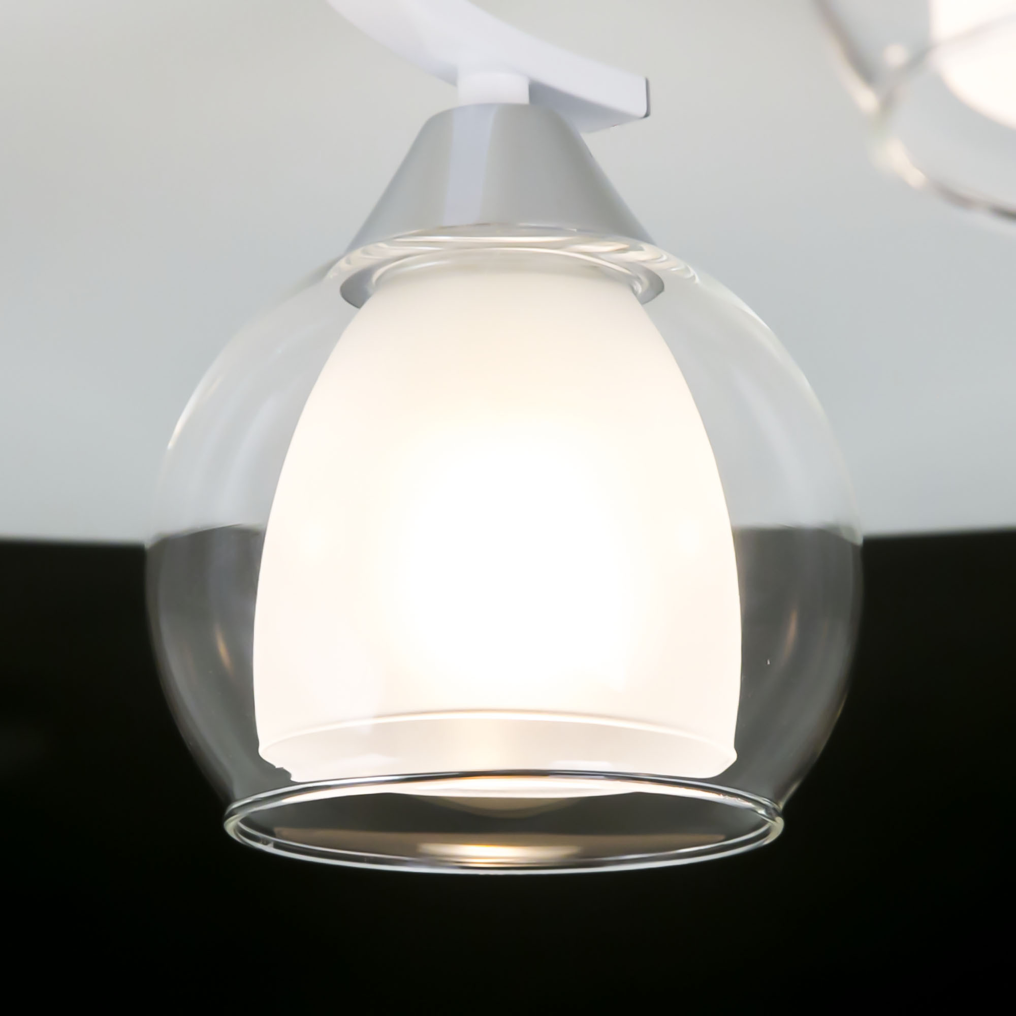 Главной изюминкой этой люстры являются оригинальные плафоны, имеющие форму усеченного шара. Они изготовлены из двух типов стекла: внутренняя часть плафона полуматовая, а внешняя - прозрачная. Такое сочетание позволяет создать приятное рассеянное освещение, сохраняя при этом высокую светопроницаемость.