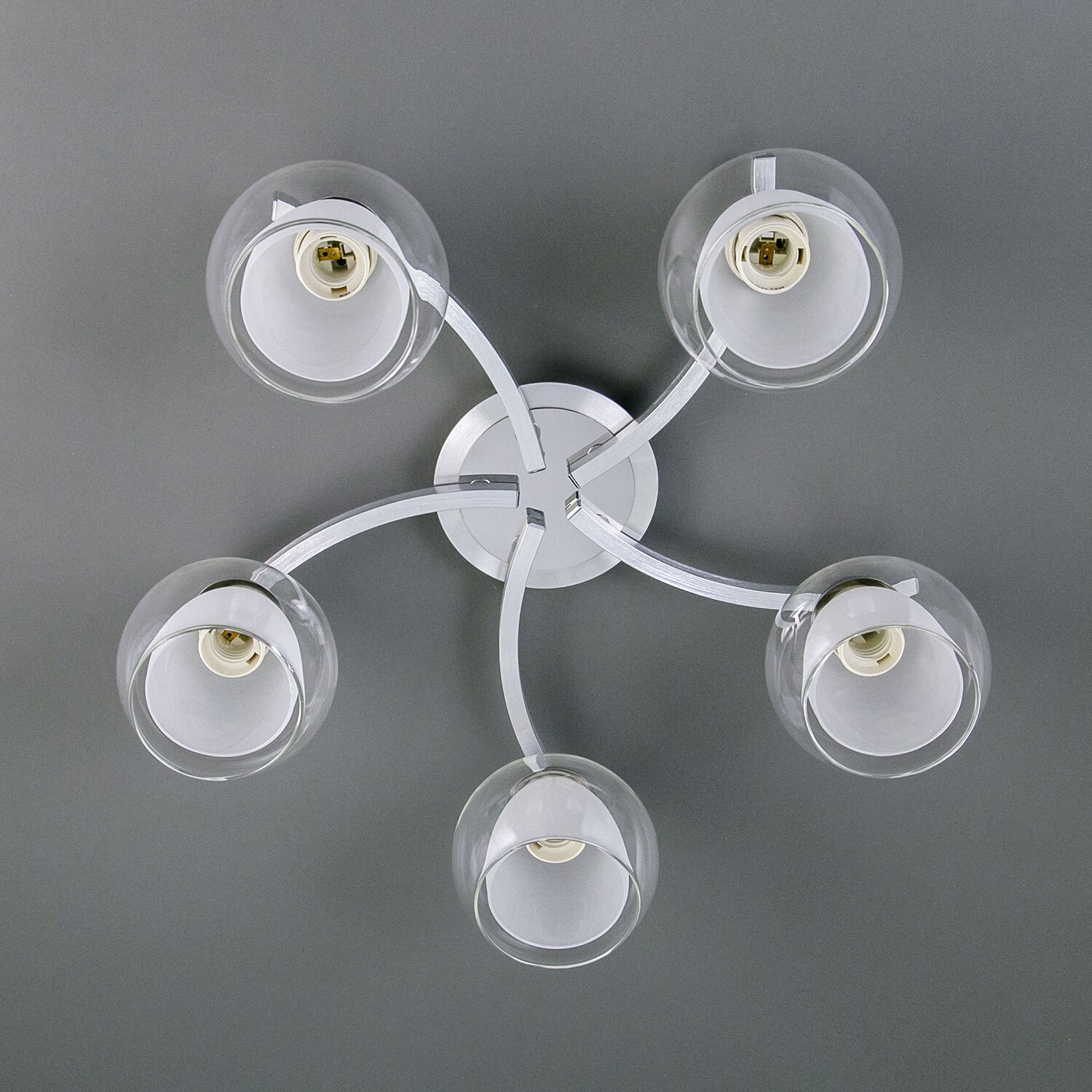 Главной изюминкой этой люстры являются оригинальные плафоны, имеющие форму усеченного шара. Они изготовлены из двух типов стекла: внутренняя часть плафона полуматовая, а внешняя - прозрачная. Такое сочетание позволяет создать приятное рассеянное освещение, сохраняя при этом высокую светопроницаемость.