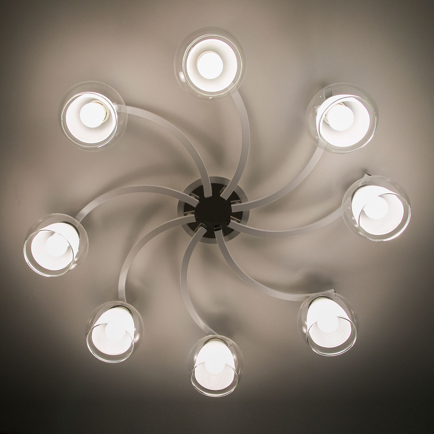 Главной изюминкой этой люстры являются оригинальные плафоны, имеющие форму усеченного шара. Они изготовлены из двух типов стекла: внутренняя часть плафона полуматовая, а внешняя - прозрачная. Такое сочетание позволяет создать приятное рассеянное освещение, сохраняя при этом высокую светопроницаемость.