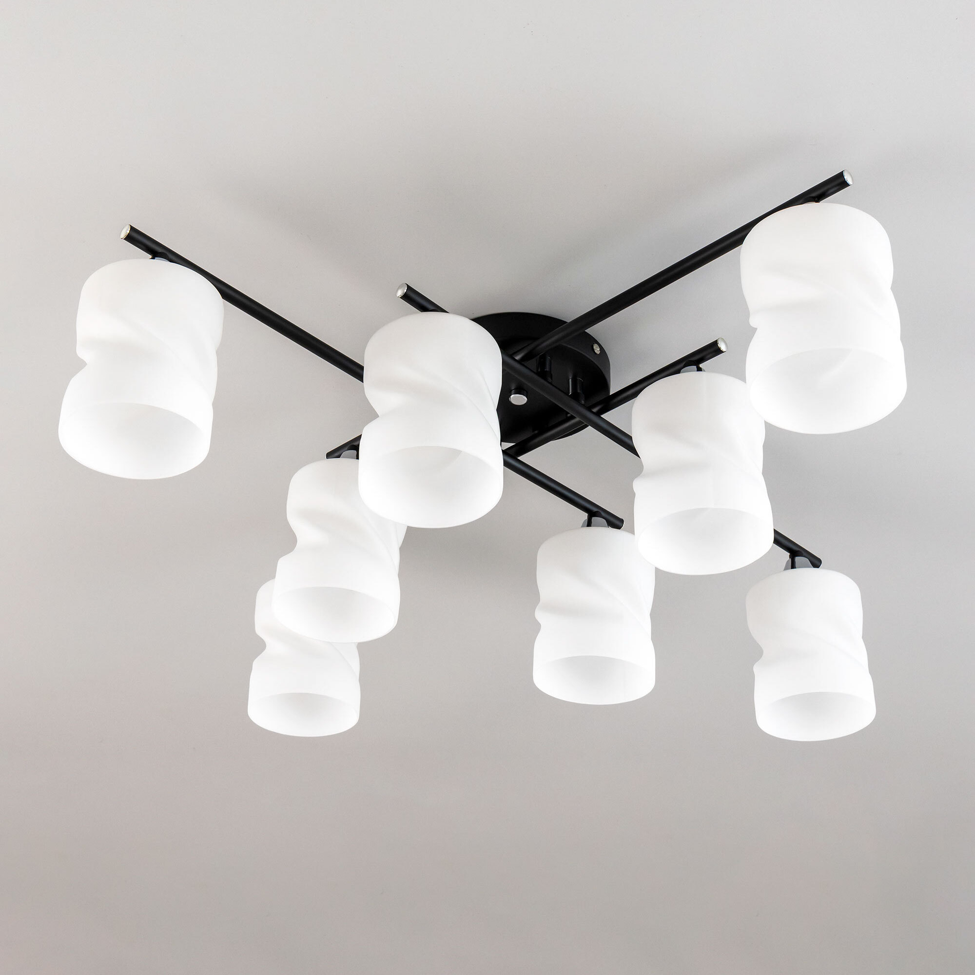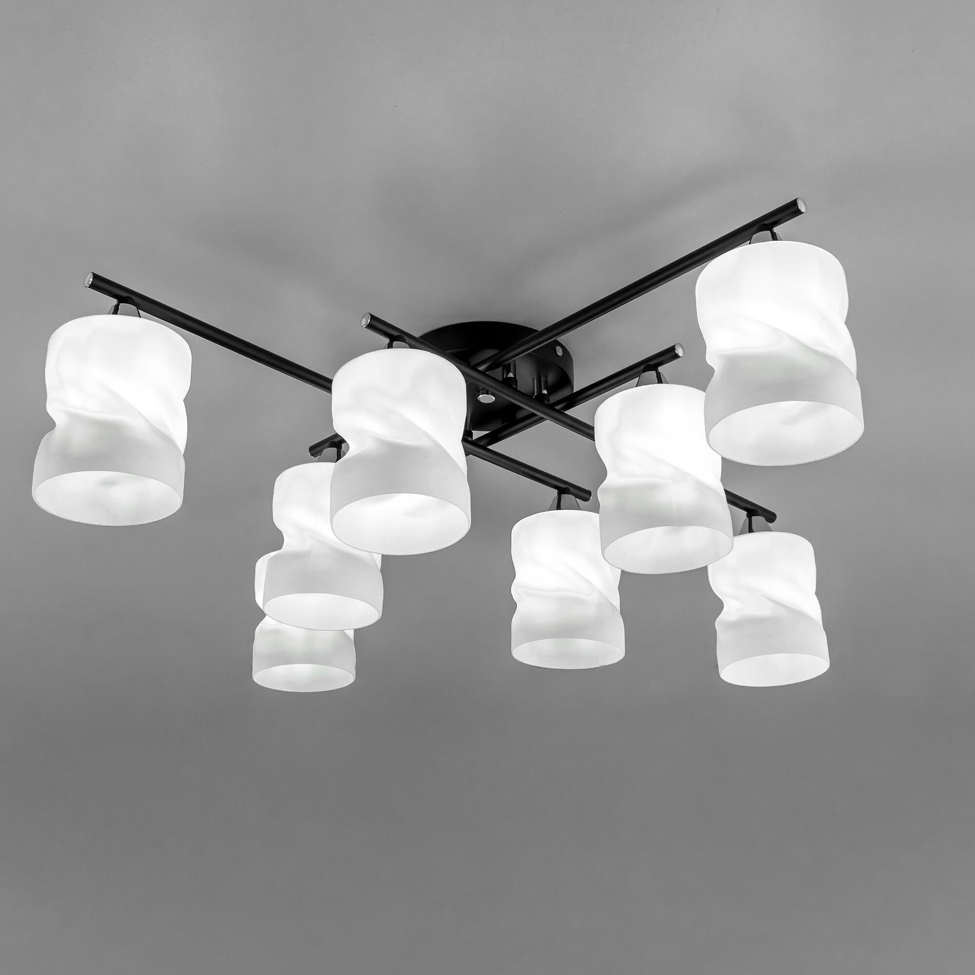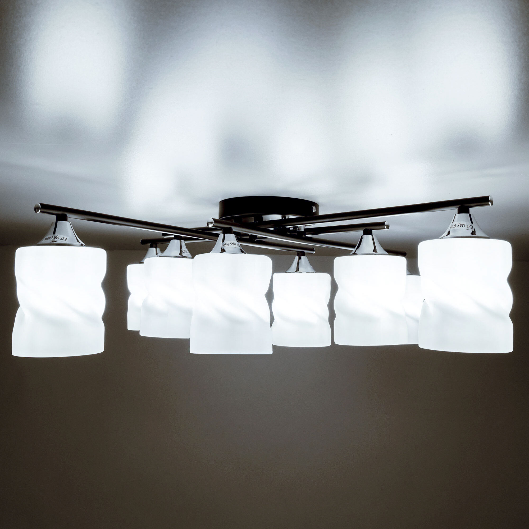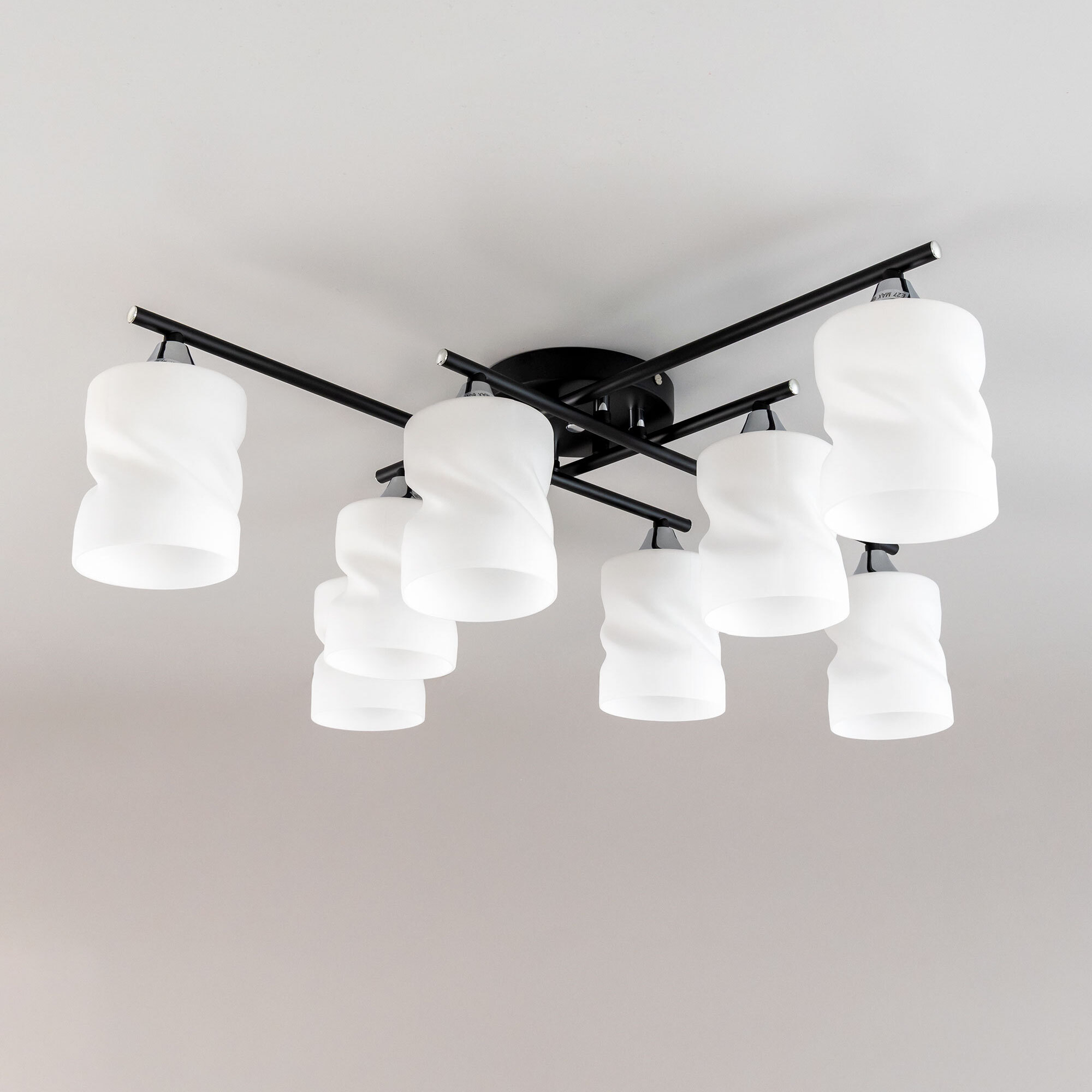 Стильная потолочная люстра Citilux Нильс CL132185 для современных интерьеров. Корпус светильника металлический, с рожками штангами, цвет чёрный с декоративными хромированными элементами. Плафоны стеклянные, белые матовые, оригинальной формы. Люстру можно скоммутировать для работы как с одноклавишным, так и с двухклавишным выключателем. В изделии используются лампы с цоколем Е27, максимальной мощностью для ламп накаливания 60Вт. Рекомендуем применять светодиодные лампы. Подходит для всех типов потолков, в том числе натяжных, тип крепления-планка. Размеры: 74х74см, высота 21см. Прекрасный вариант для яркого освещения помещений с низкими потолками, площадью около 20м².Citilux CL132 NILS: Вдохновение в каждом луче.