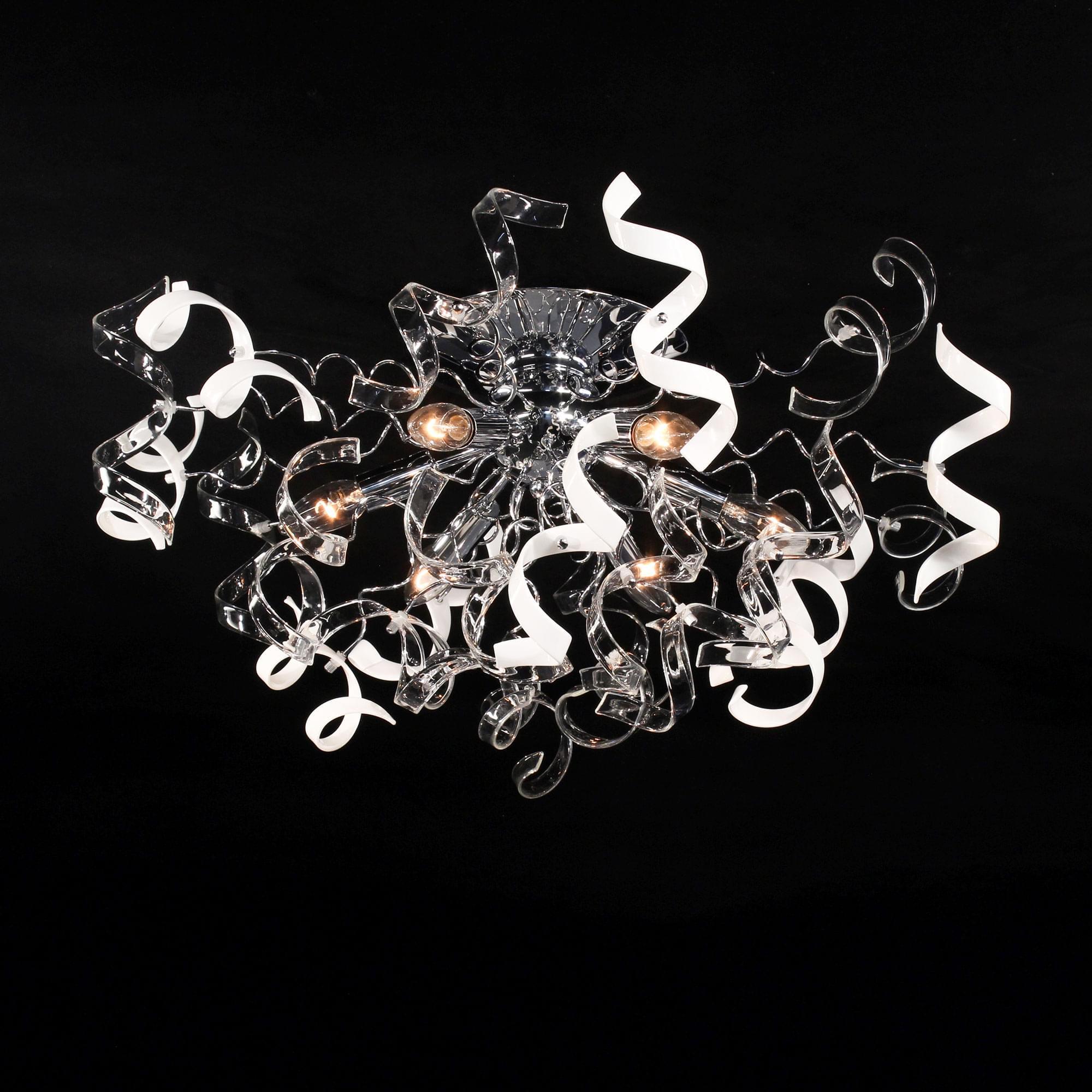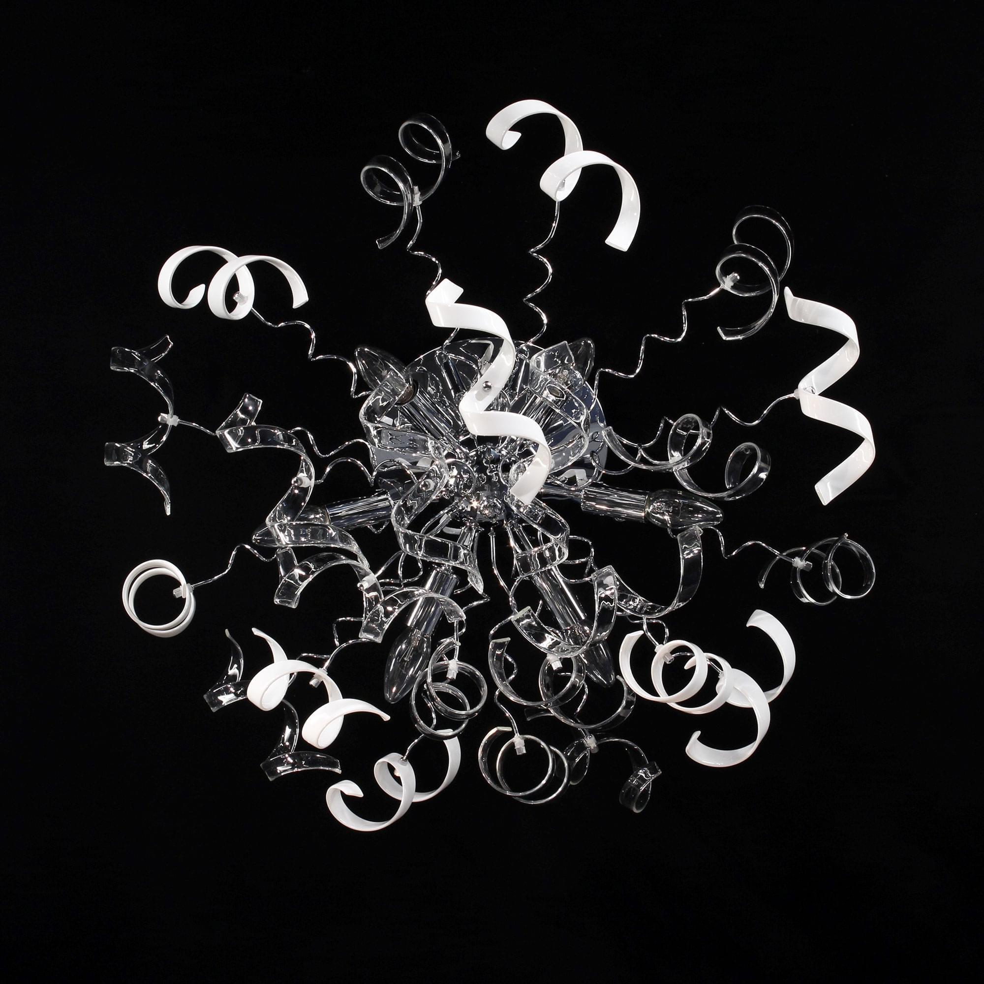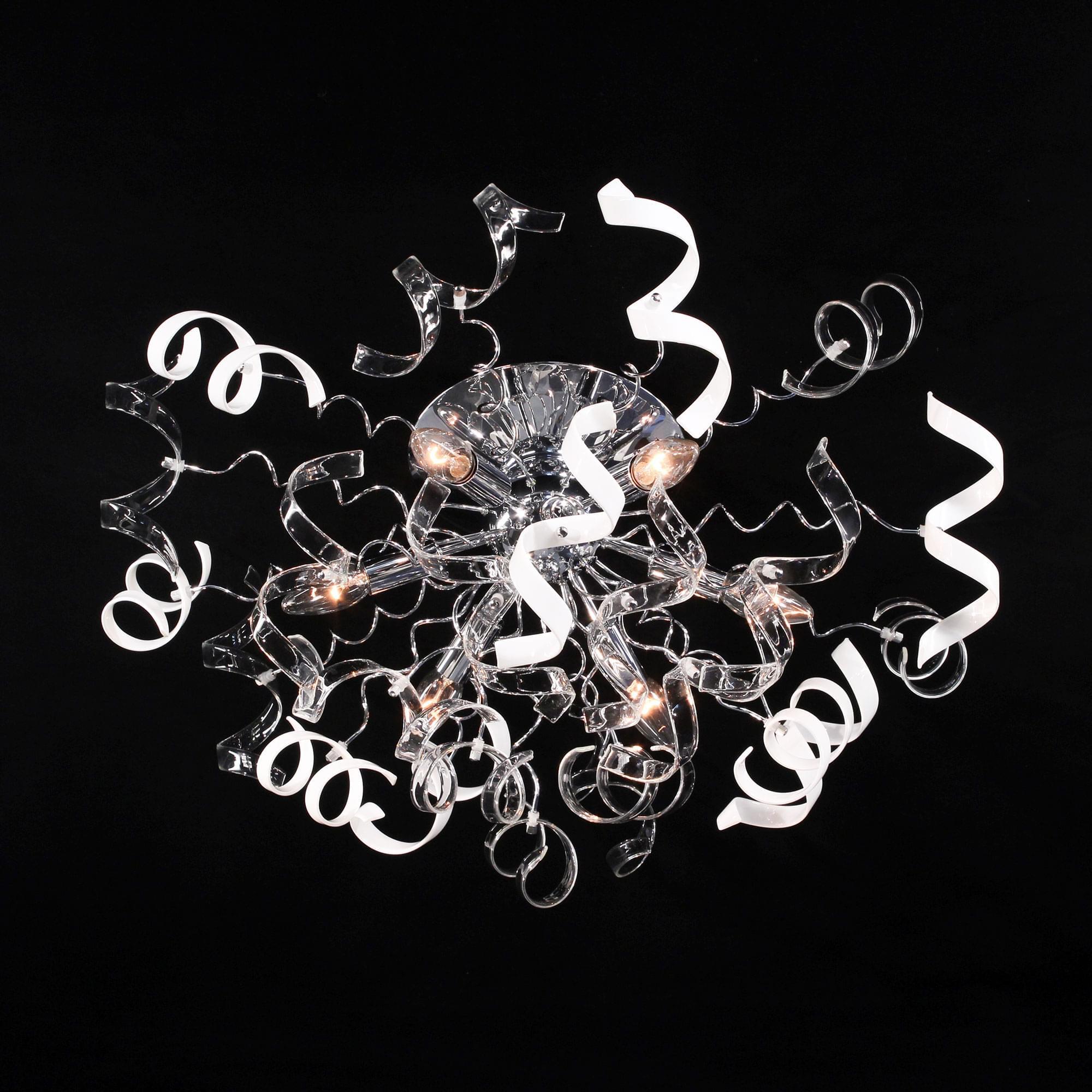 Рандом – говорящее название коллекции потолочных люстр от Ситилюкс, именно такое название самым подходящим образом характеризует неординарность линейки, и неограниченные возможности фантазии в области дизайна. Множество декоративных стеклянных элементов, в виде игривых завитушек заставят свет в помещении искриться, и переливаться самыми невообразимыми оттенками. Коллекция выполнена в трёх цветовых гаммах – прозрачный, прозрачный + белый, прозрачный +янтарный. Помимо этого серия представлена нами в двух типоразмерах – на 6 и на 9 ламп, что значительно облегчит сделать оптимальный выбор, в зависимости от площади вашего помещения. Шестирожковая модель, украшенная комбинацией из прозрачных деталей и стеклянных элементов белого, глянцевого цвета, сможет волшебным образом преобразить ваше пространство, и при этом полноценно осветит комнаты площадью 11-17 квадратных метров. Хромированный корпус светильника выполне из металла с надёжным гальваническим покрытием, защищающим изделие от коррозии. Высота конструкции составляет всего 30 сантиметров, тем самым делая её подходящей для помещений с потолками любой высоты.