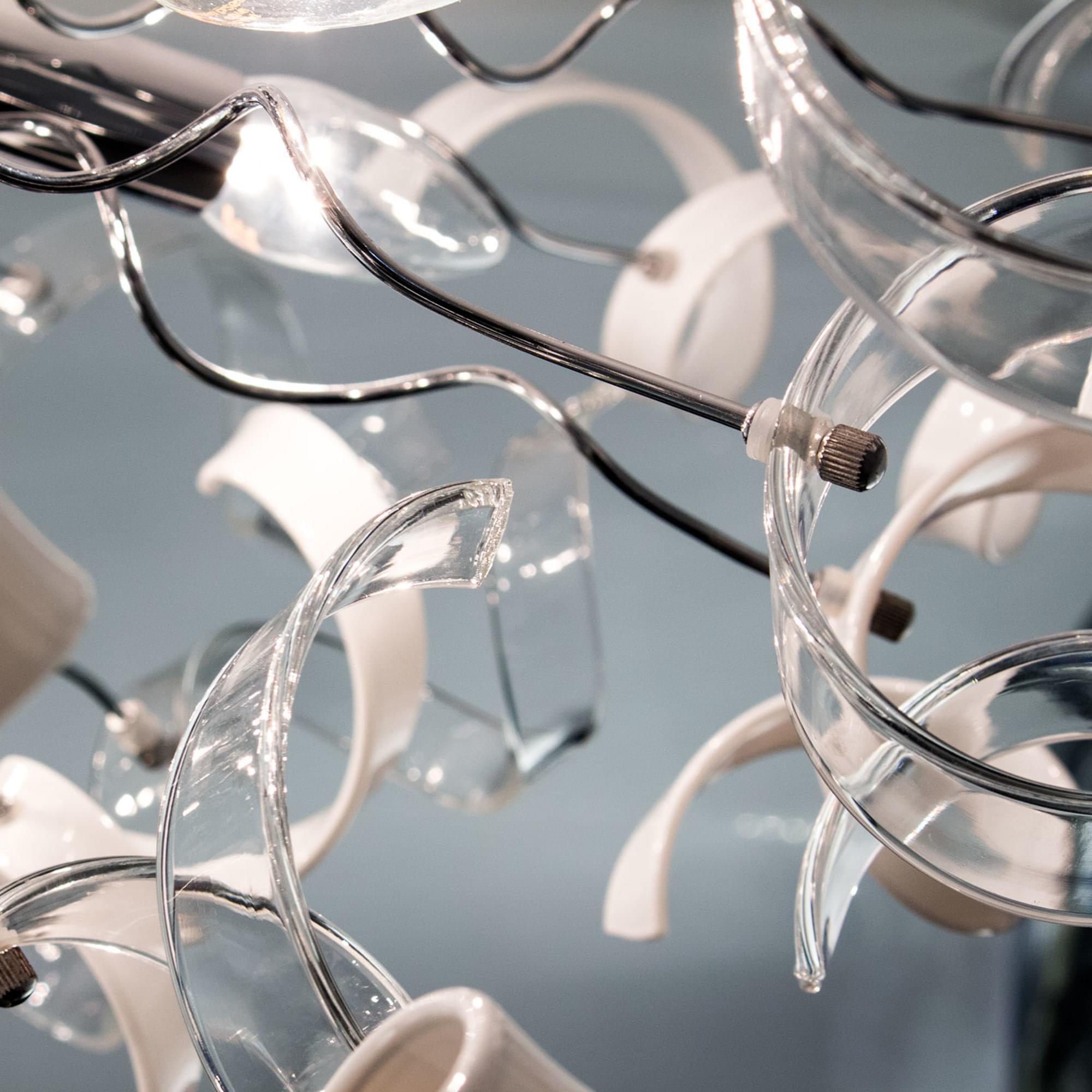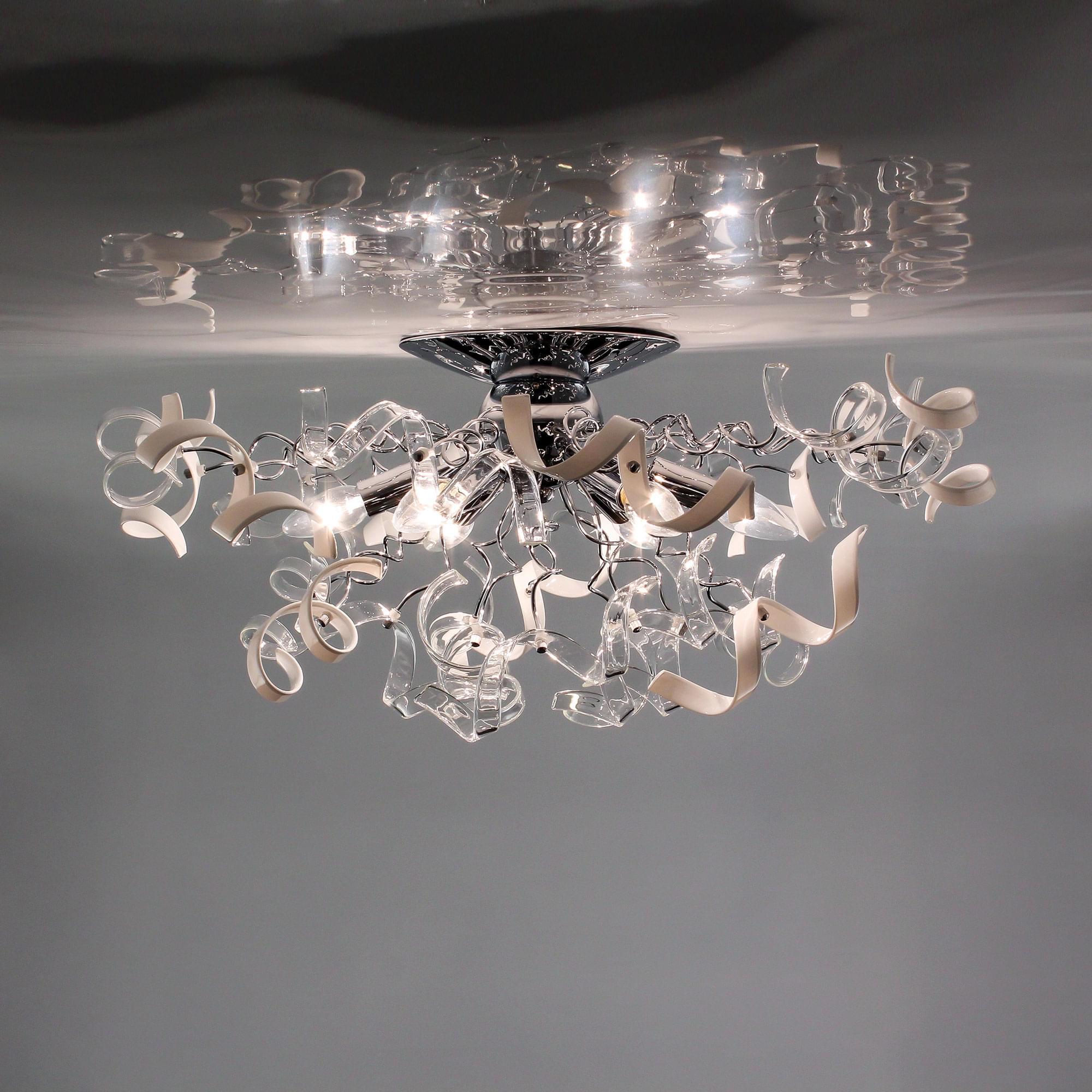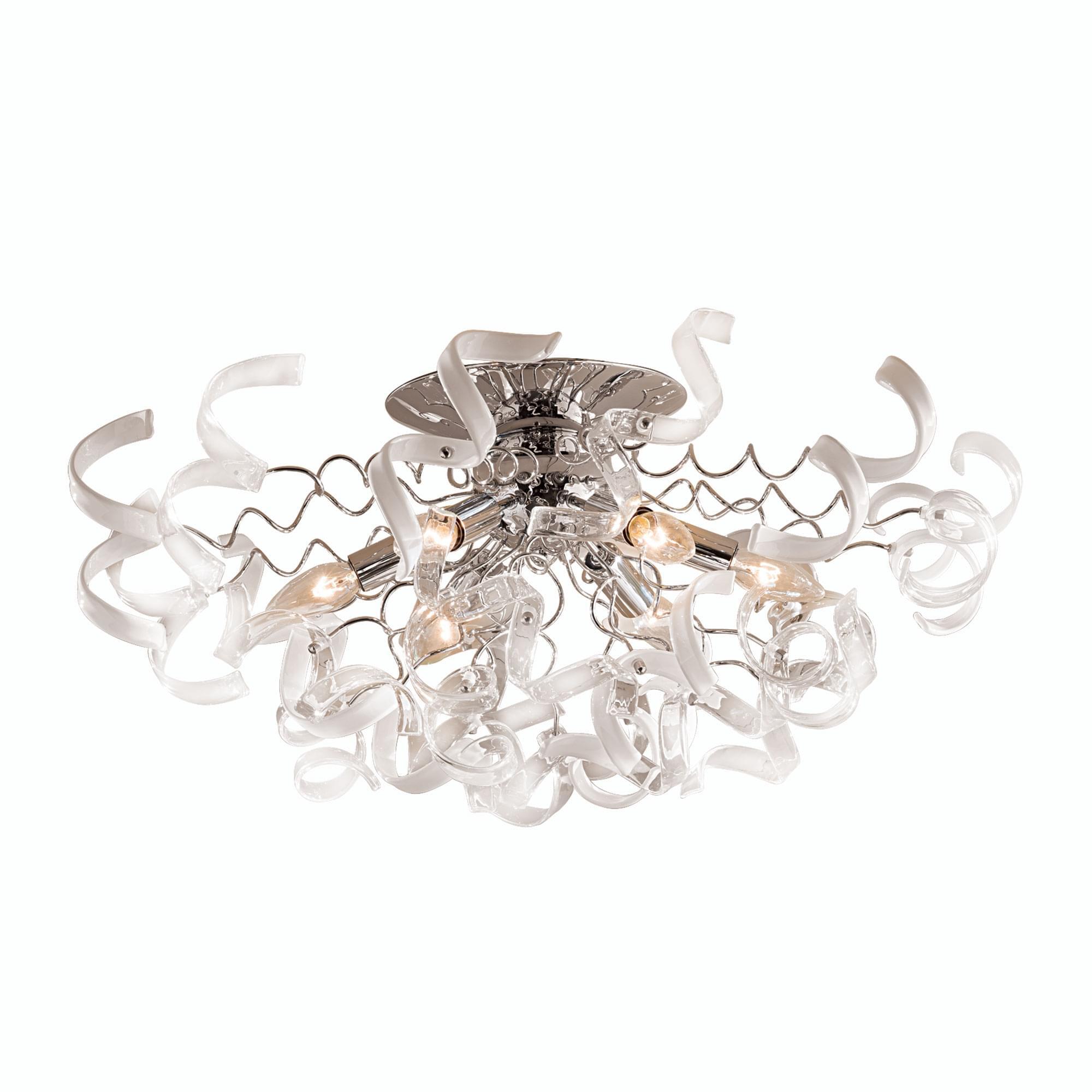 Рандом – говорящее название коллекции потолочных люстр от Ситилюкс, именно такое название самым подходящим образом характеризует неординарность линейки, и неограниченные возможности фантазии в области дизайна. Множество декоративных стеклянных элементов, в виде игривых завитушек заставят свет в помещении искриться, и переливаться самыми невообразимыми оттенками. Коллекция выполнена в трёх цветовых гаммах – прозрачный, прозрачный + белый, прозрачный +янтарный. Помимо этого серия представлена нами в двух типоразмерах – на 6 и на 9 ламп, что значительно облегчит сделать оптимальный выбор, в зависимости от площади вашего помещения. Шестирожковая модель, украшенная комбинацией из прозрачных деталей и стеклянных элементов белого, глянцевого цвета, сможет волшебным образом преобразить ваше пространство, и при этом полноценно осветит комнаты площадью 11-17 квадратных метров. Хромированный корпус светильника выполне из металла с надёжным гальваническим покрытием, защищающим изделие от коррозии. Высота конструкции составляет всего 30 сантиметров, тем самым делая её подходящей для помещений с потолками любой высоты.
